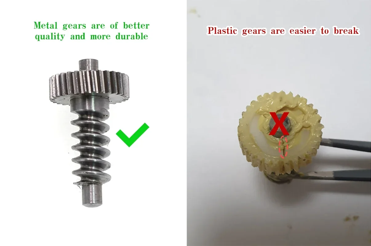 - Uses mixed plastic and metal construction for increased durability over stock plastic gears