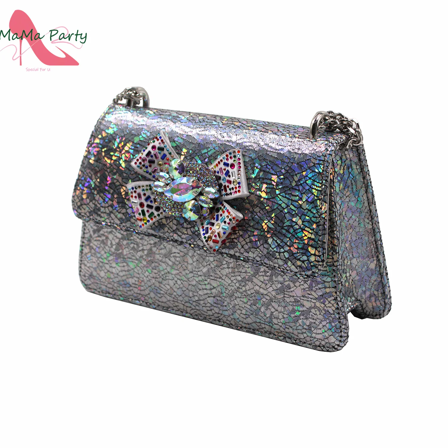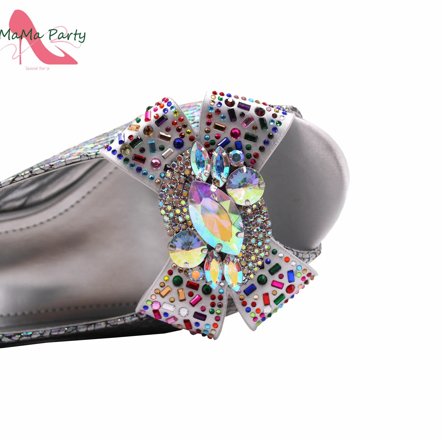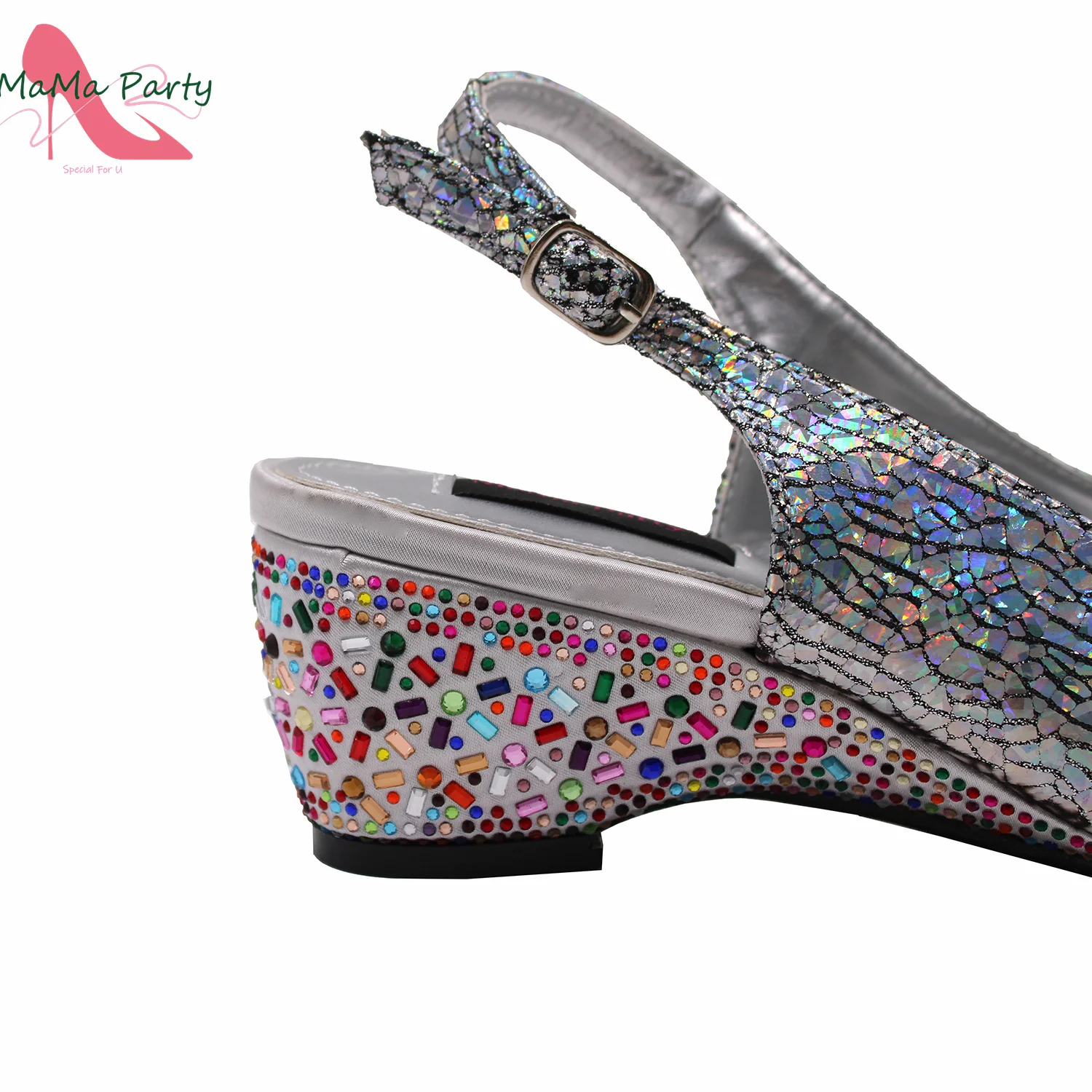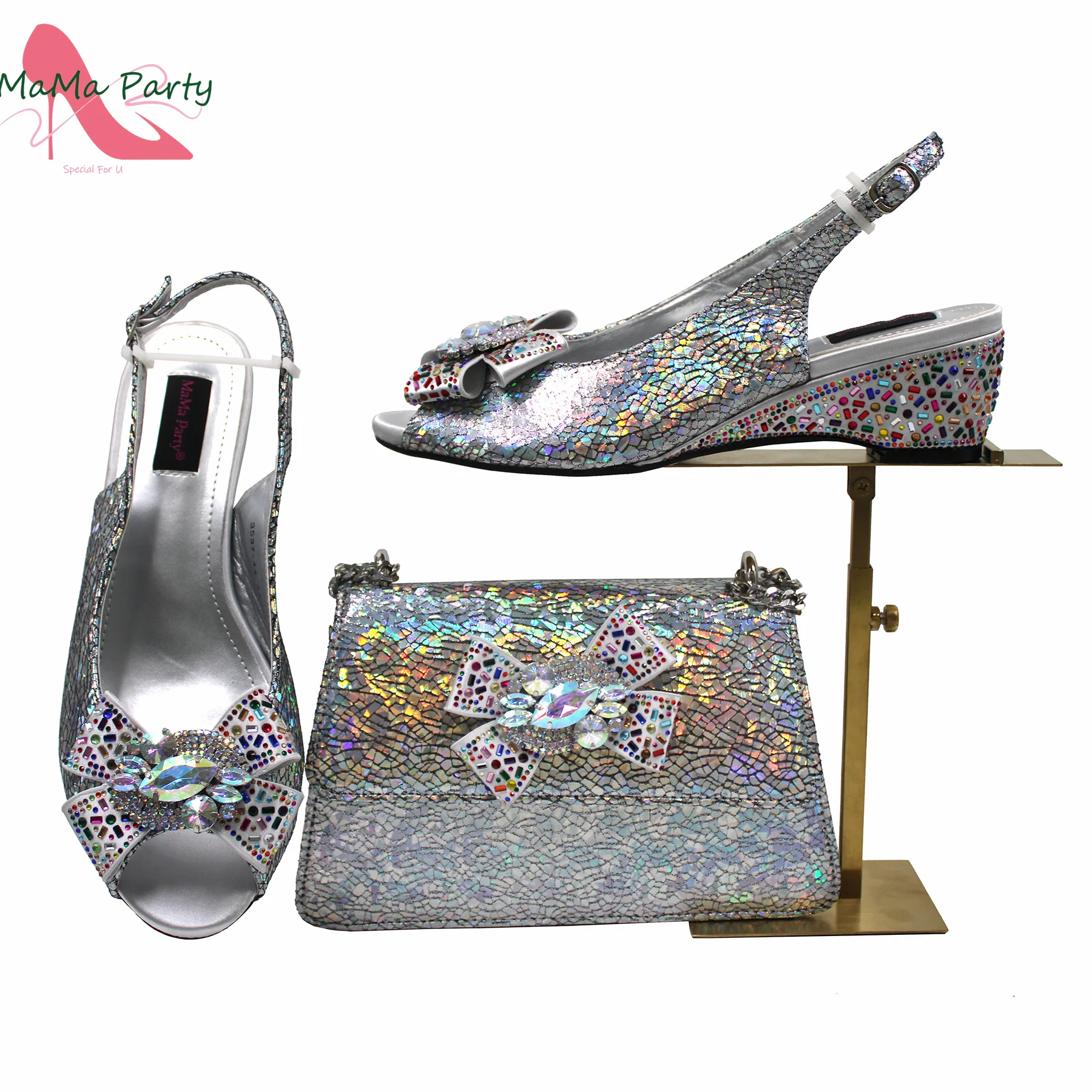 2025 Shinning Crystal with Mid Heels Appliques African Women Shoes Matching Bag for Wedding Party in Silver Color