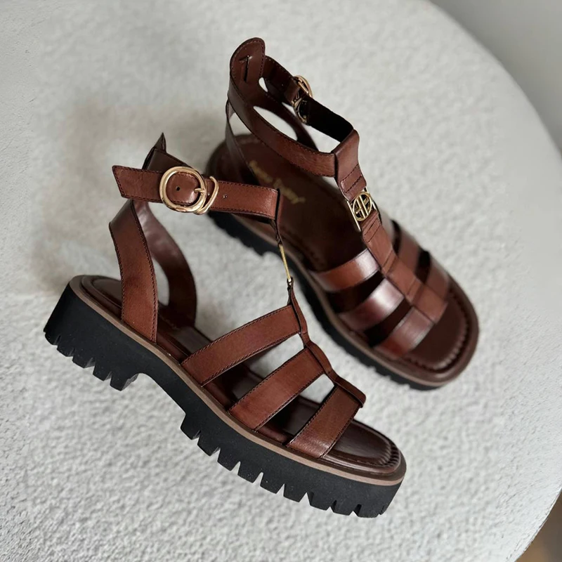 BeauToday Gladiator Sandals Women Genuine Leather Round Toe Ankle Metal Buckle Platform Summer Ladies Shoes Handmade 38215