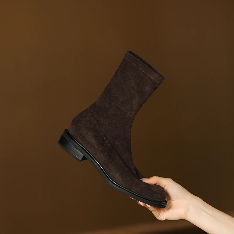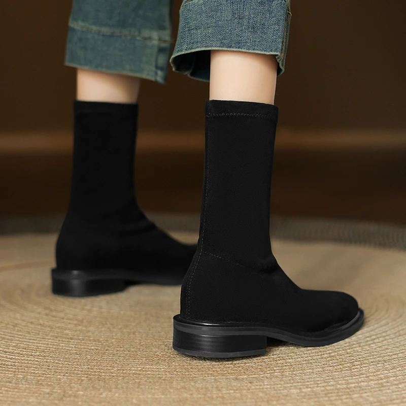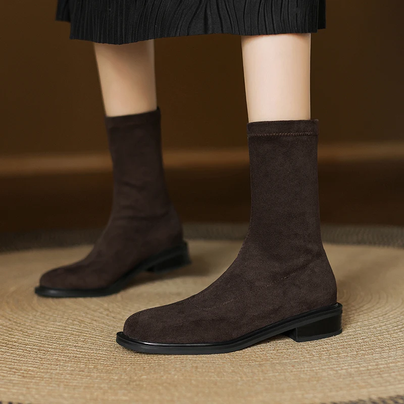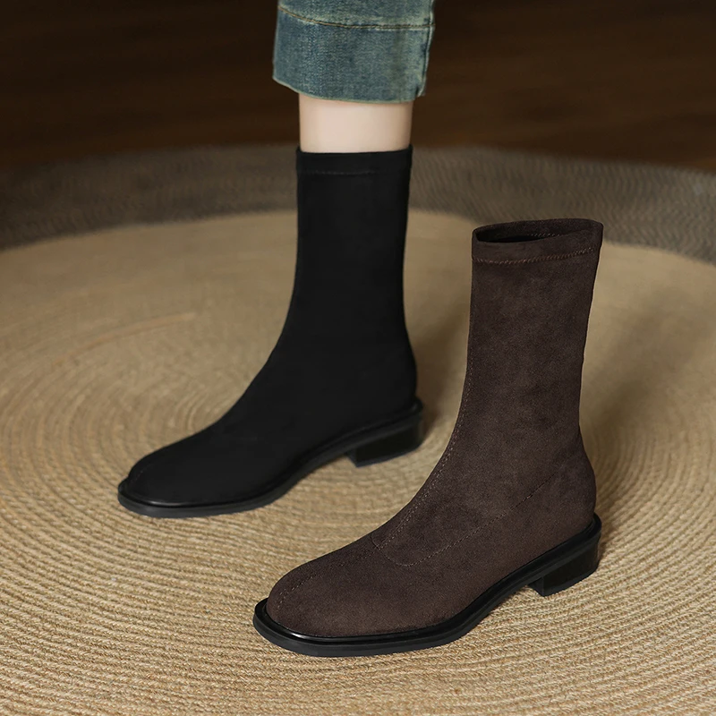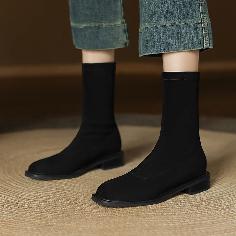 QUTAA 2026 Fashion Faux Suede Stretch Boots Women Winter Ankle Boots Autumn Shoes Low Heels Square Toe Lady Short Boots 34-43