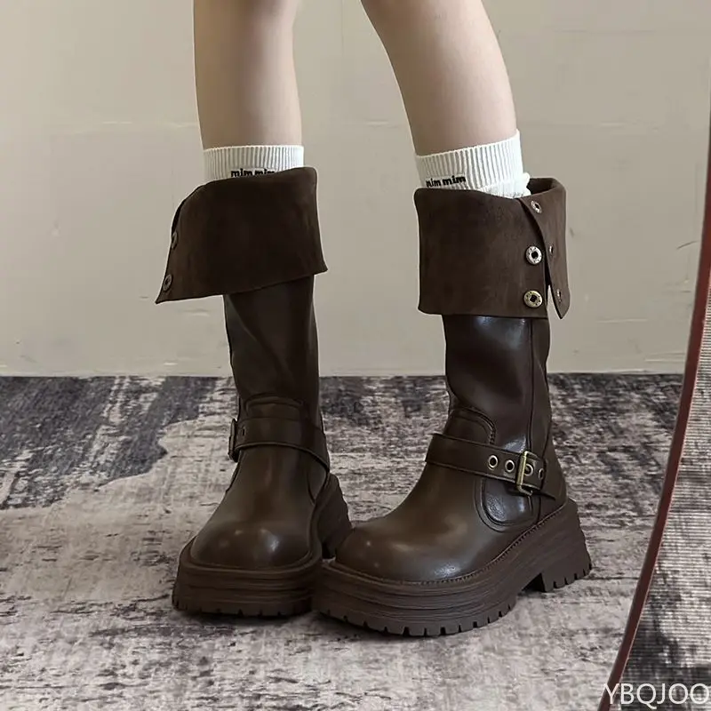 Vintage Square head Low Heels Ladies Shoes Winter Platform Women Thigh High Boots Fashionable versatile Belt Buckle Long Boots
