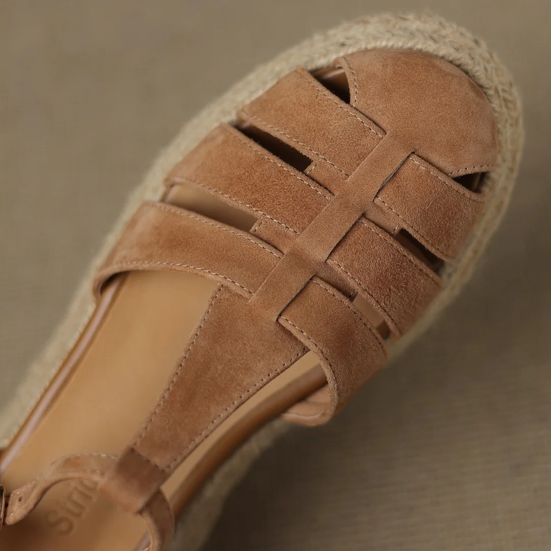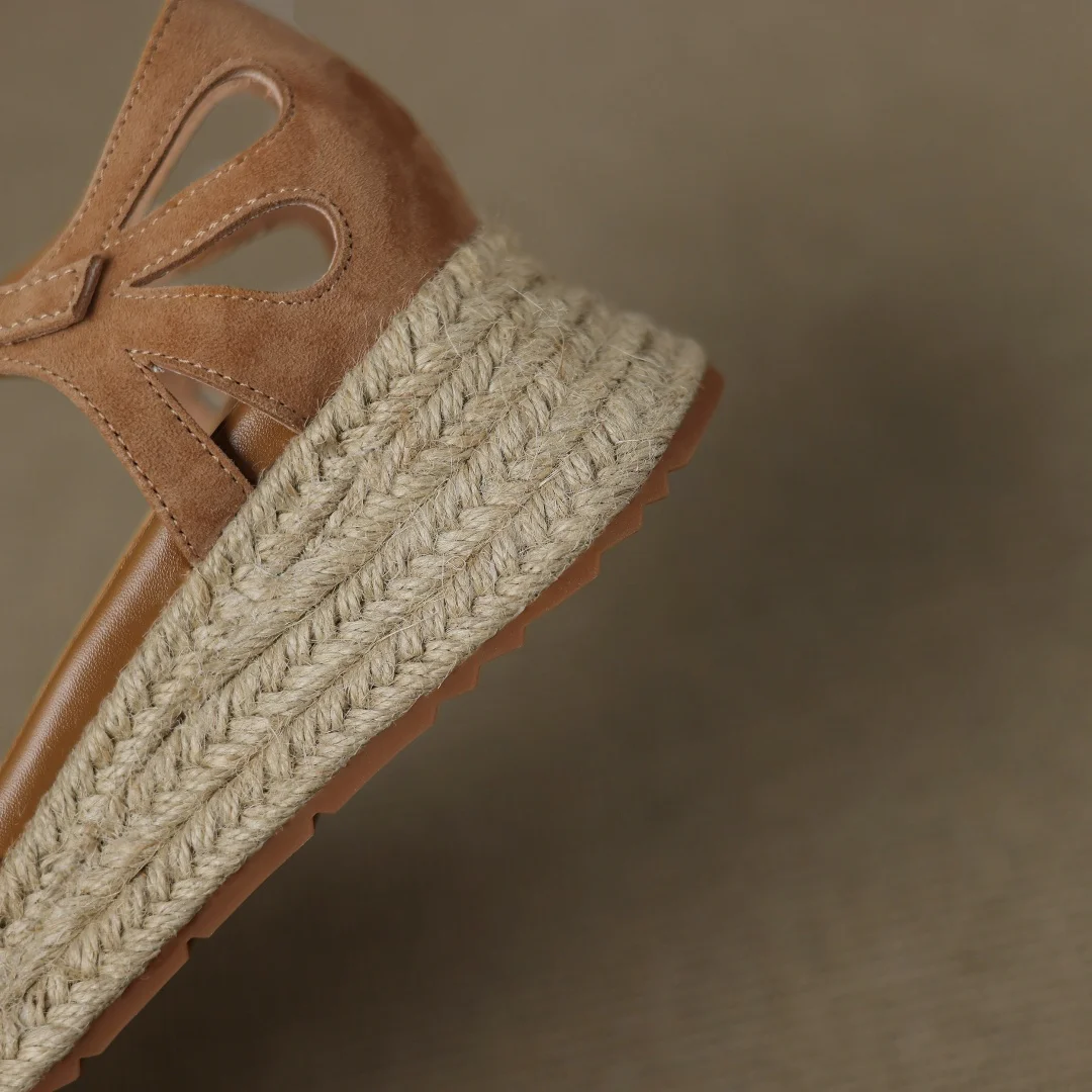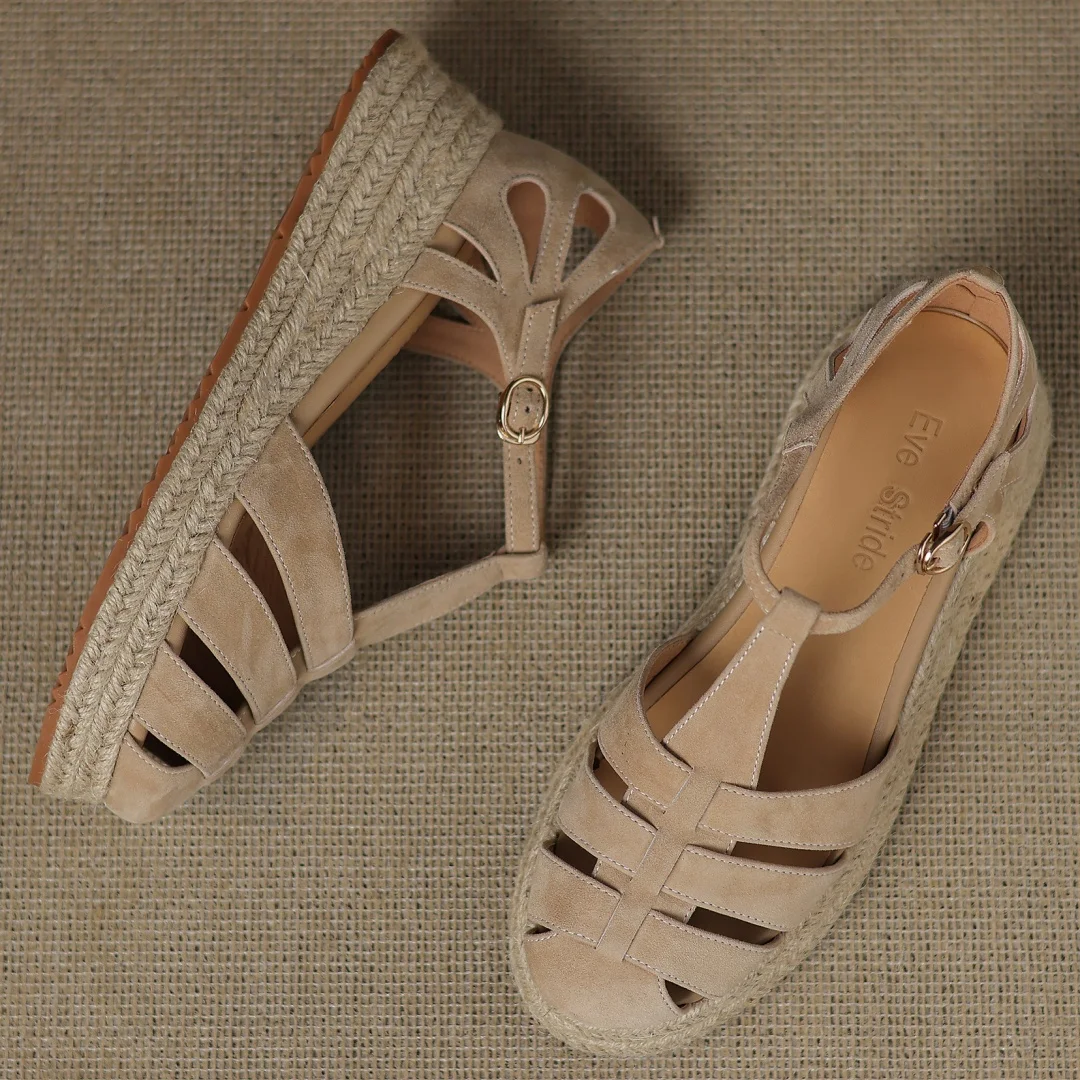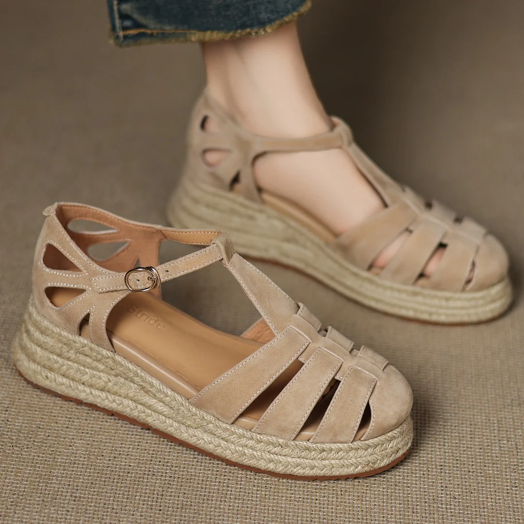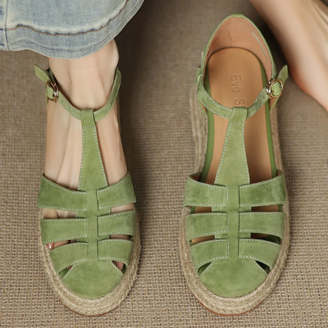 Women's natural suede leather narrow band braided t-strap thick sole platform flats sandals round toe hemp casual female shoes
