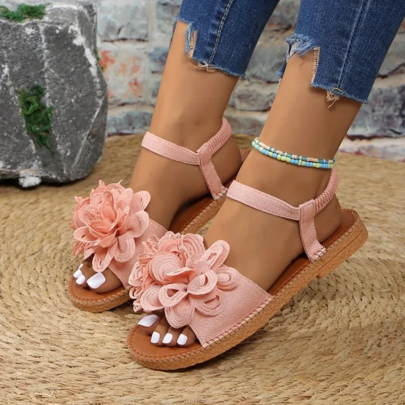 Women's White Floral Flat Sandals Elastic Ankle Strap Open Toe Summer Beach Casual Shoes Ladies Bohemian Comfort Footwear