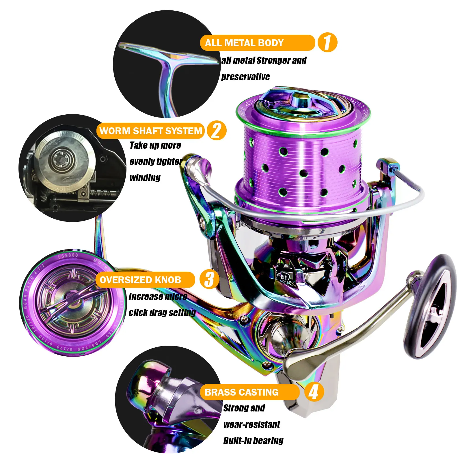 Sizes LS8000-12000 spool; max drag 25KG for powerful freshwater and ocean use.