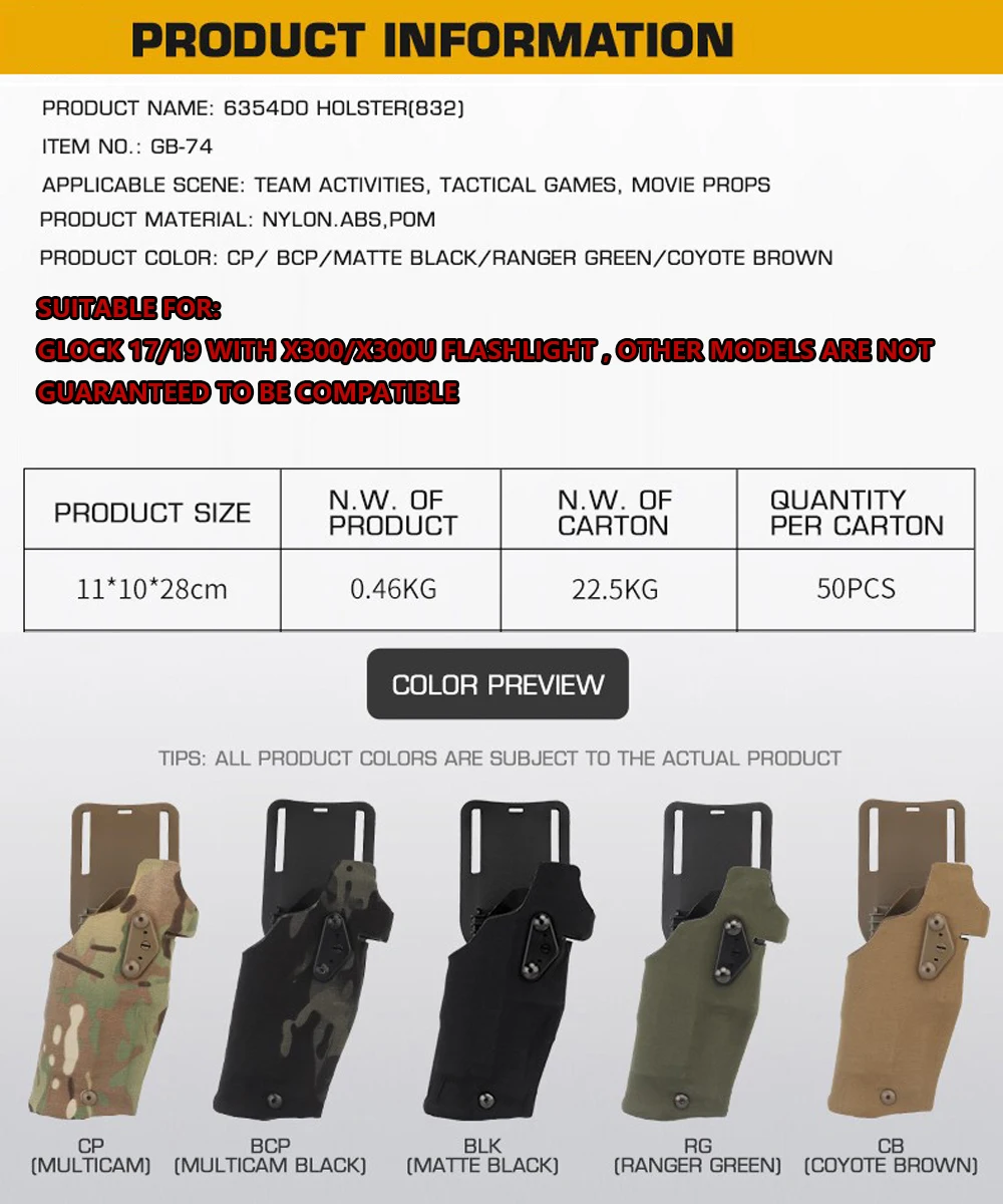 6354DO Tactical Pistol Holster for Glock 17/19 with X300/X300U Flashlight Airsoft -832 ALS Quick Release Leggings Holster