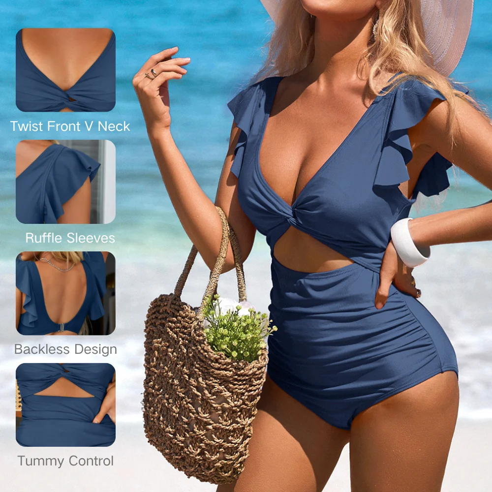 Anfilia Ruffle One Piece Swimsuits for Women V Neck Ruched Monokini Bathing Suits