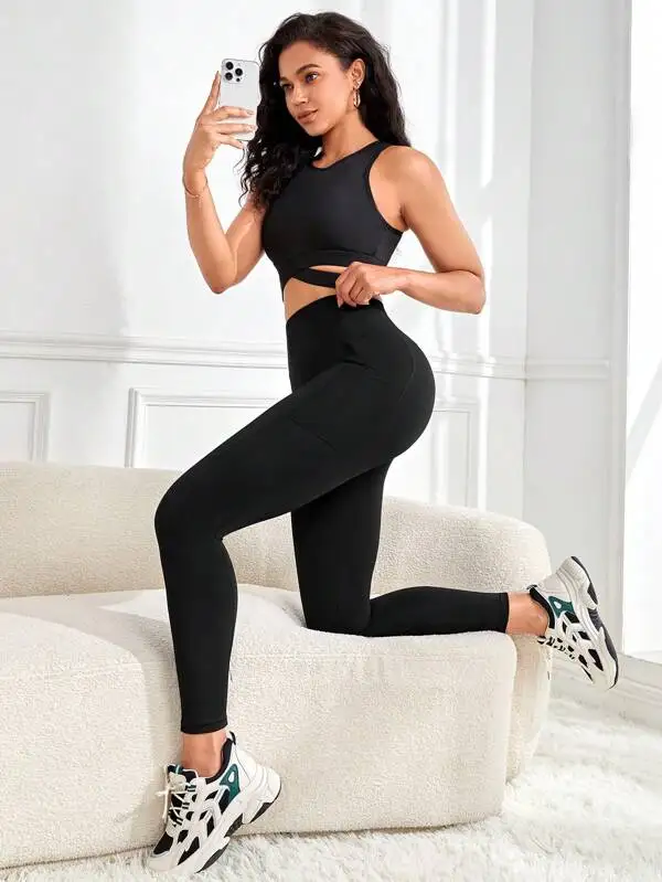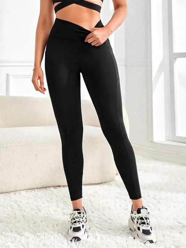 Women's high-waisted solid color pocket yoga leggings, slim-fit stretch leggings, comfortable and breathable fitness pants