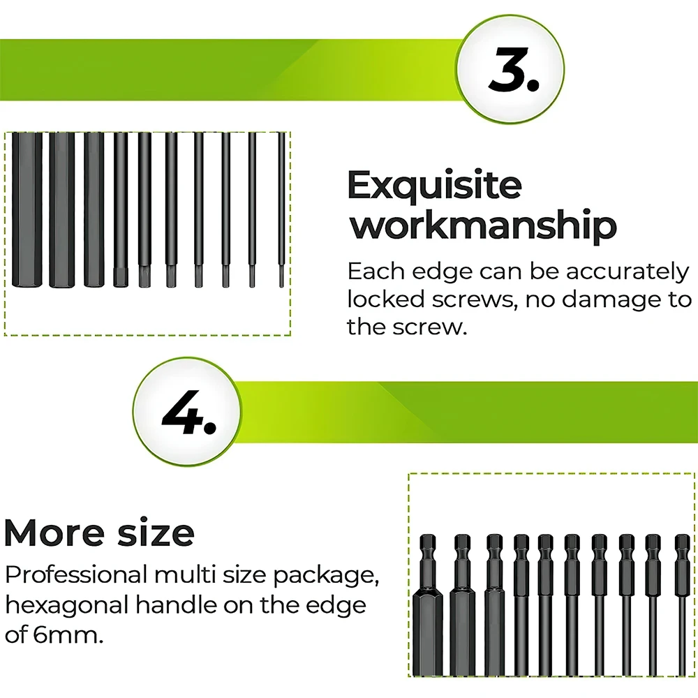 10pcs Hex Head Allen Wrench Drill Bit Set 100mm S2 Steel Allen Screwdriver Bits 1.5 to 12mm SAE Metric Hex Key Bit with Magnetic