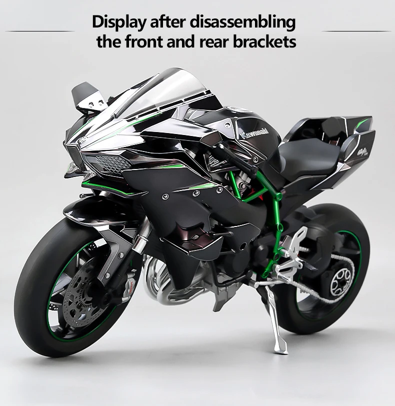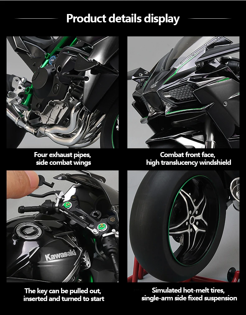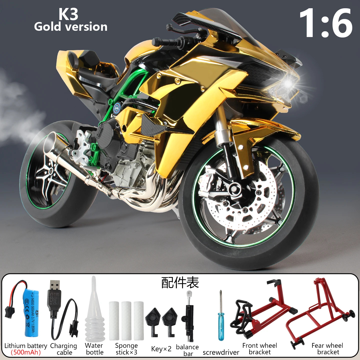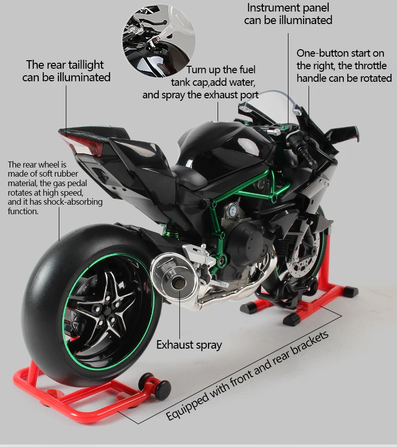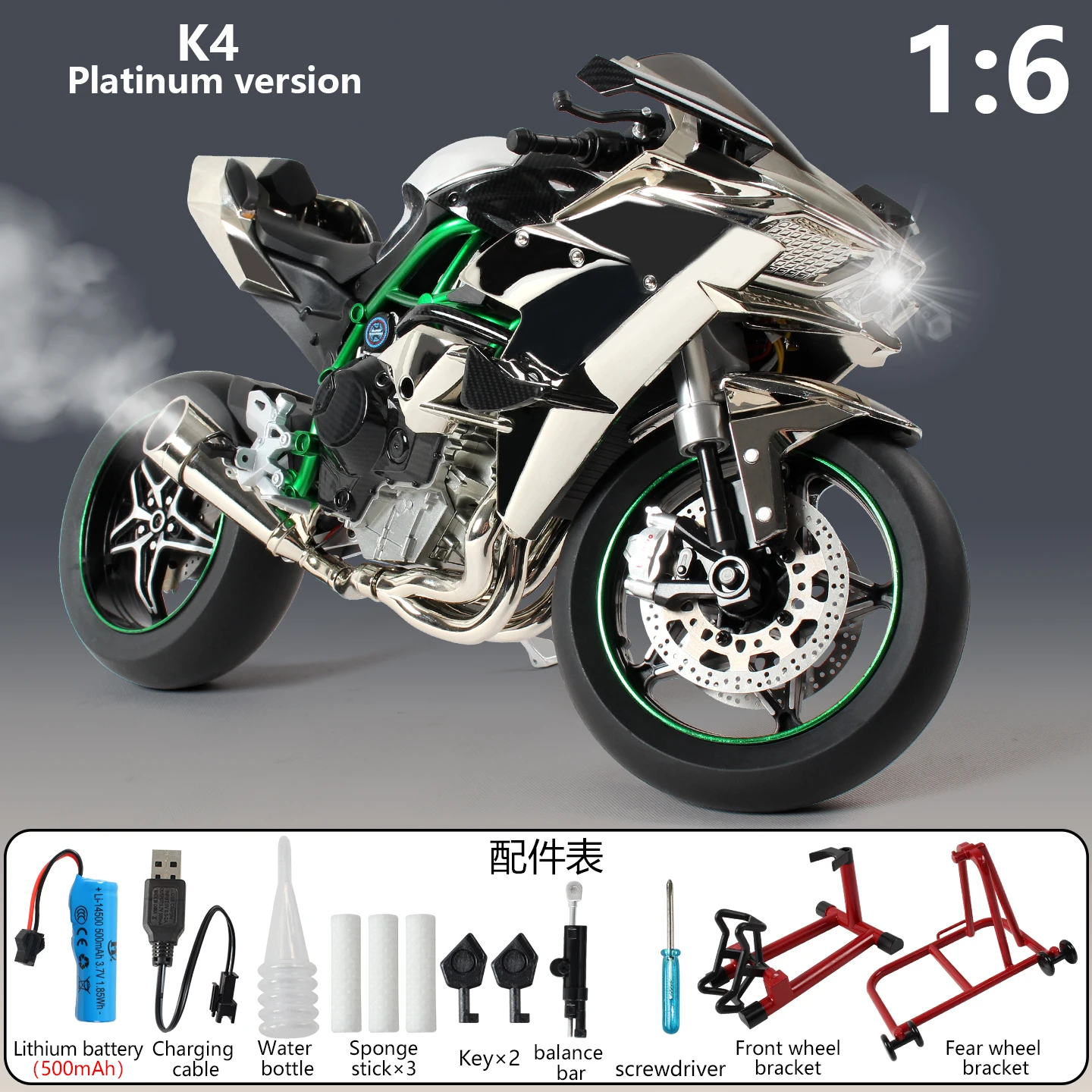 Motorcycle model with key start, dynamic features, LED lights, sound, and smoke, adjustable throttle, model motorcycle toy, desk