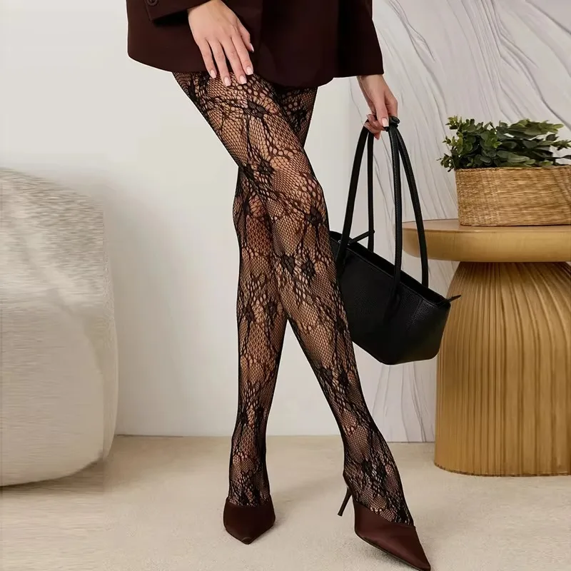 Kave High Elastic Burgundy Hollowed Lace Fishnet Tights for Women Sweet Romantic Floral Lace Patterned Mesh Pantyhose Stockings