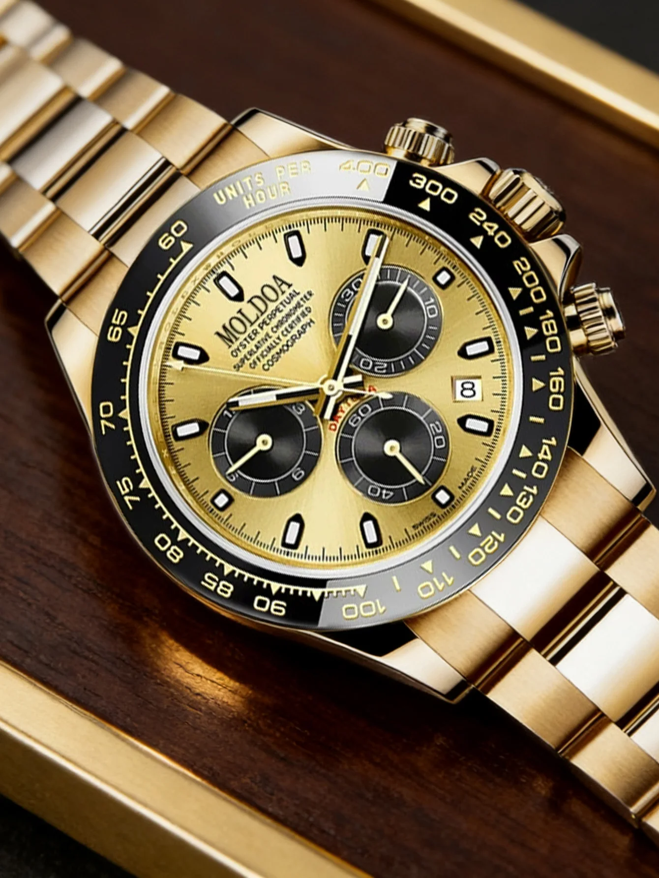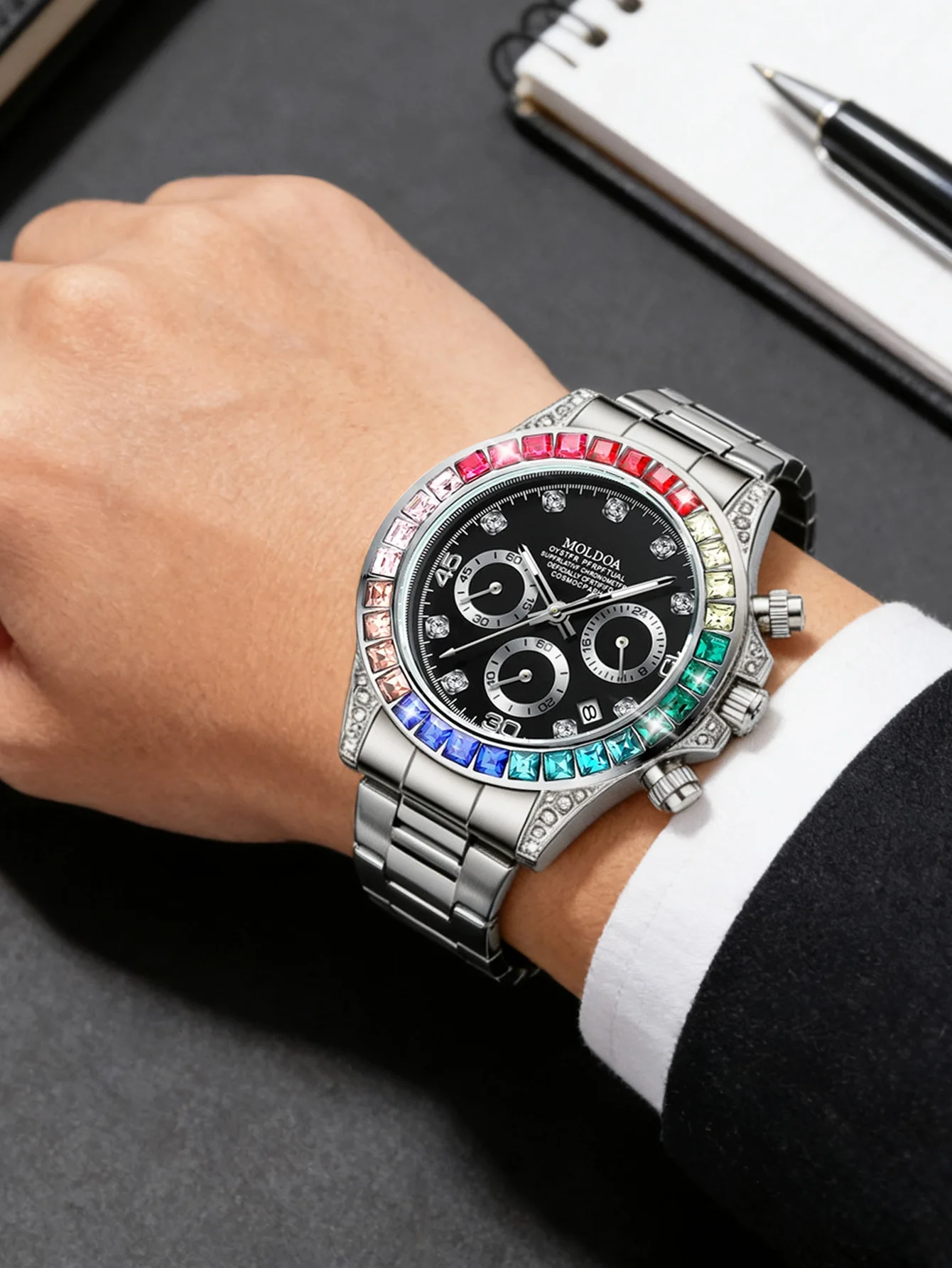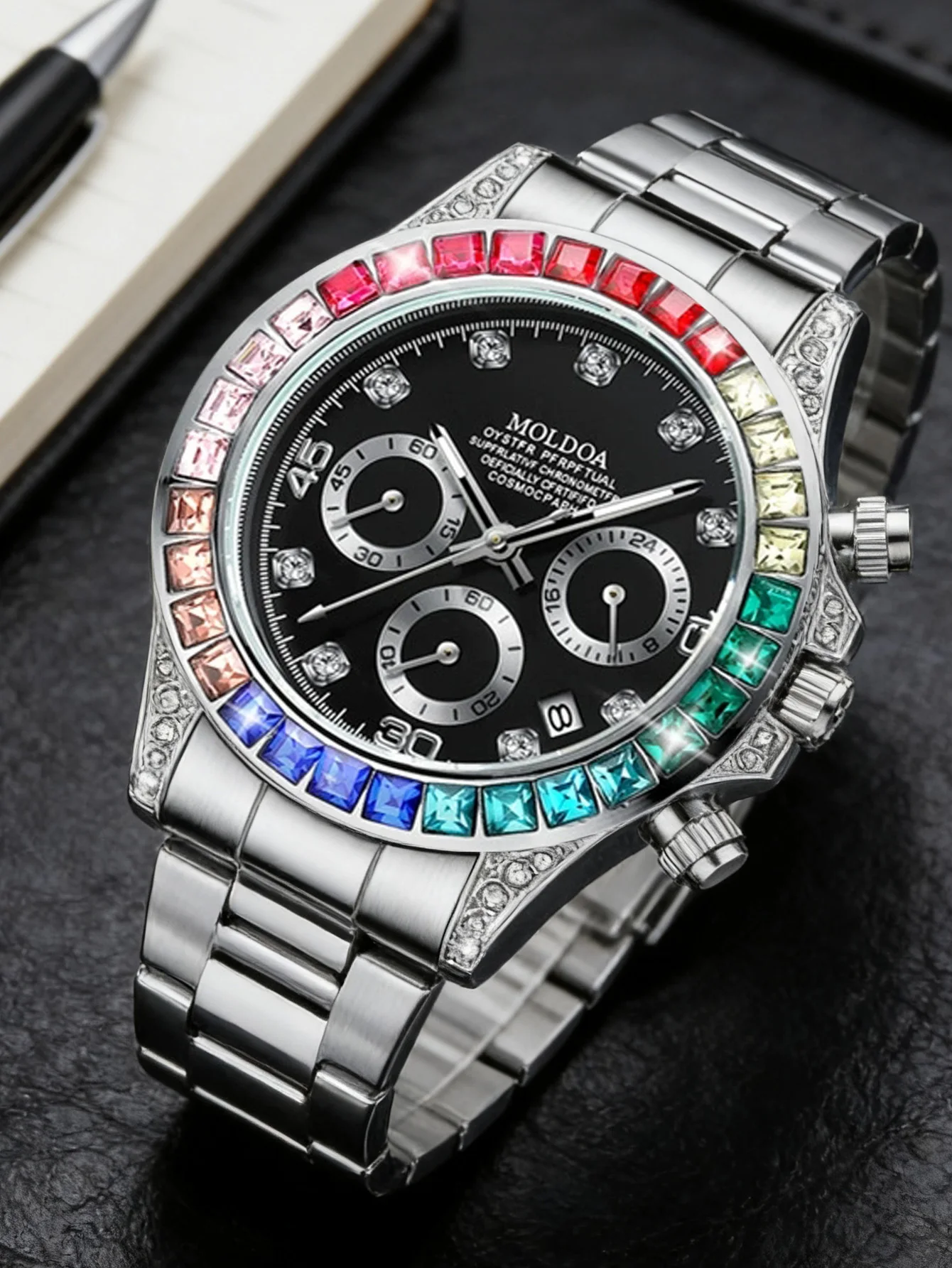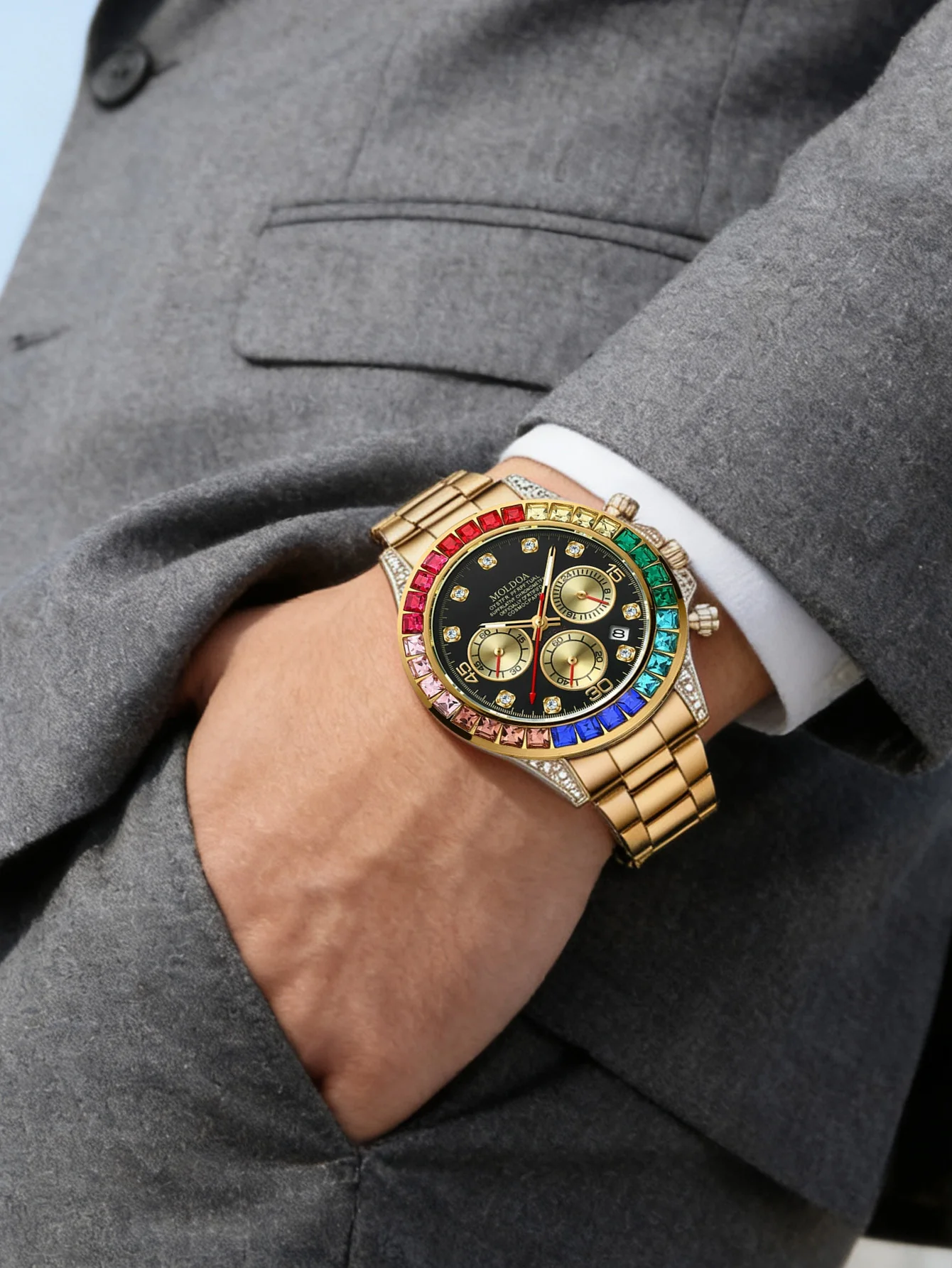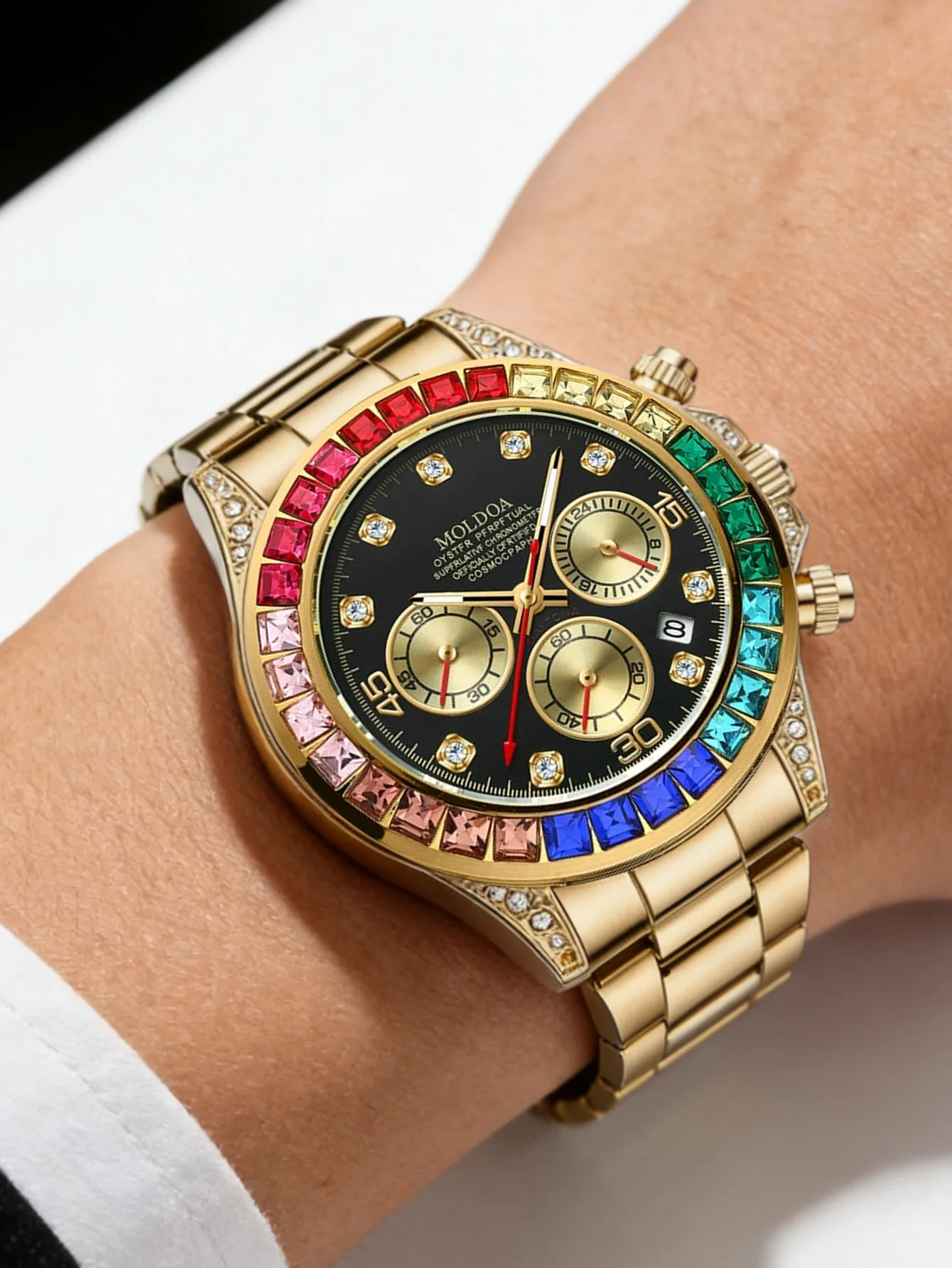 Luxury Rainbow Daytona Watch - Gold Steel Band Rainbow Gem Bezel Chronograph Quartz Wristwatch