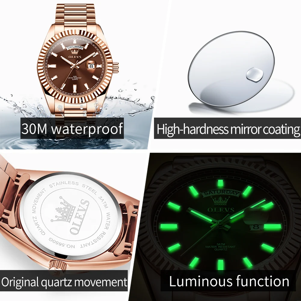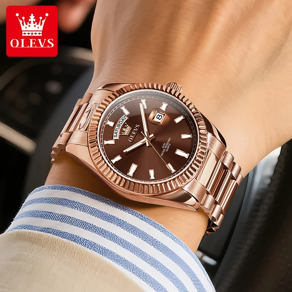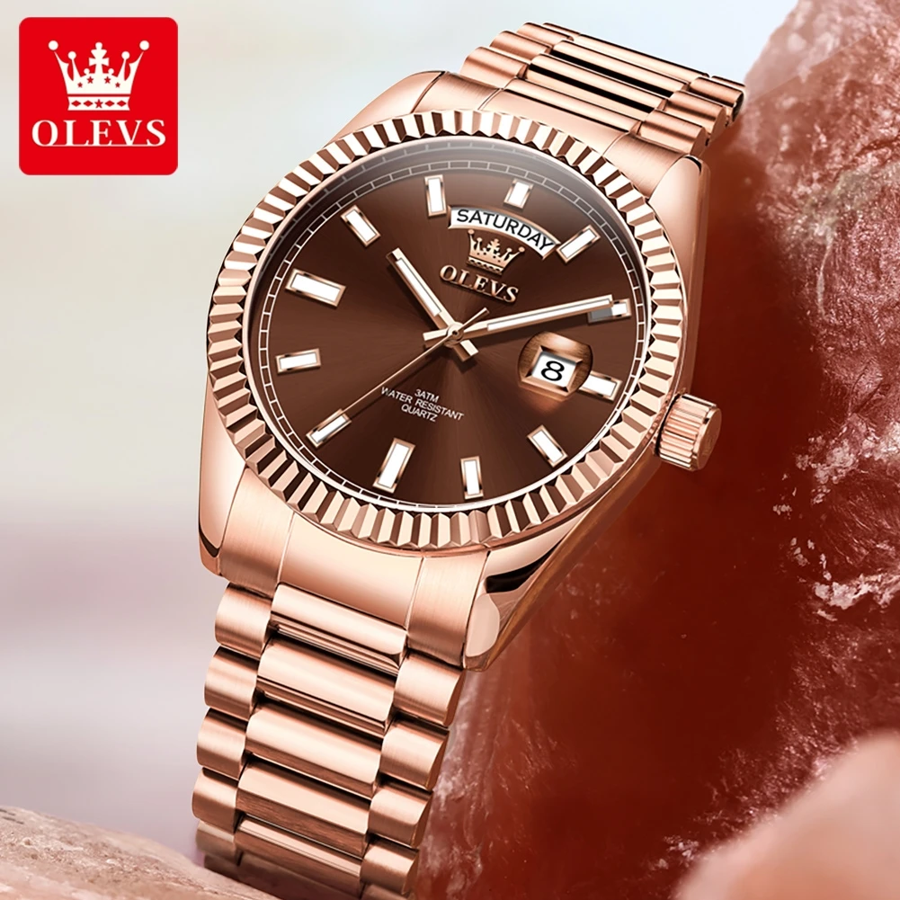 OLEVS Men's Watch Top Brand Luxury Wrist Watch For Men Fashion Rose Gold Stainless Steel Waterproof Watch Day Date Quartz Clock