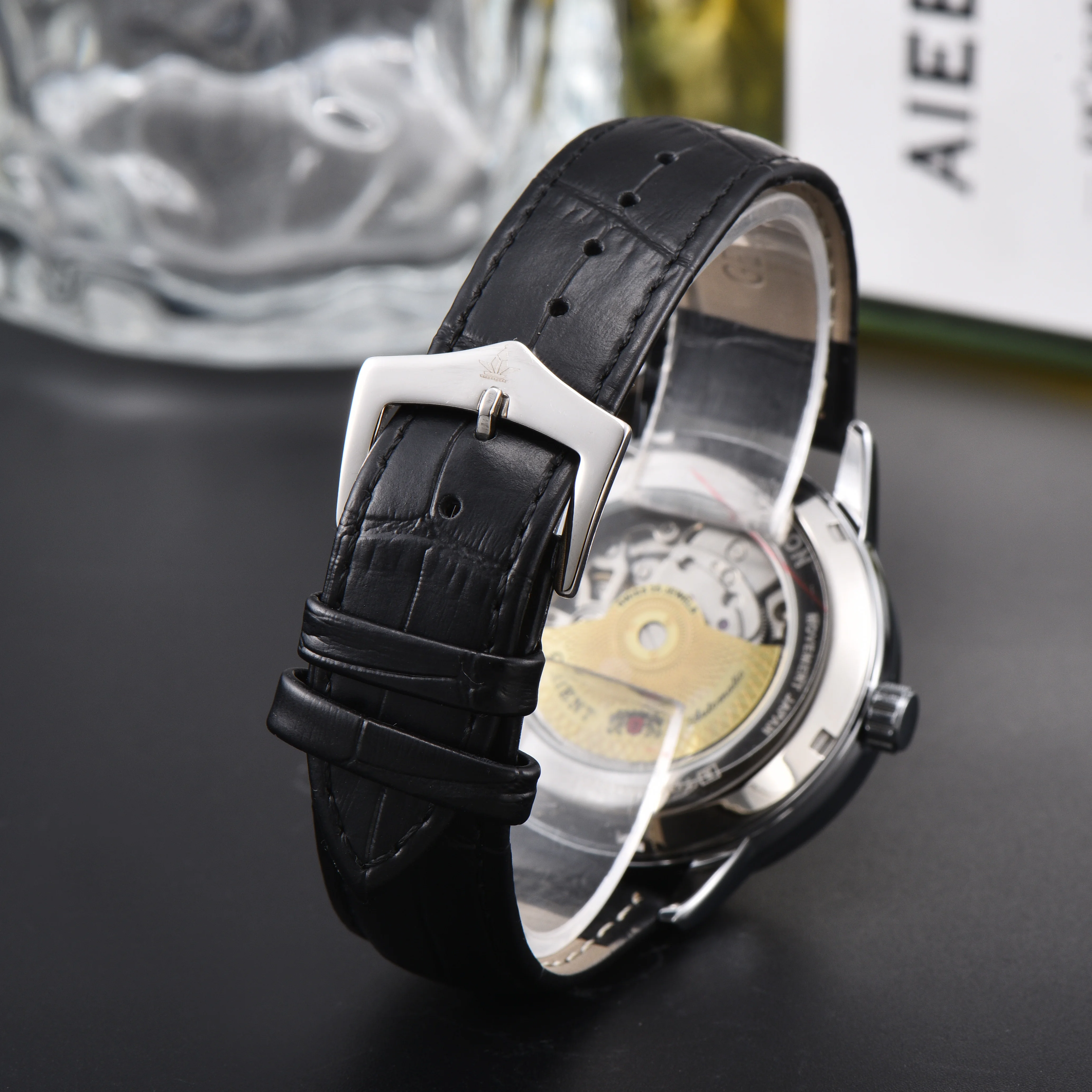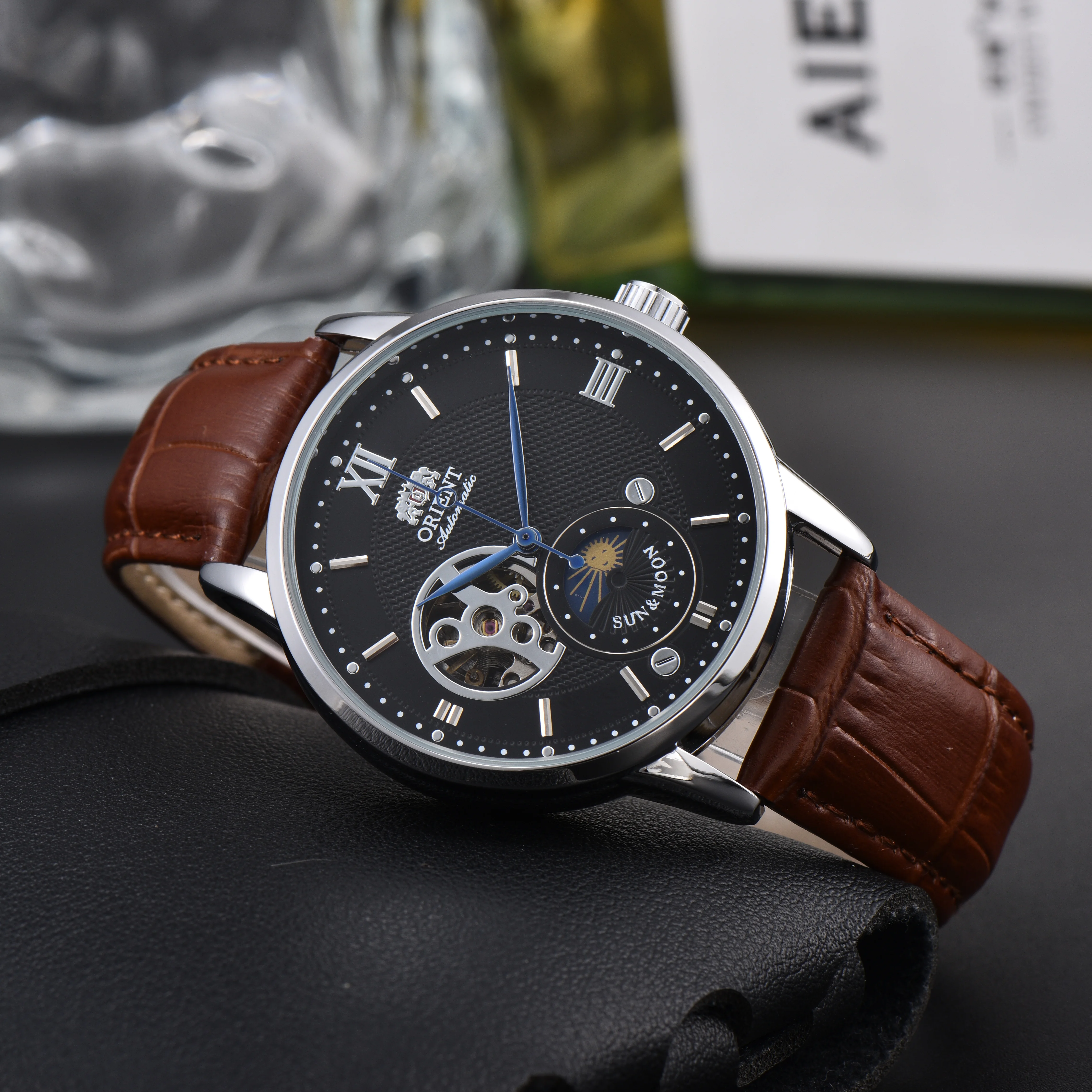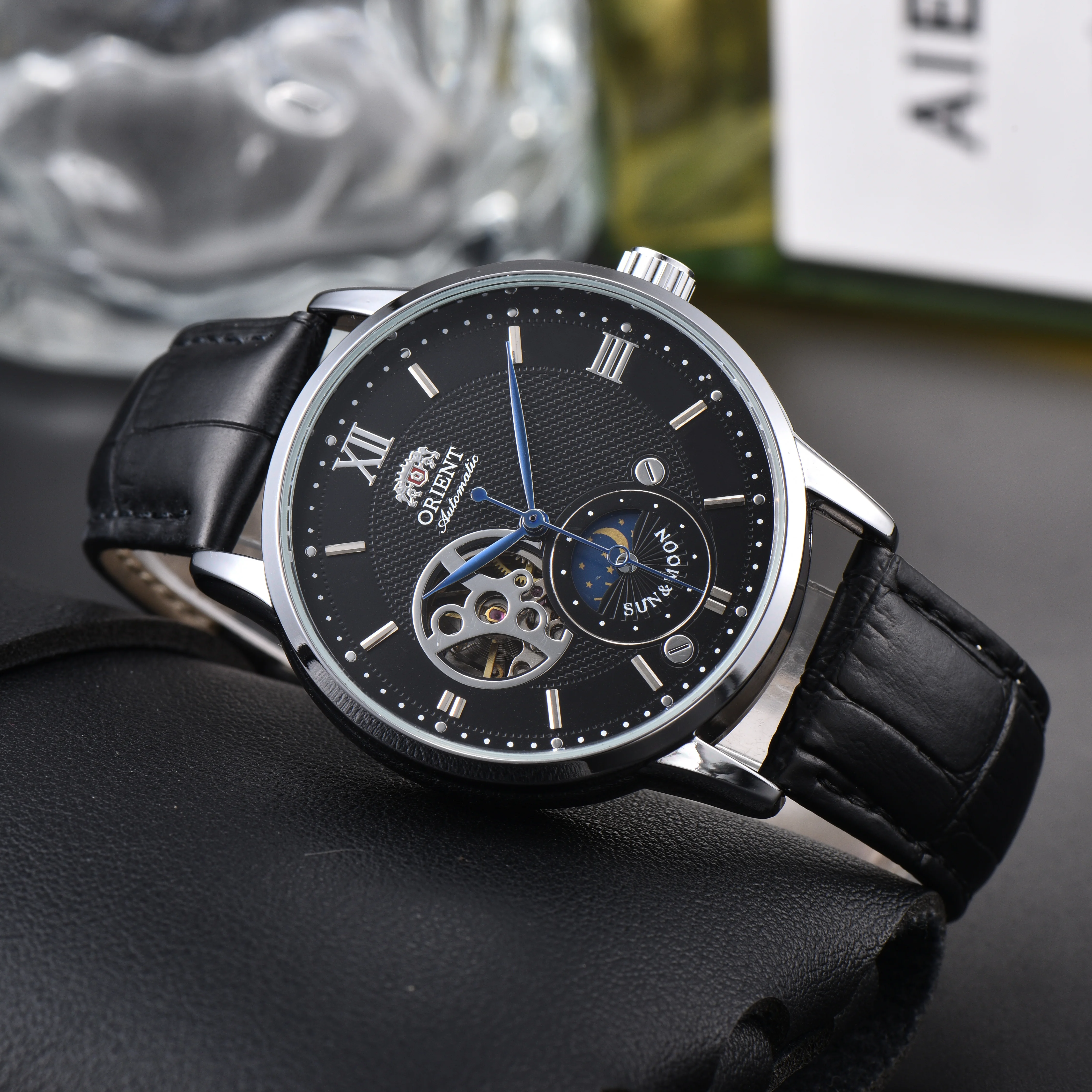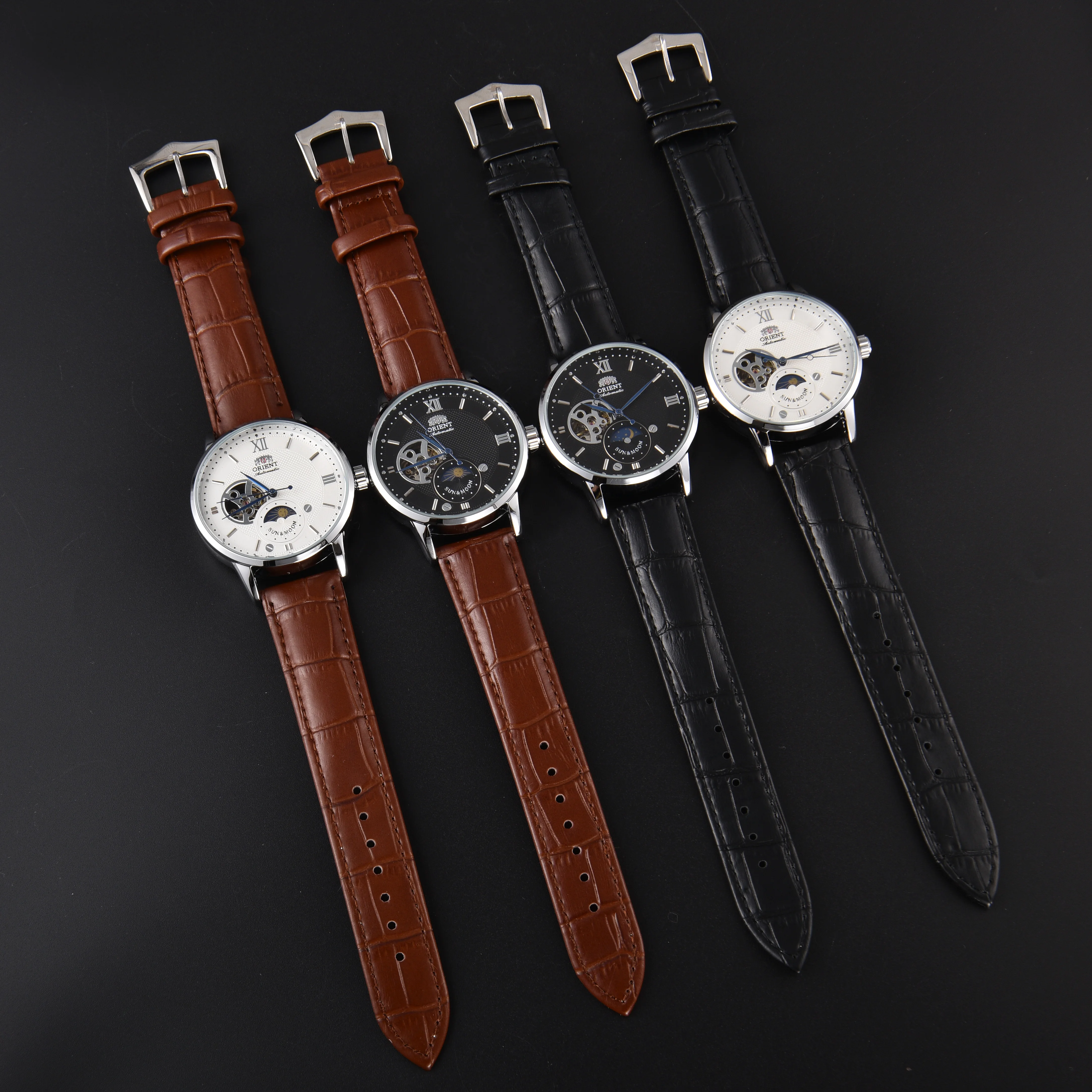 Orient Sun & Moon Semi Skeleton Automatic Watch Men's White Dial Black Leather Strap Sapphire Crystal 50M Waterproof Dress Watch