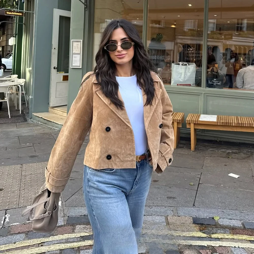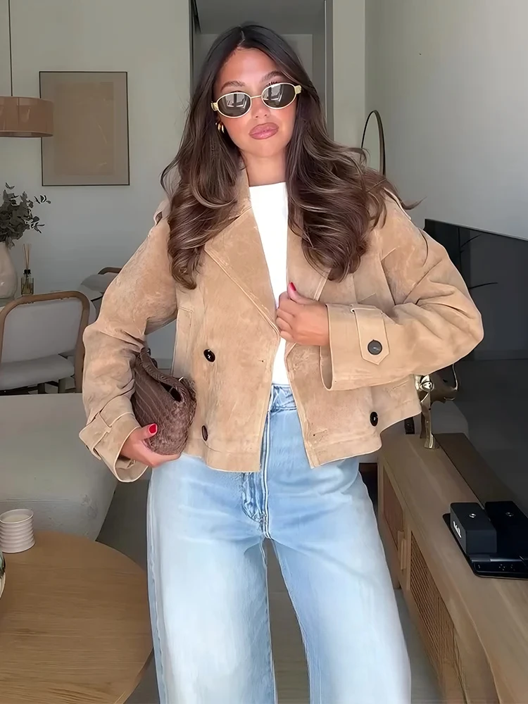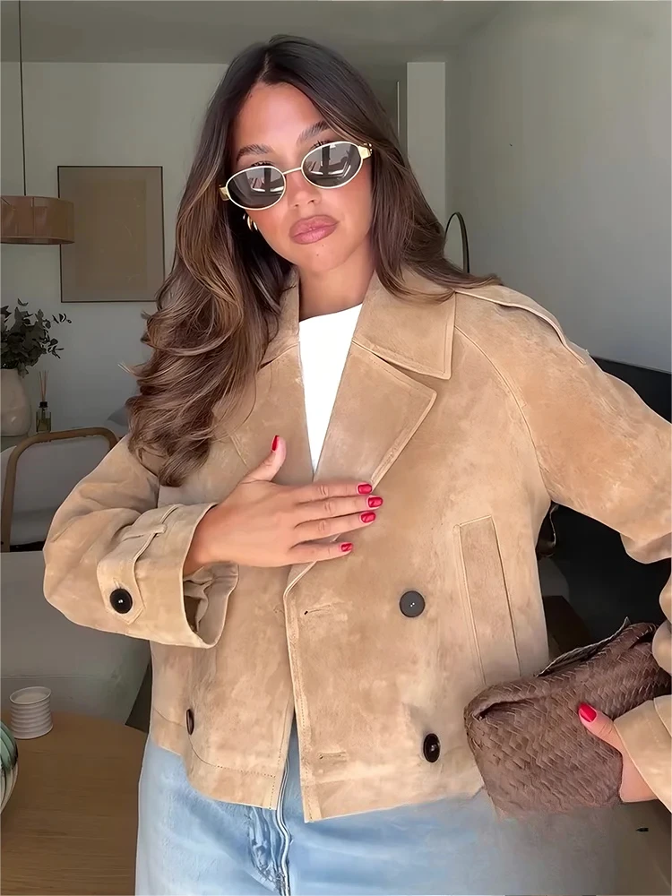 KONDALA Casual Chic Khaki Suede Women Blazer Jacket Women Long Sleeve Double Buttons V Neck Coats Fashion 2025 Fall Winter Coats
