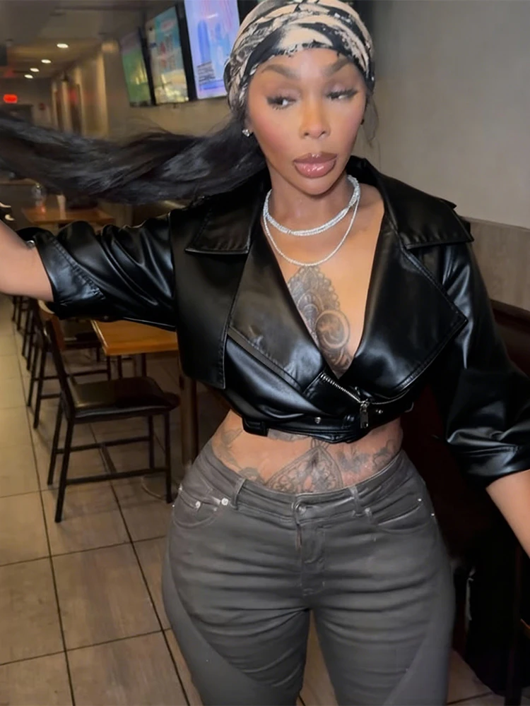 Nibber Low-Neck Hottie Jacket Woman PU Leather Sexy Three Quarter Sleeve Belt Shape Waist Navel Exposed High Street Style Coats