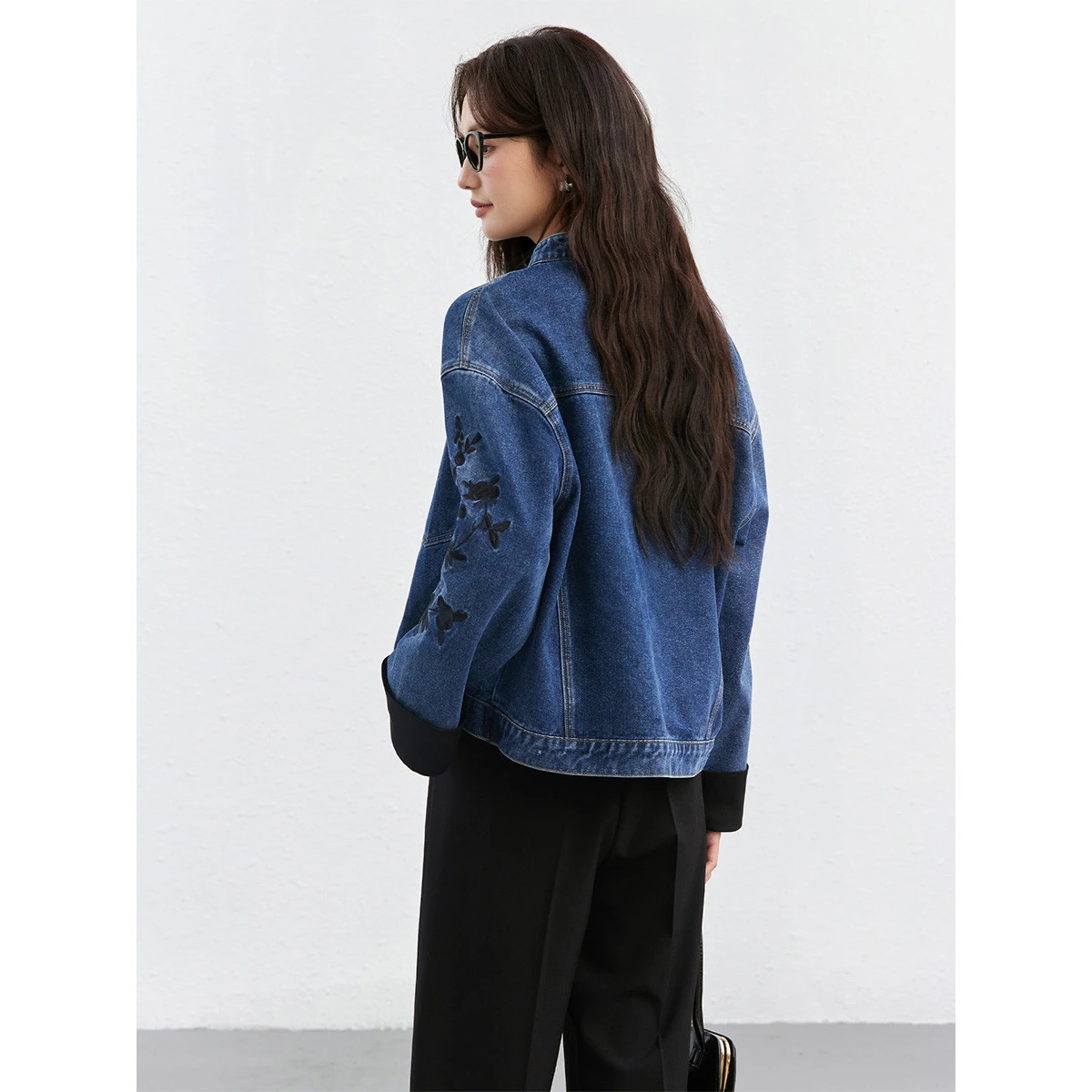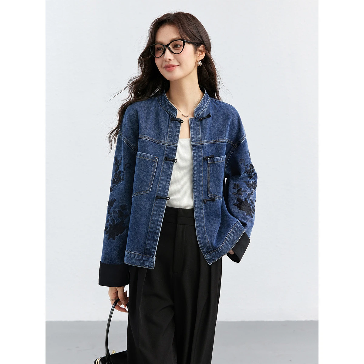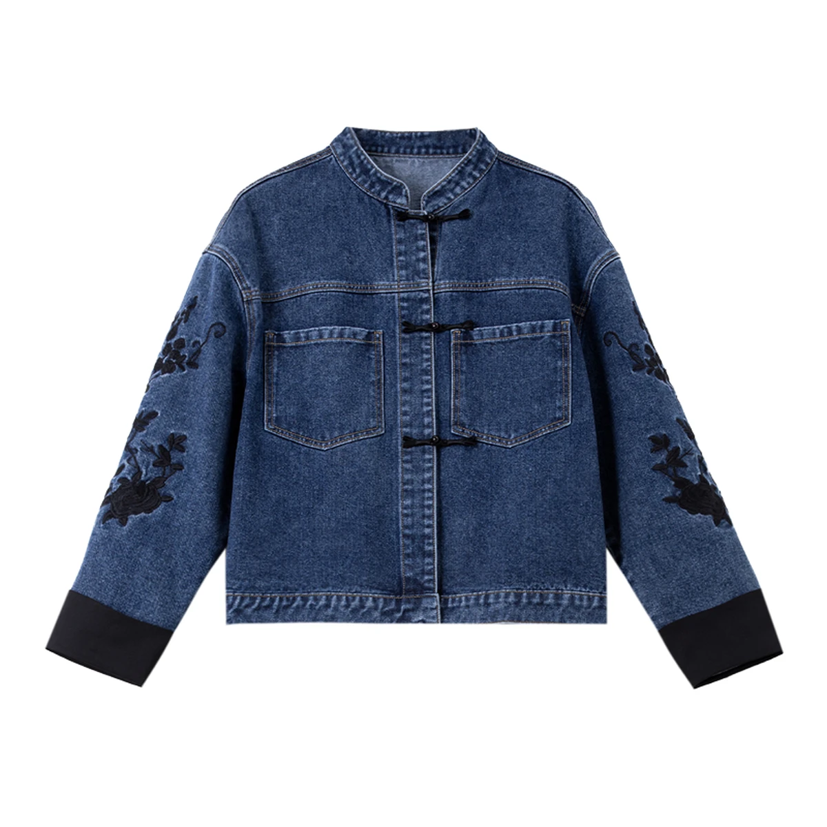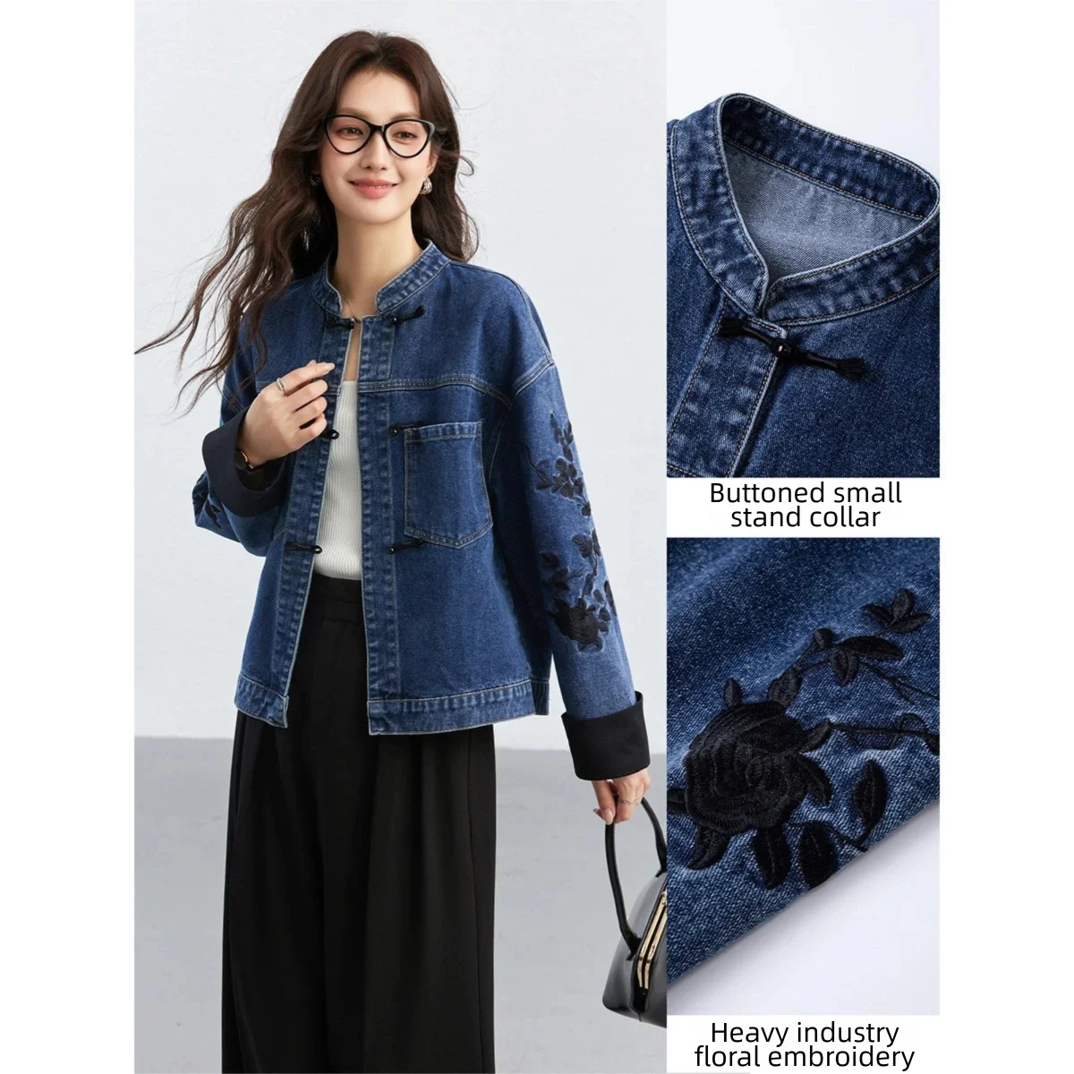 VIMLY Women's Chinese-style Denim Jacket Lady 2026 Spring Fall Embroidery Long Sleeve Straight-cut Outerwear Woman Clothes 75351