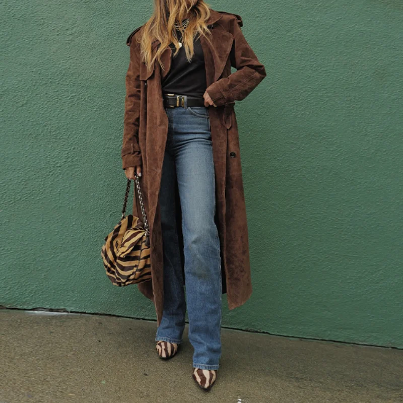 Women's Trendy Retro Elegant Suede Overcoat Trendy Cinched Waist Loose Long Coat 2026 Casual High Street Single Breasted Jacket