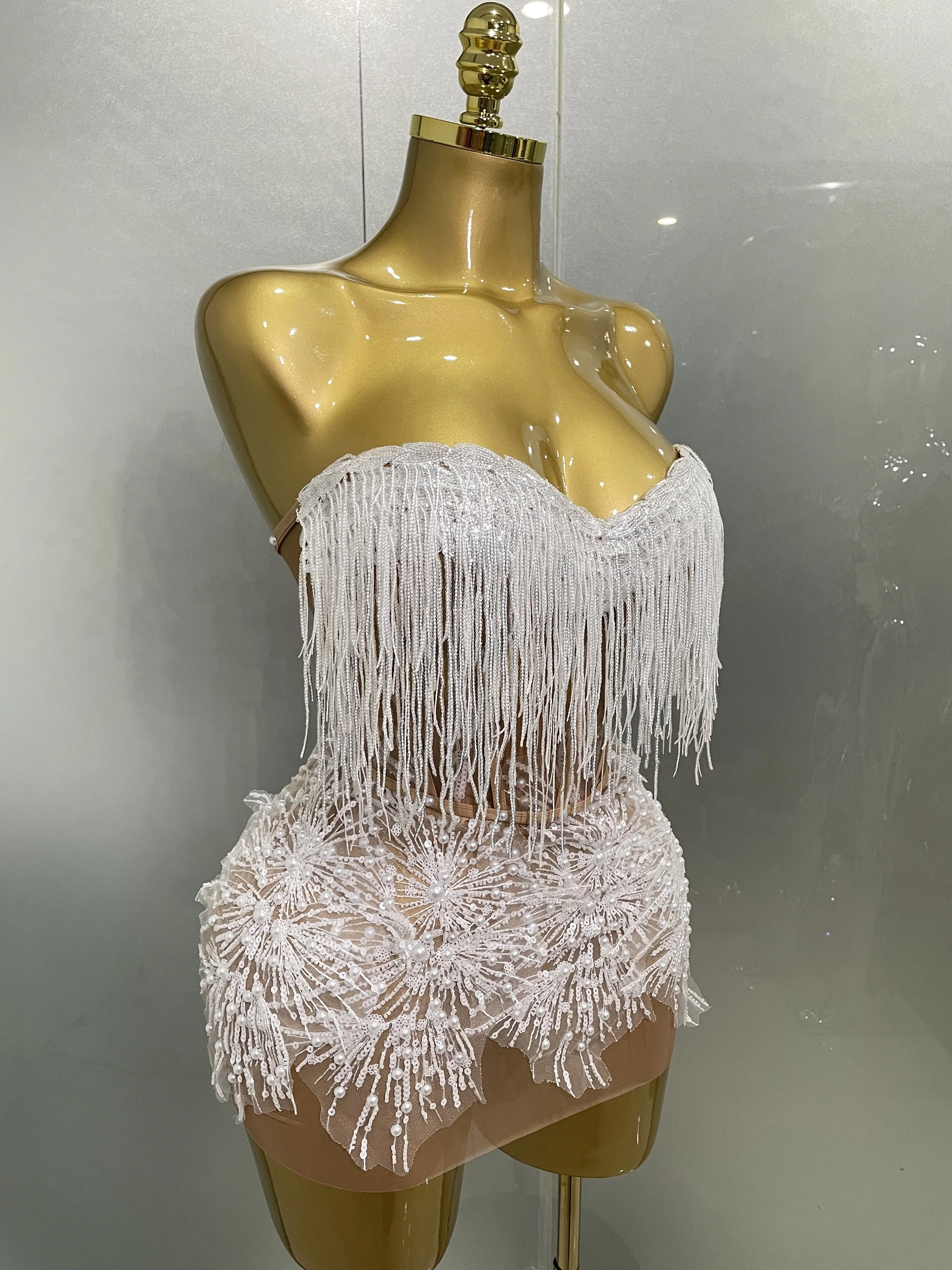 2025 Sexy Pearl Sequins Tassel Sleeveless Glitter Mini Dress Women Singer Bar Nightclub Stage Performance Clothing Show Outfit