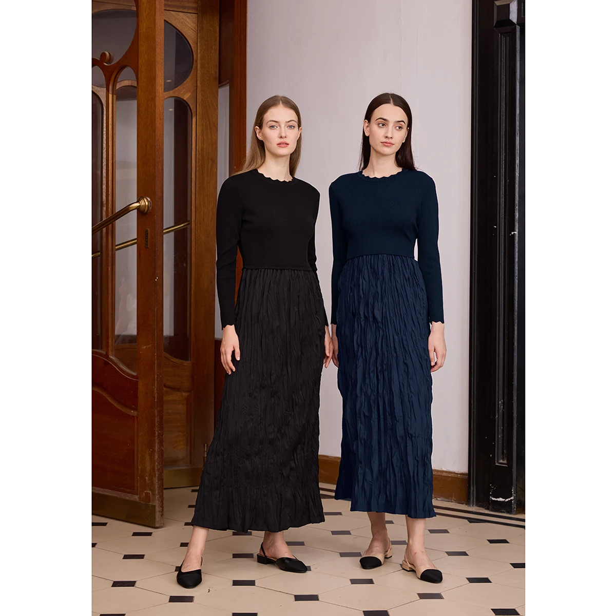 AP 2026 Women Autumn and Winter Crinkle Dress Knitting Patchwork Elegant Lady Maxi Dress