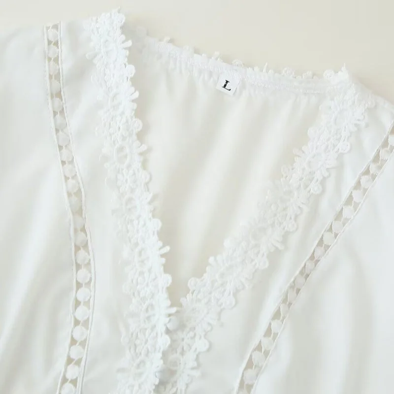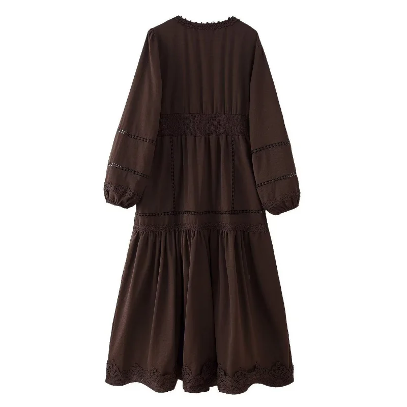 Elegant V-Neck Lace Trim Midi Dress for Women - Long Sleeve Button Down Hollow Out Casual Long Dress for Spring Summer Daily
