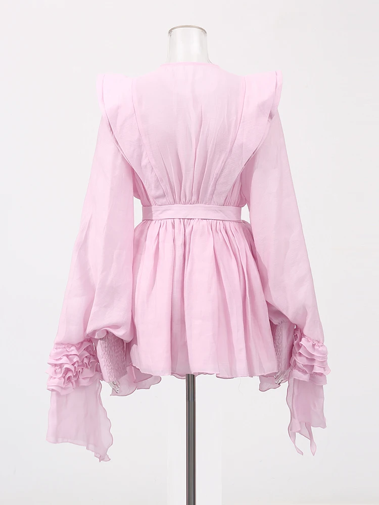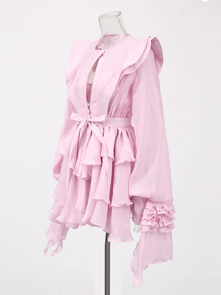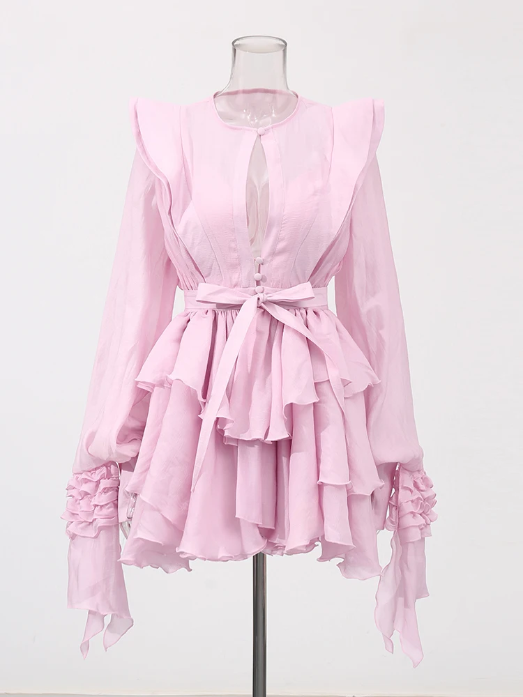 Hollow Out Slimming Spliced Folds Mini Solid Dresses For Women Round Neck Long Sleeve High Waist Temperament Dress Female
