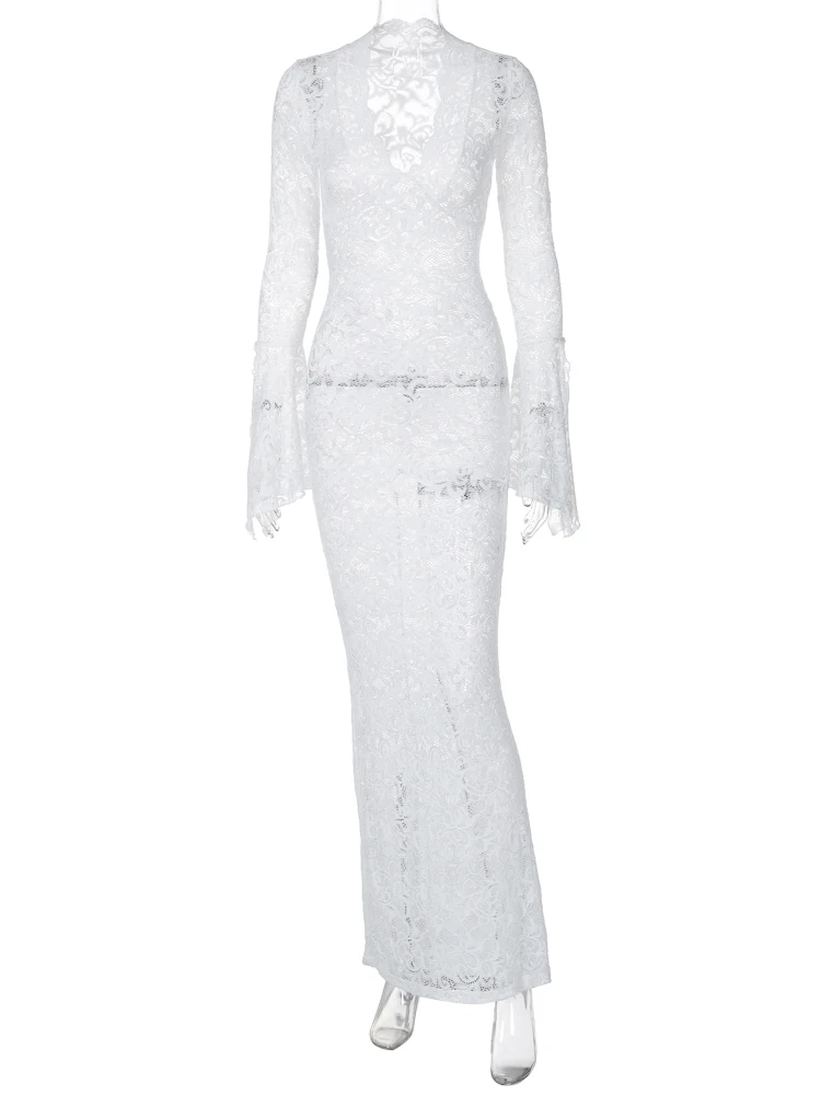 Hugcitar Mesh Floral Print V Neck Long Flare Sleeve Sexy See Through Maxi Dress Spring Women Fashion Clothes Beach Vacation Club