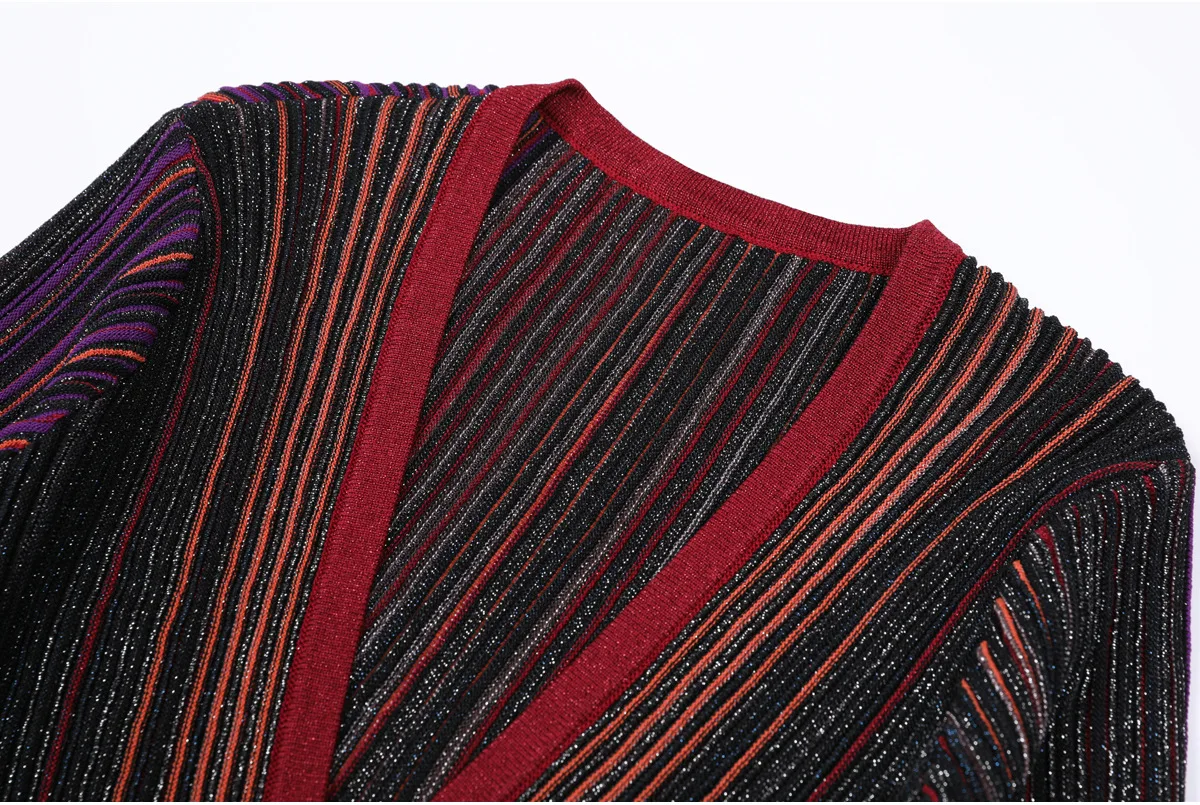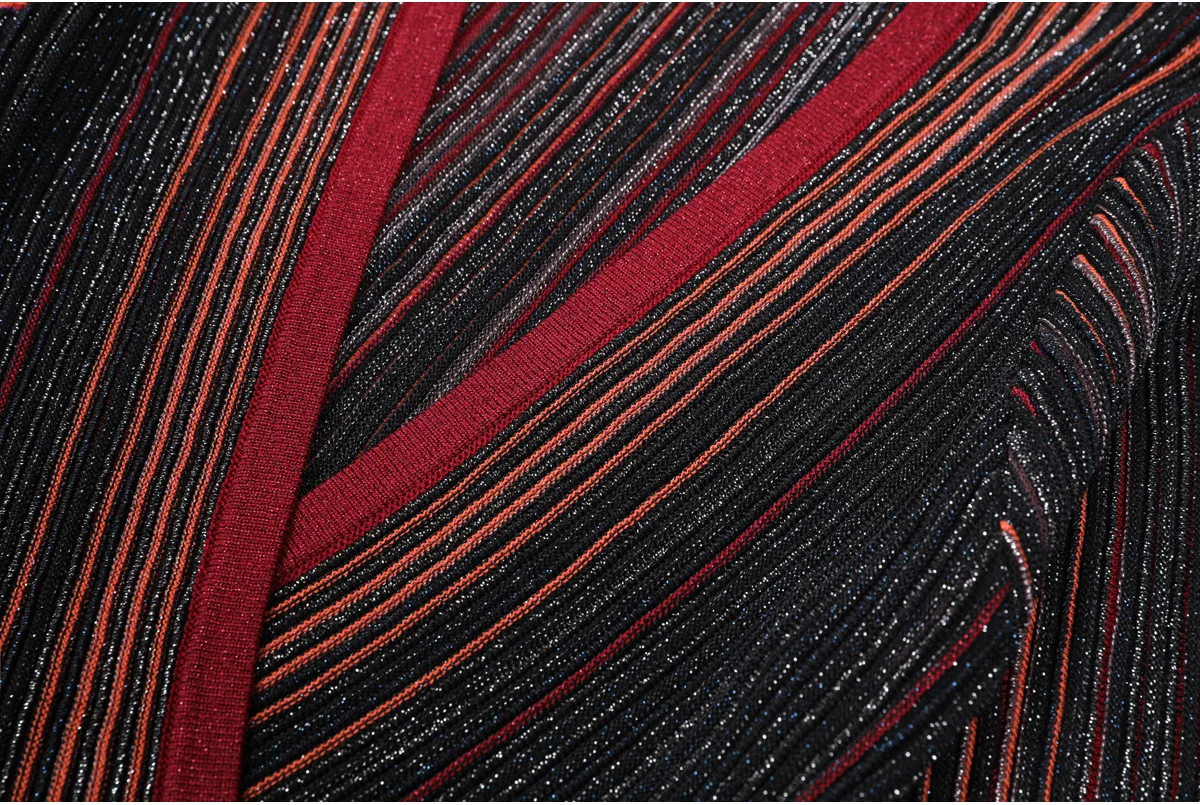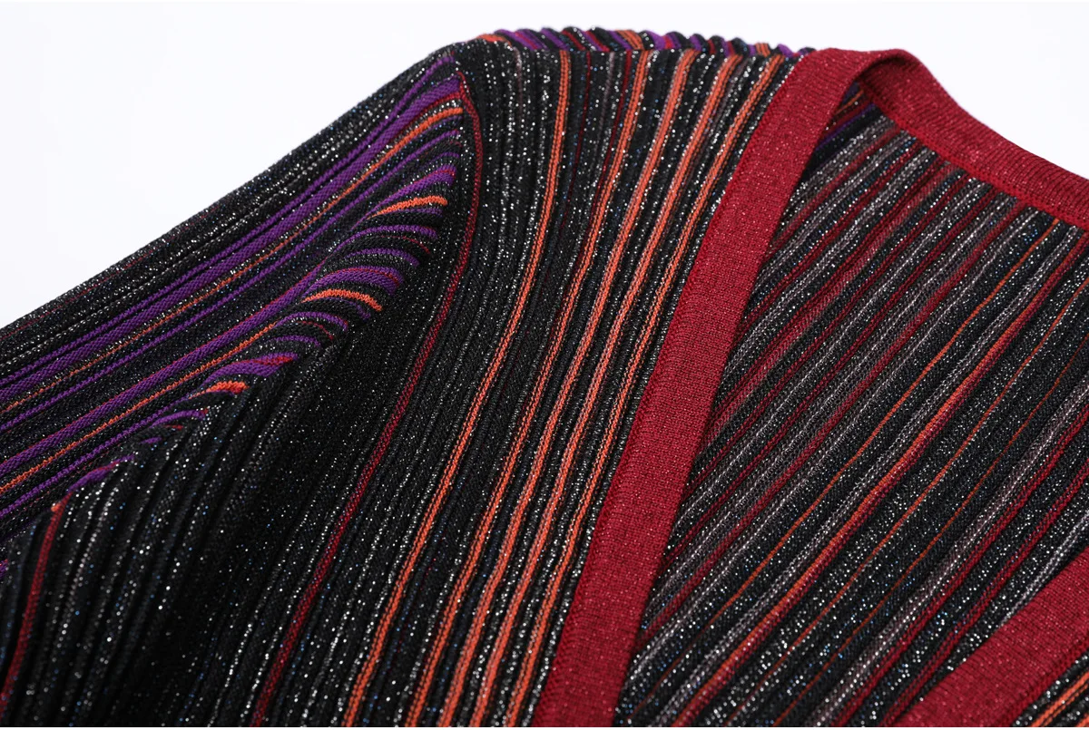 Lady Stylish Autumn New Elegant Style Slim Fitted V-neck Long Sleeve Striped Knits A-line Long Dress