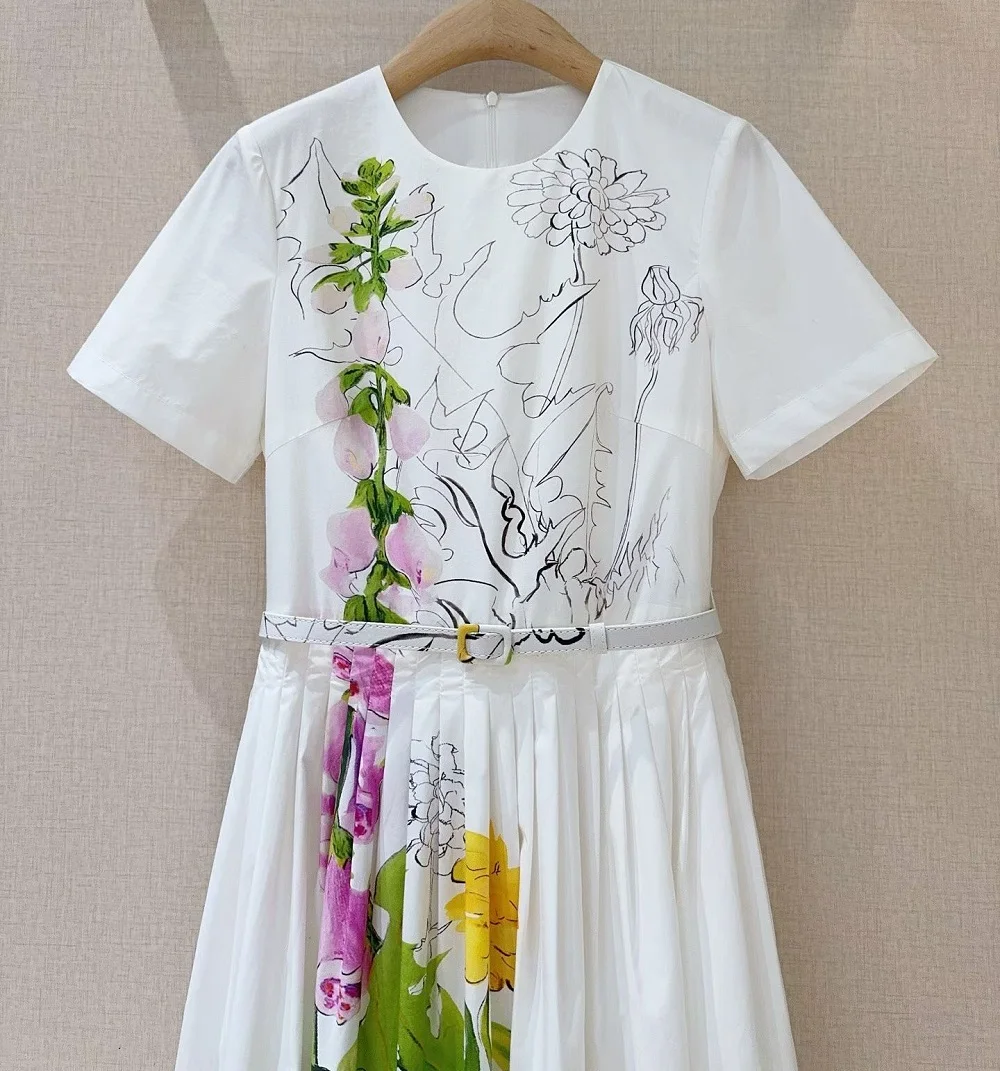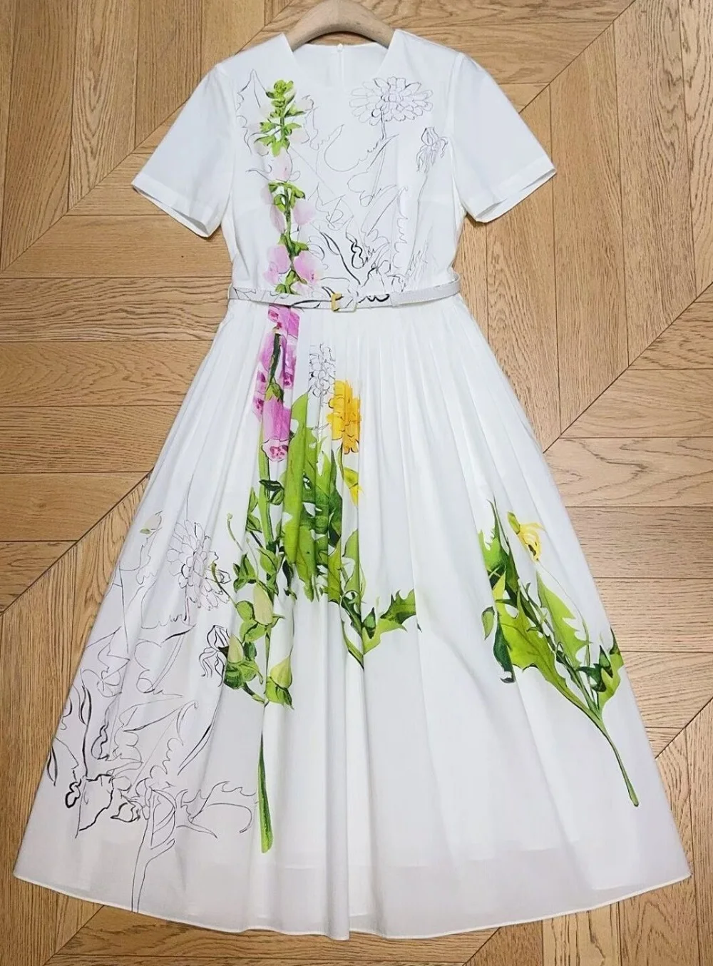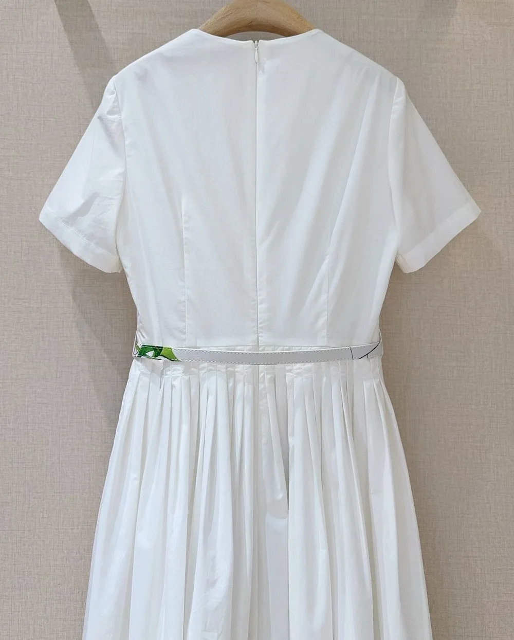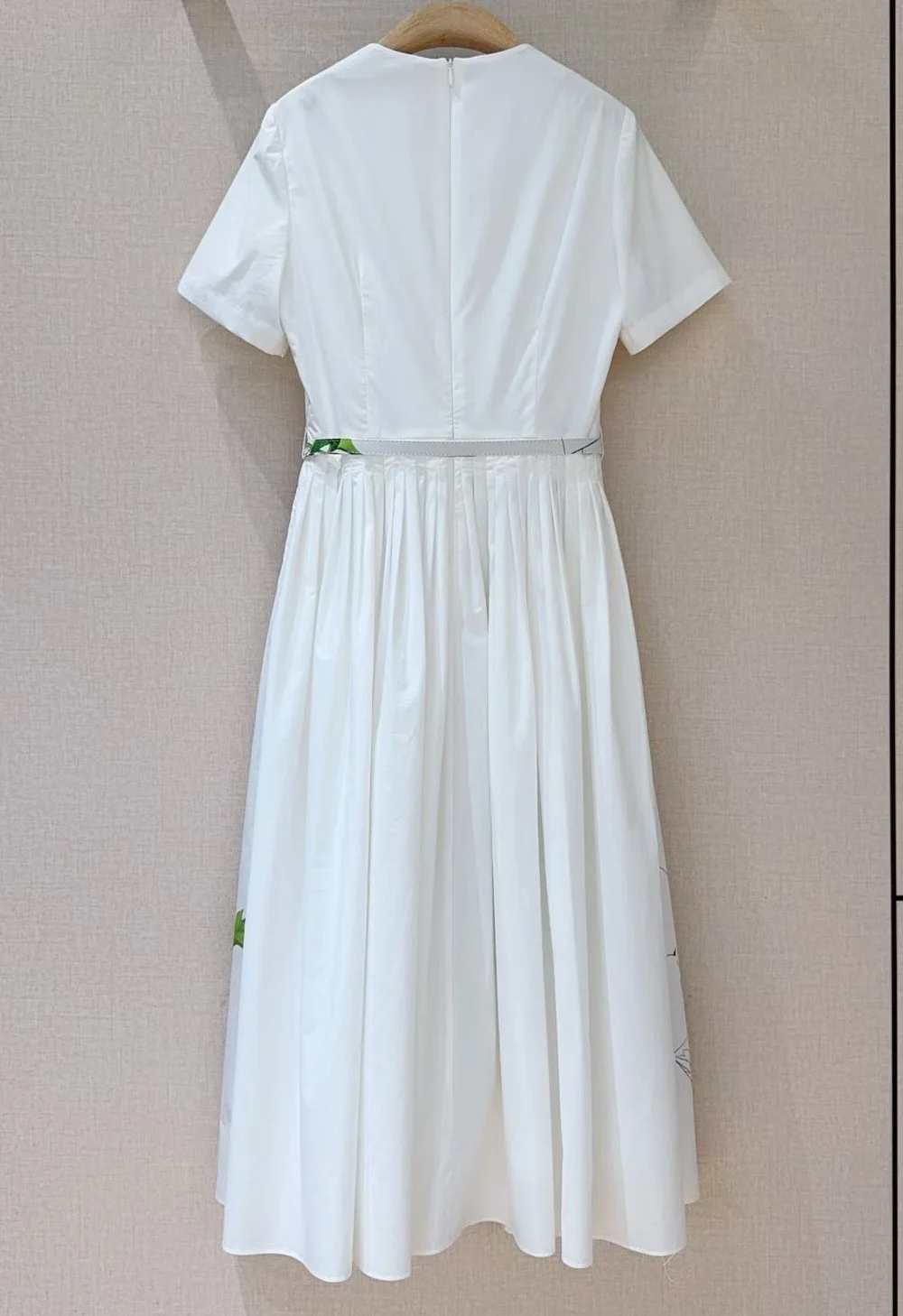 Top Quality New 2026 Spring Summer Dress Women Green Leaves Floral Print Pocket Patchwork Short Sleeve Mid-Calf White Dress
