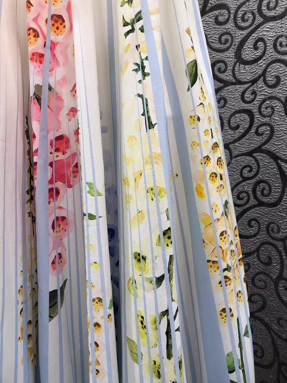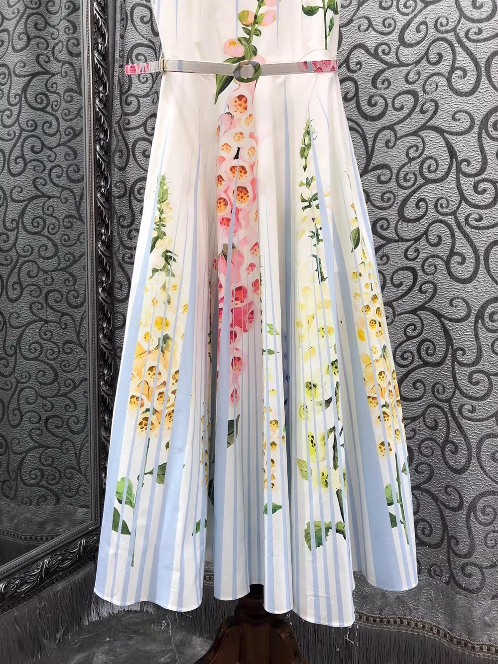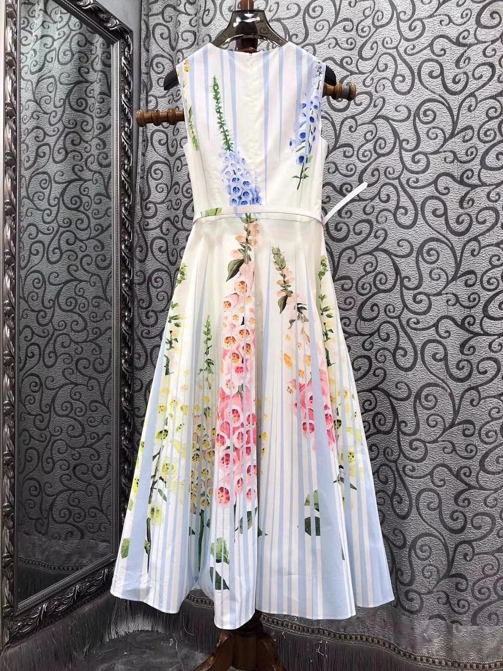 Top Quality New Long Dress 2026 Summer Style Women Sweet Floral Blue Striped Print Sleeveless Long Maxi Party Luxury Dress Belt
