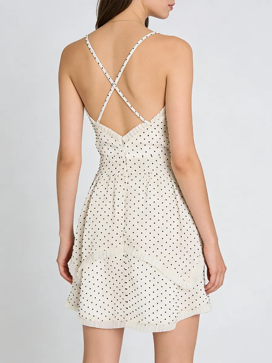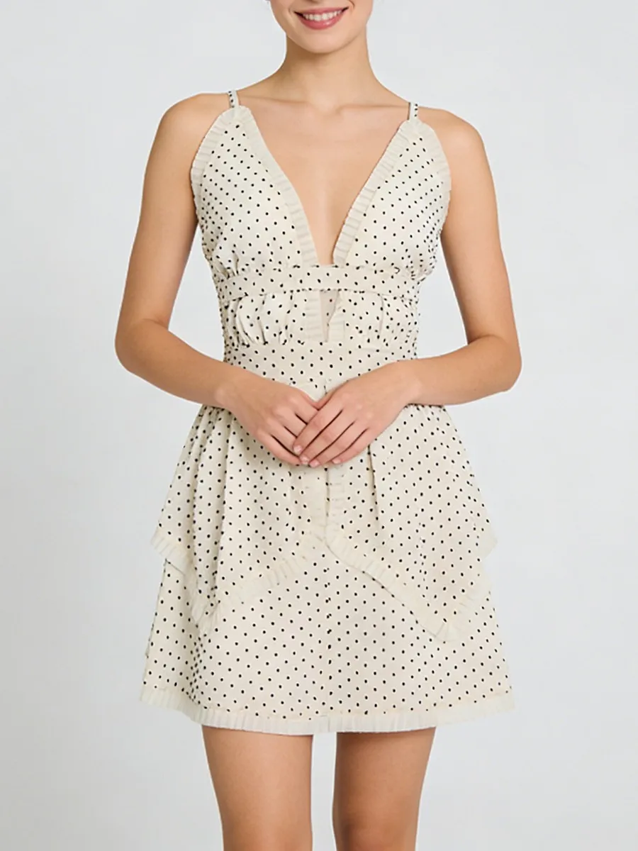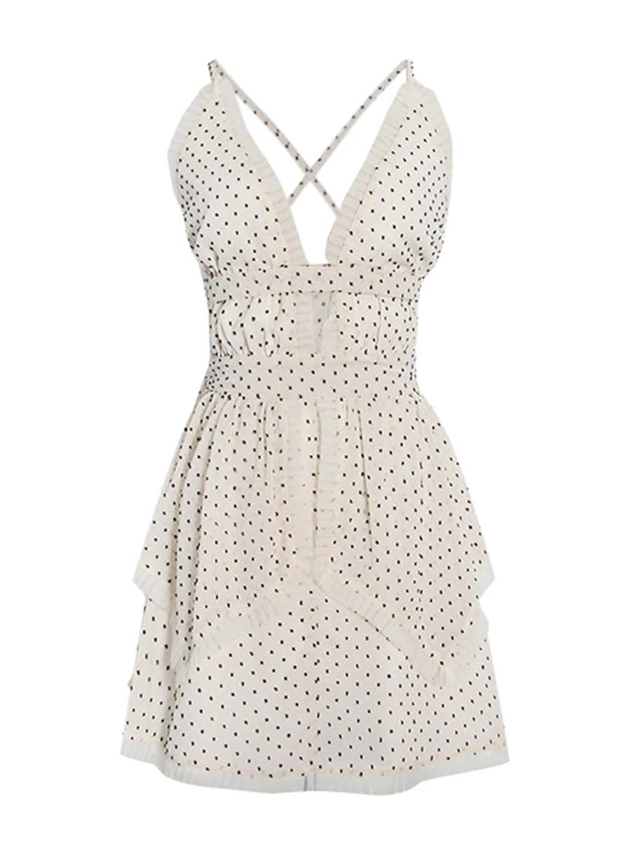 TWOTWINSTYLE Elegant Slimming Spliced Wave Point Mini Dress for Women V Neck Sleeveless Backless Patchwork Ruched Dresses Female