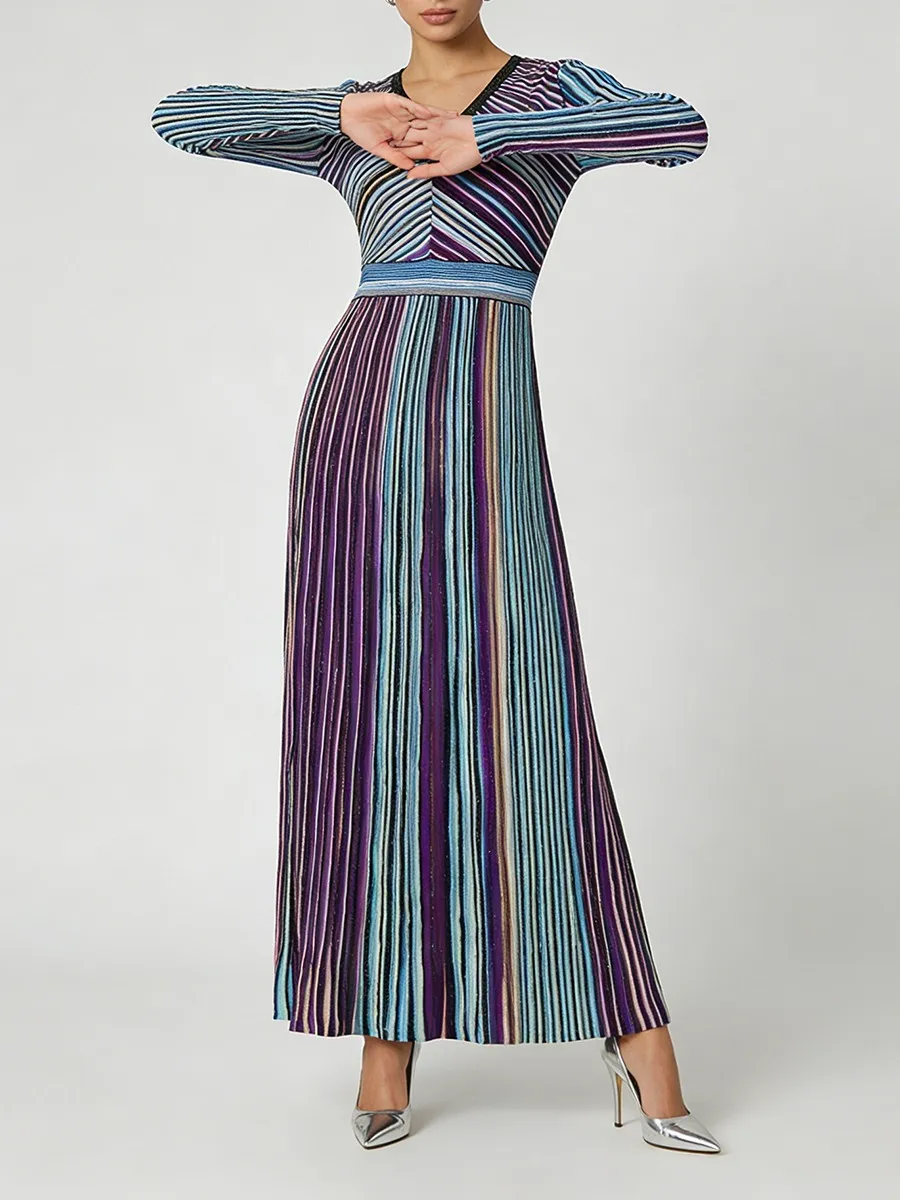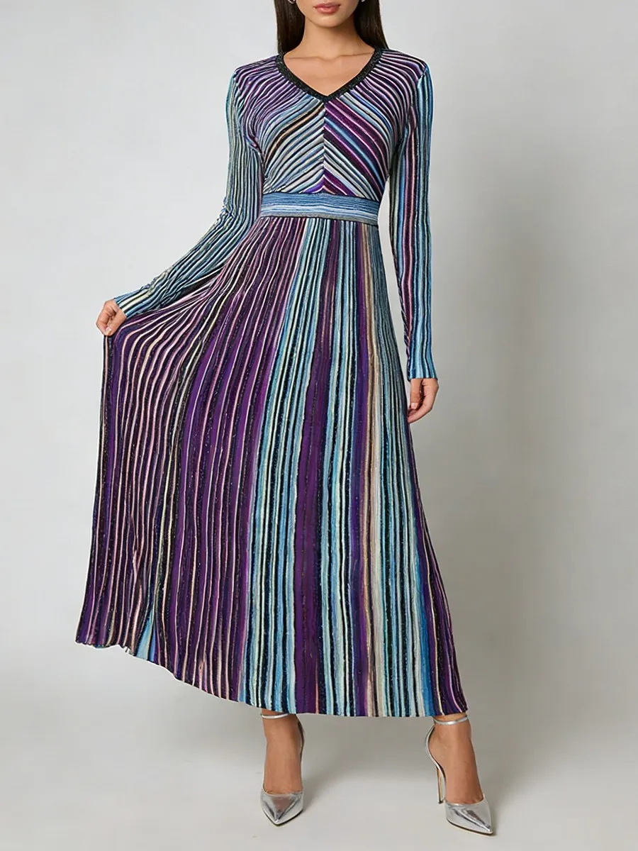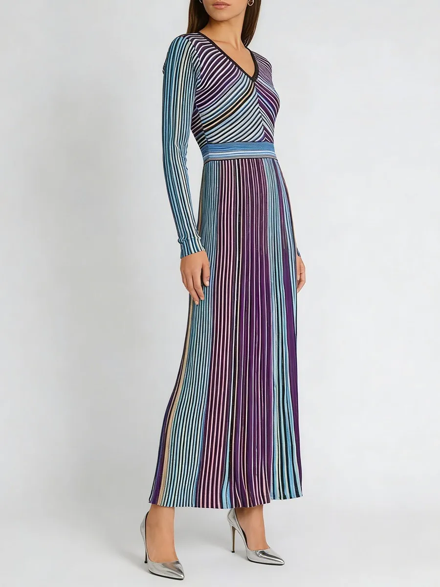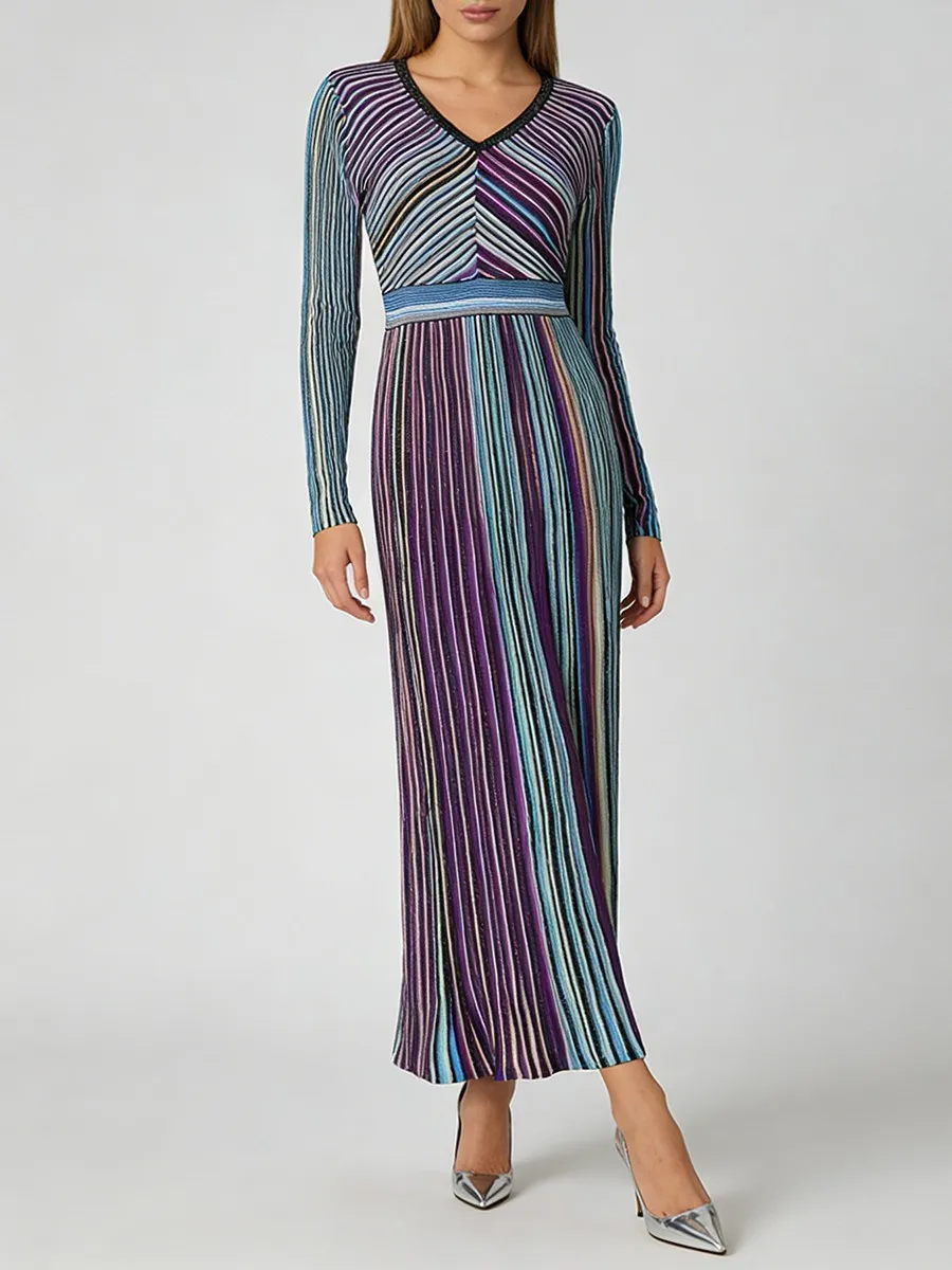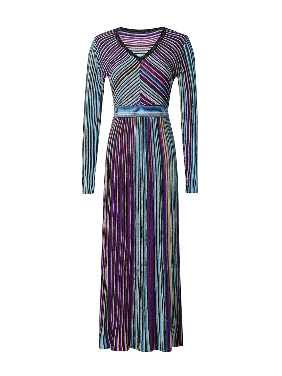TWOTWINSTYLE Hit Color Striped Spliced Bright Silk Fashion Dresses for Women V Neck Long Sleeve High Waist Knit Dress Female New