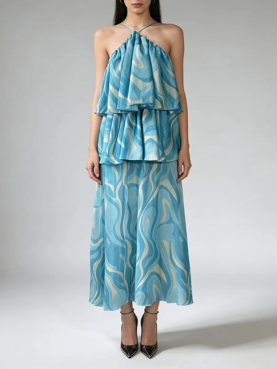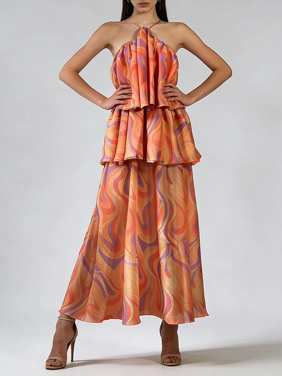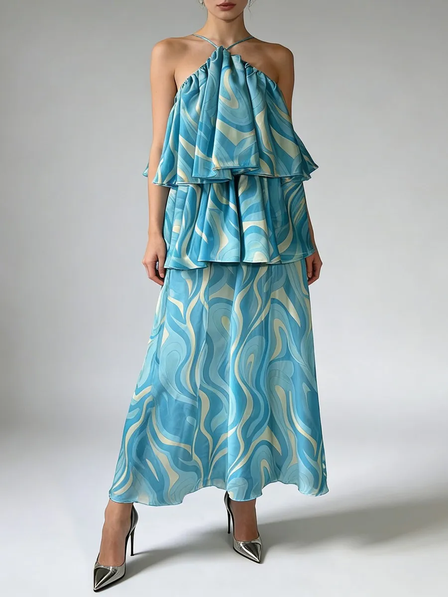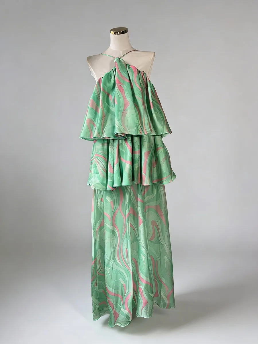 TWOTWINSTYLE Printing Sheer Spliced Ruffles Folds Fashion Dresses for Women Strapless Sleeveless Design Sense Long Dress Female