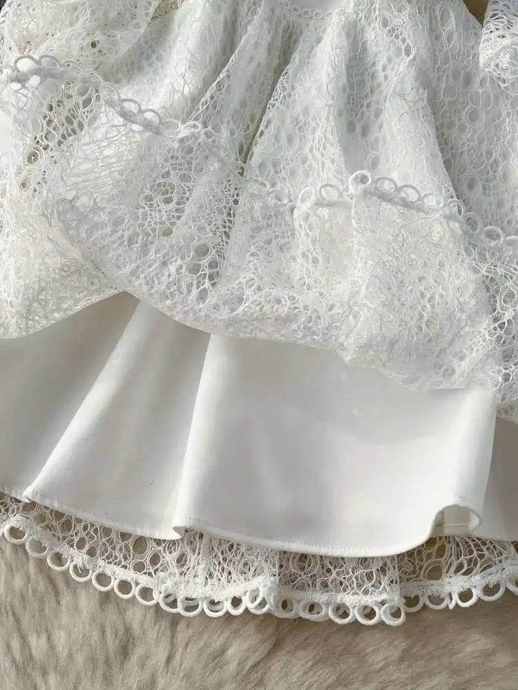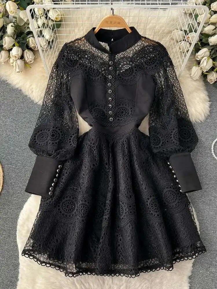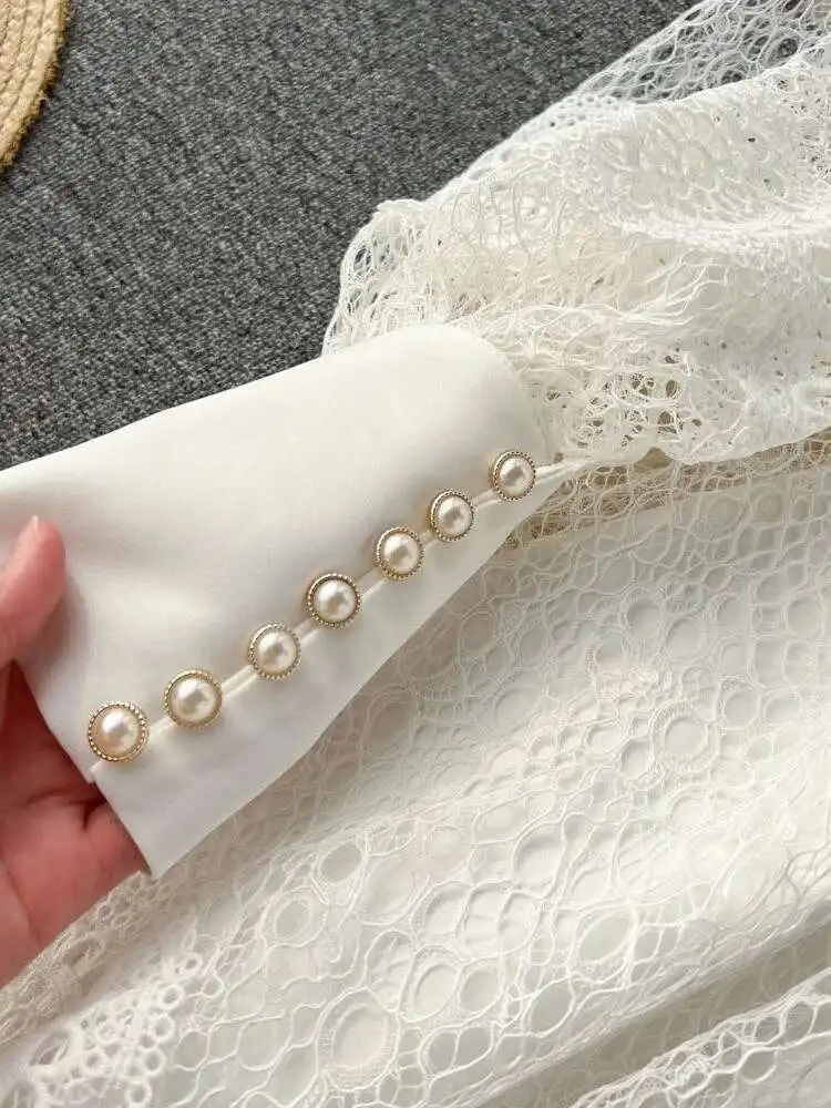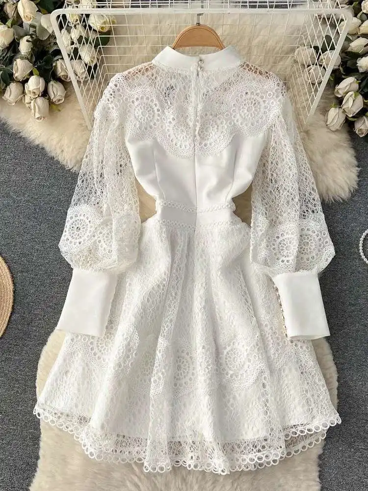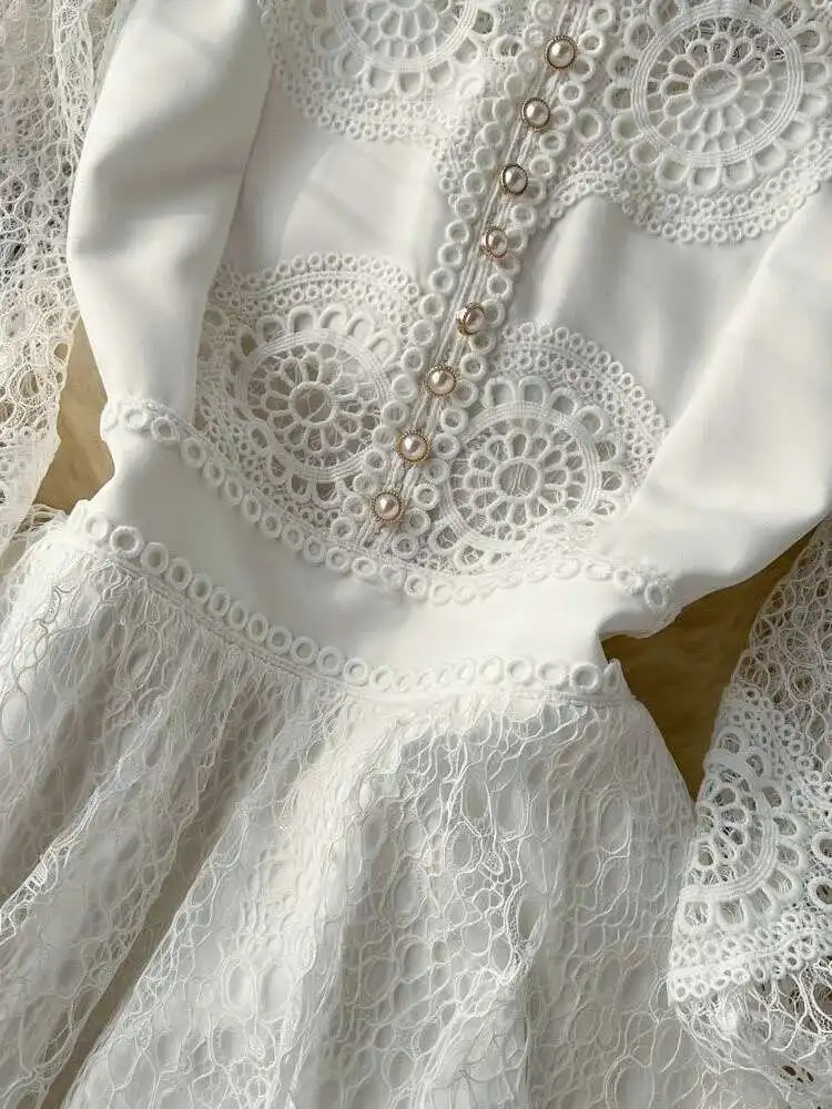 Vintage Flower Embroidery Hollow Out Lace White Dress Women's Stand Collar Long Lantern Sleeve Pearls Buttons Party Vestidos