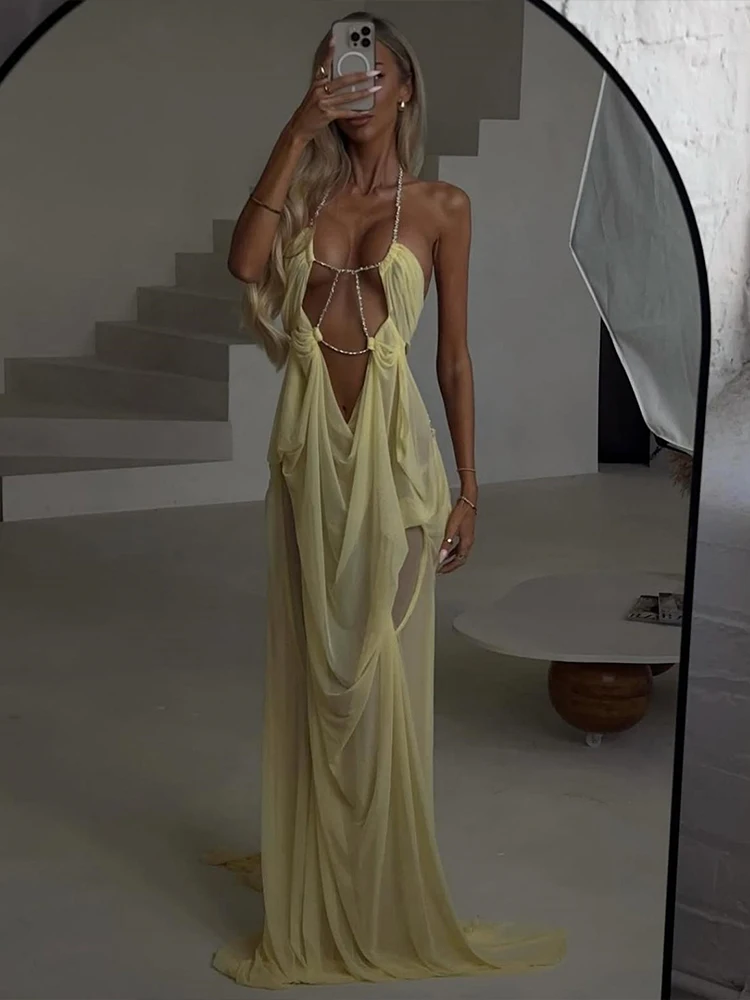 Weird Puss Sexy See Through Dress Women Sexy Halter Chain Backless Irregular Ruched Patchwork Vacation Birthday Party Clubwear