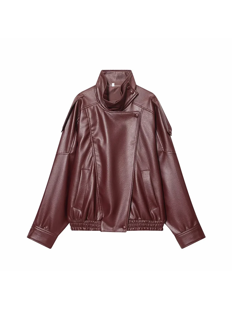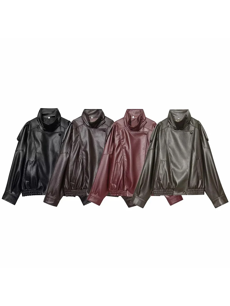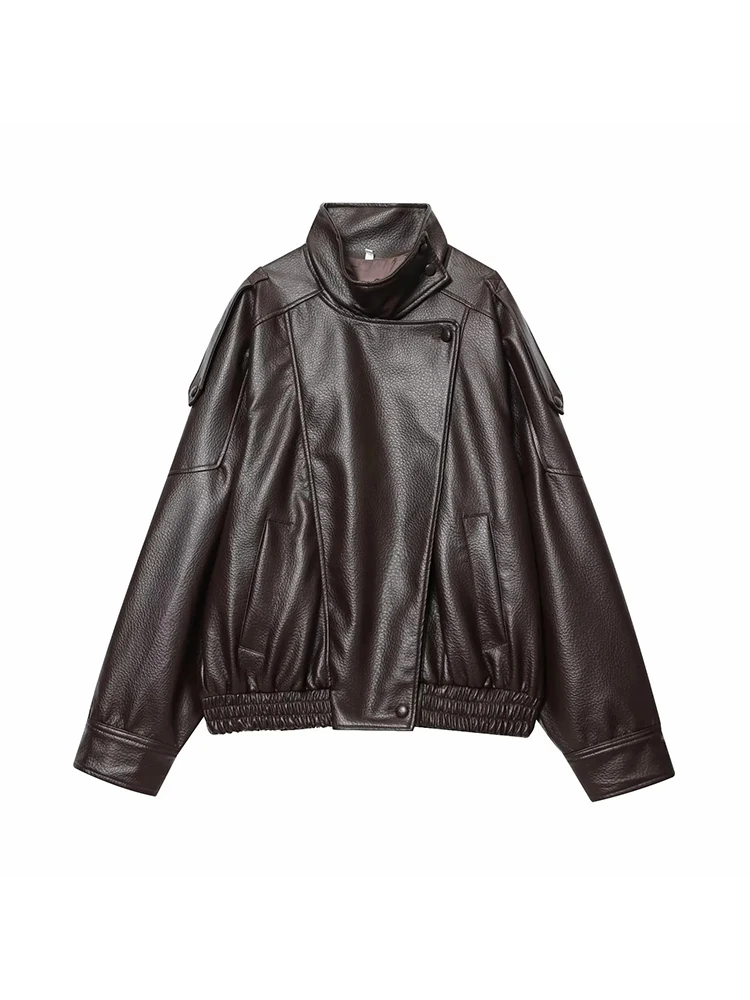 Women Faux Leather Loose Jacket High Street Stand Collar Long Sleeve Coat Fashion Causal Zipper Outwear Autumn Winter