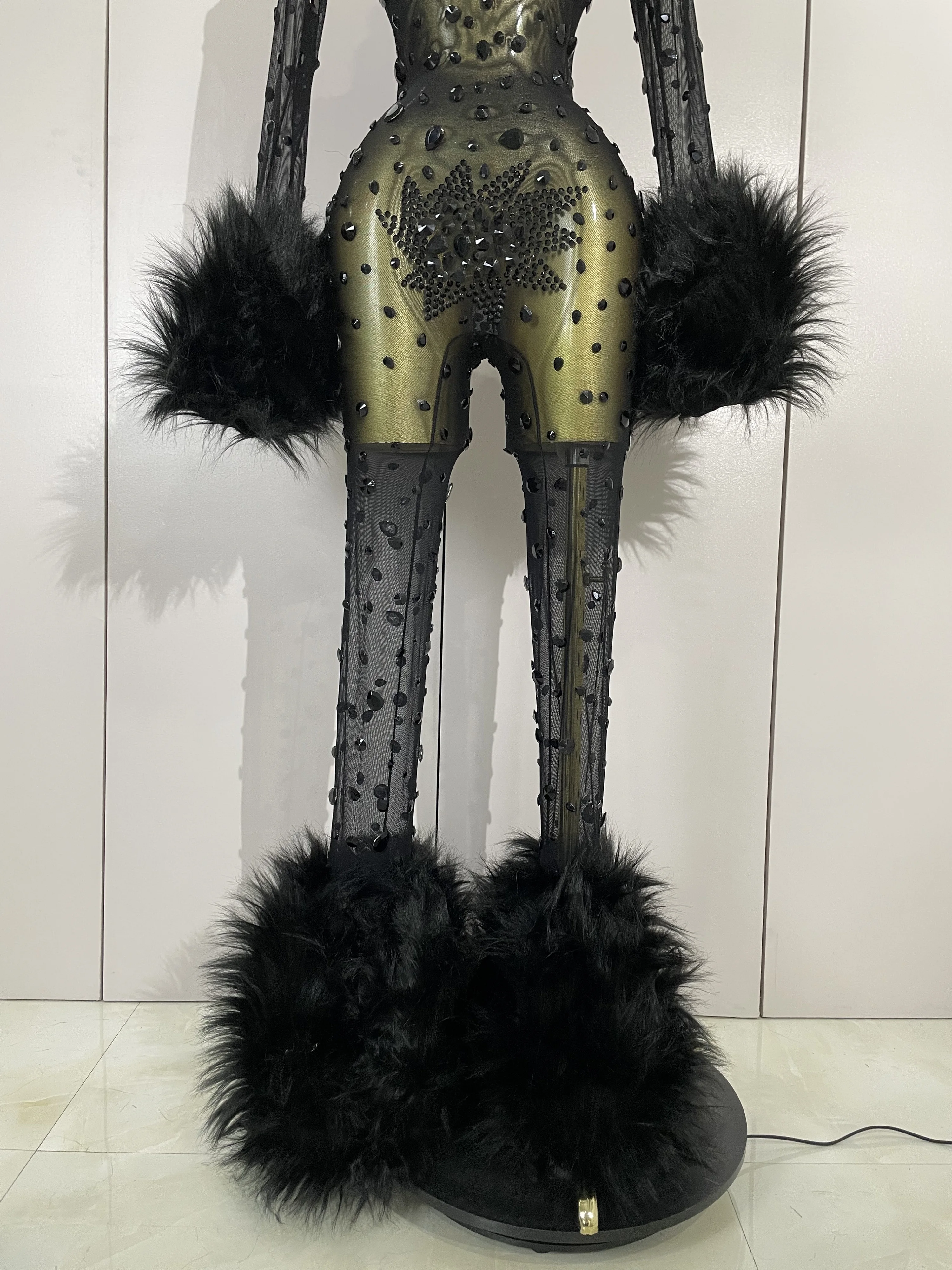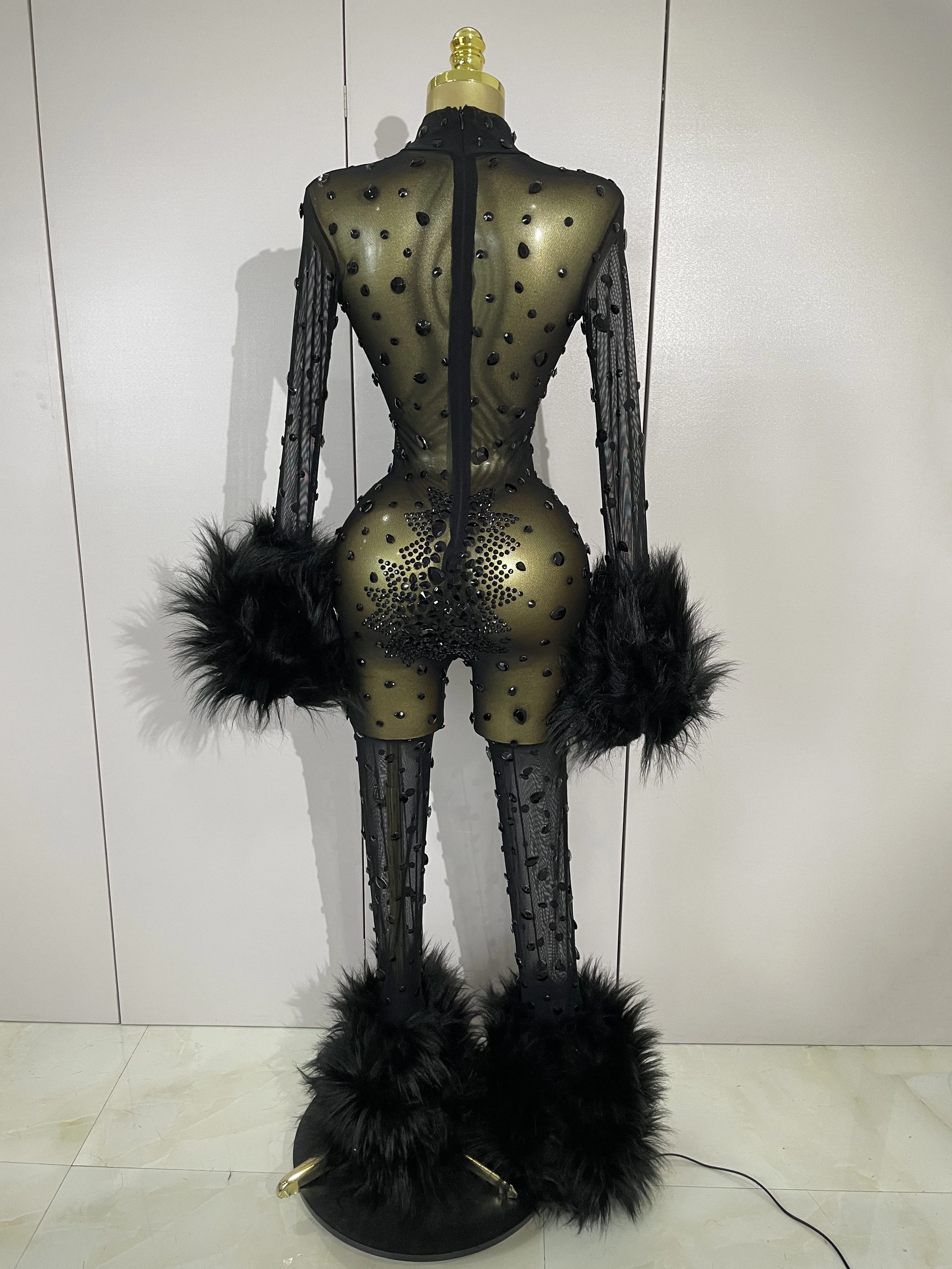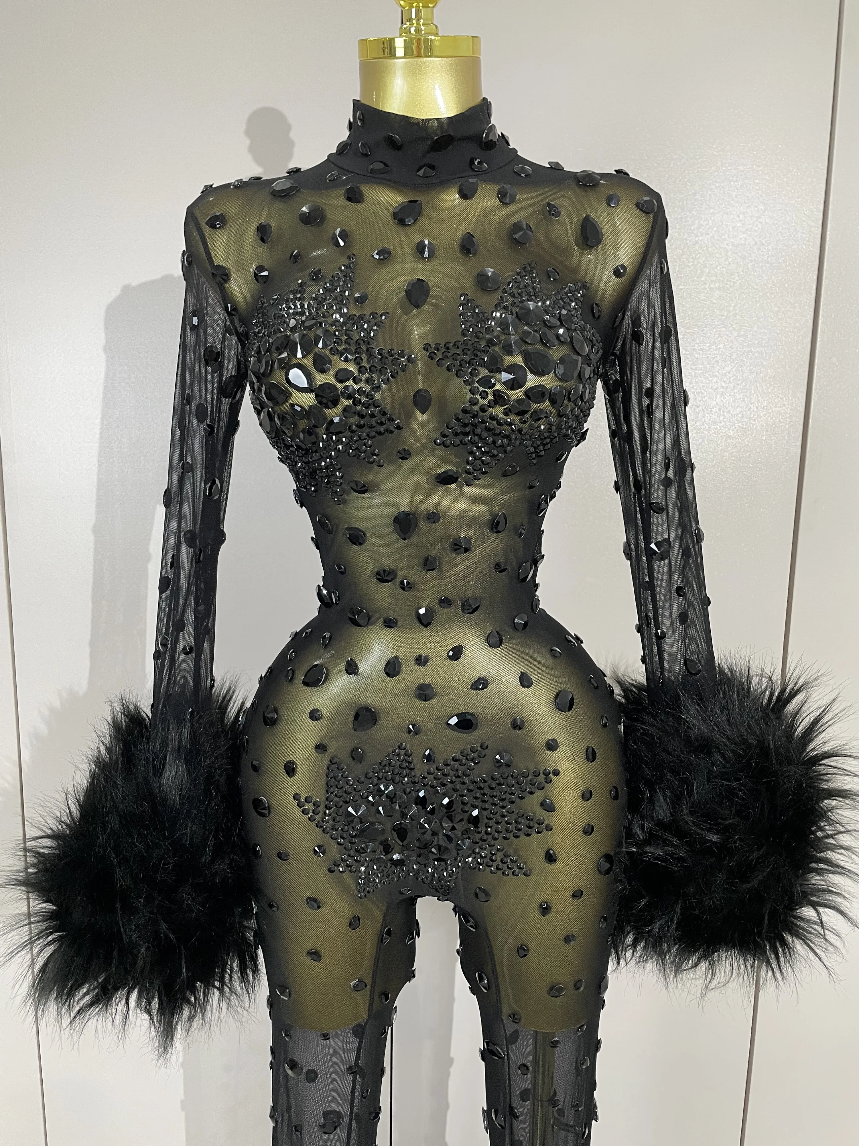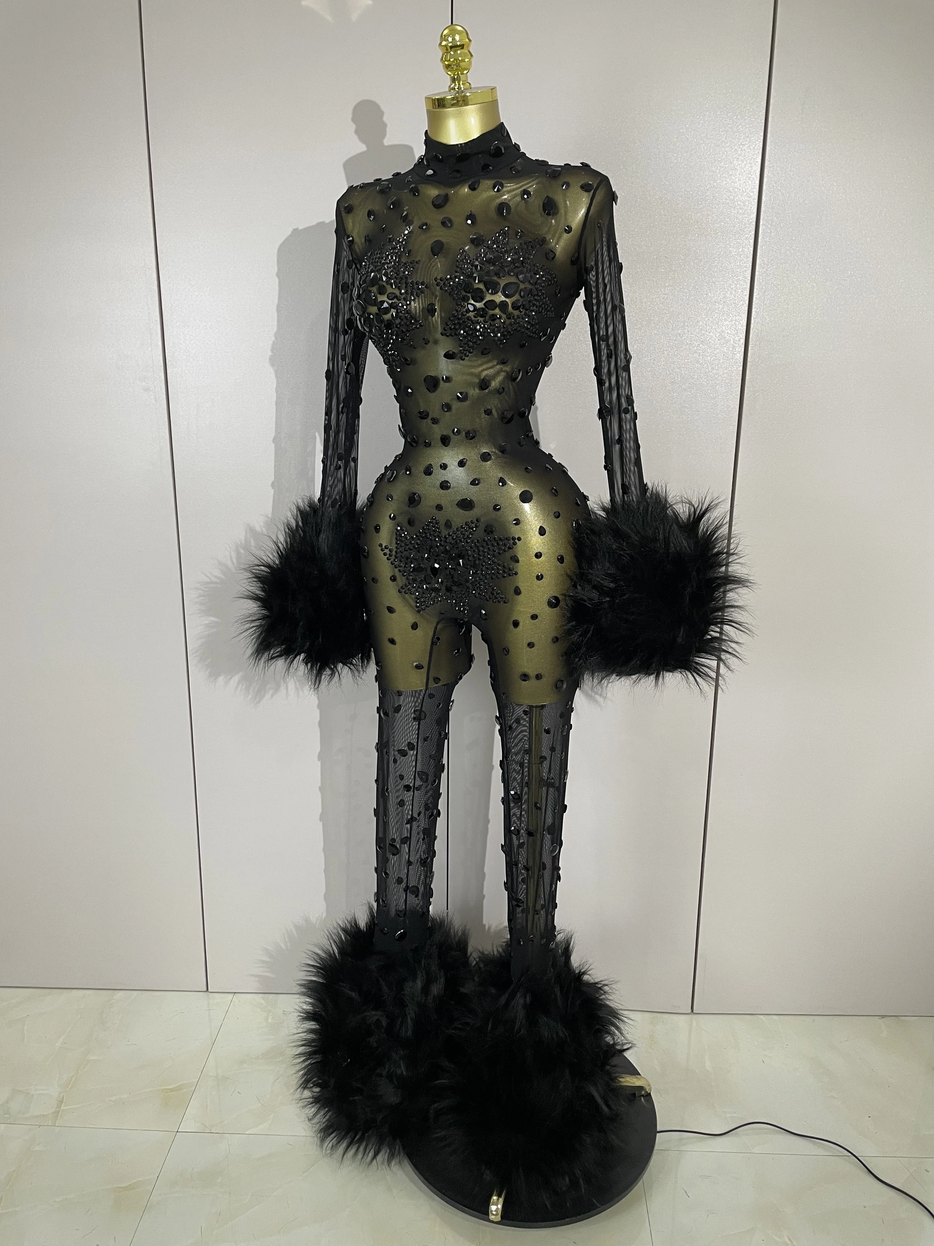STOCK Luxury Diamond Black Mesh Transparent Stretchy Long Sleeve Jumpsuit Women Sexy Performance Singer Costume Nightclub Outfit