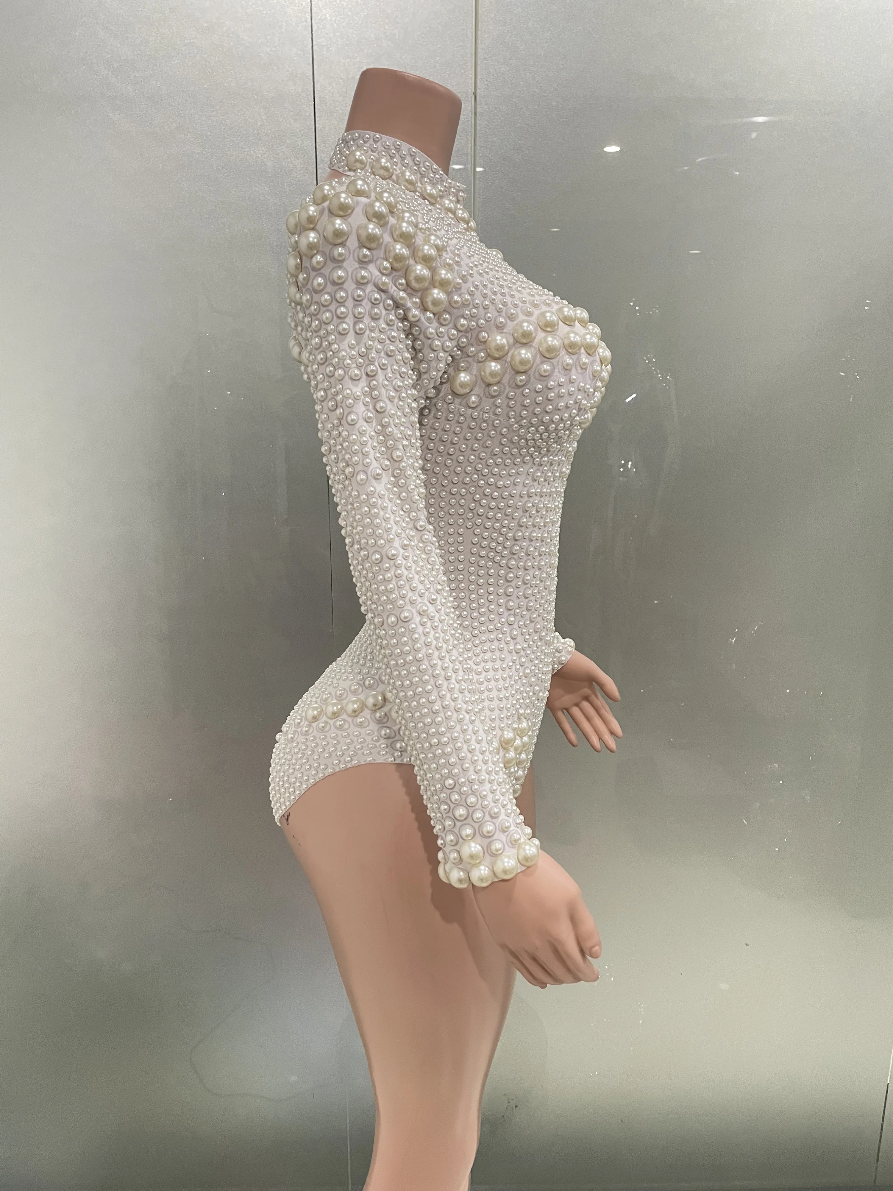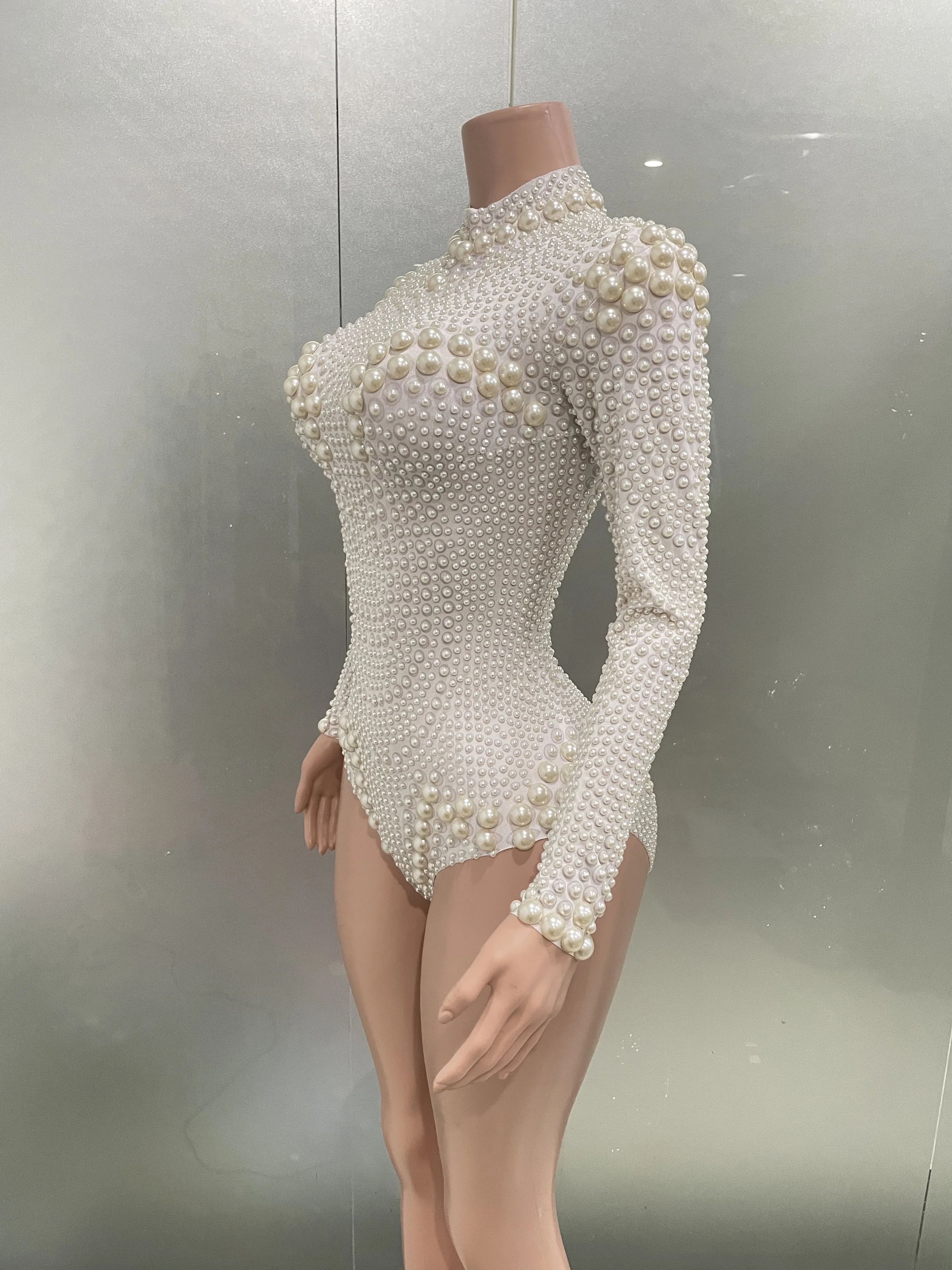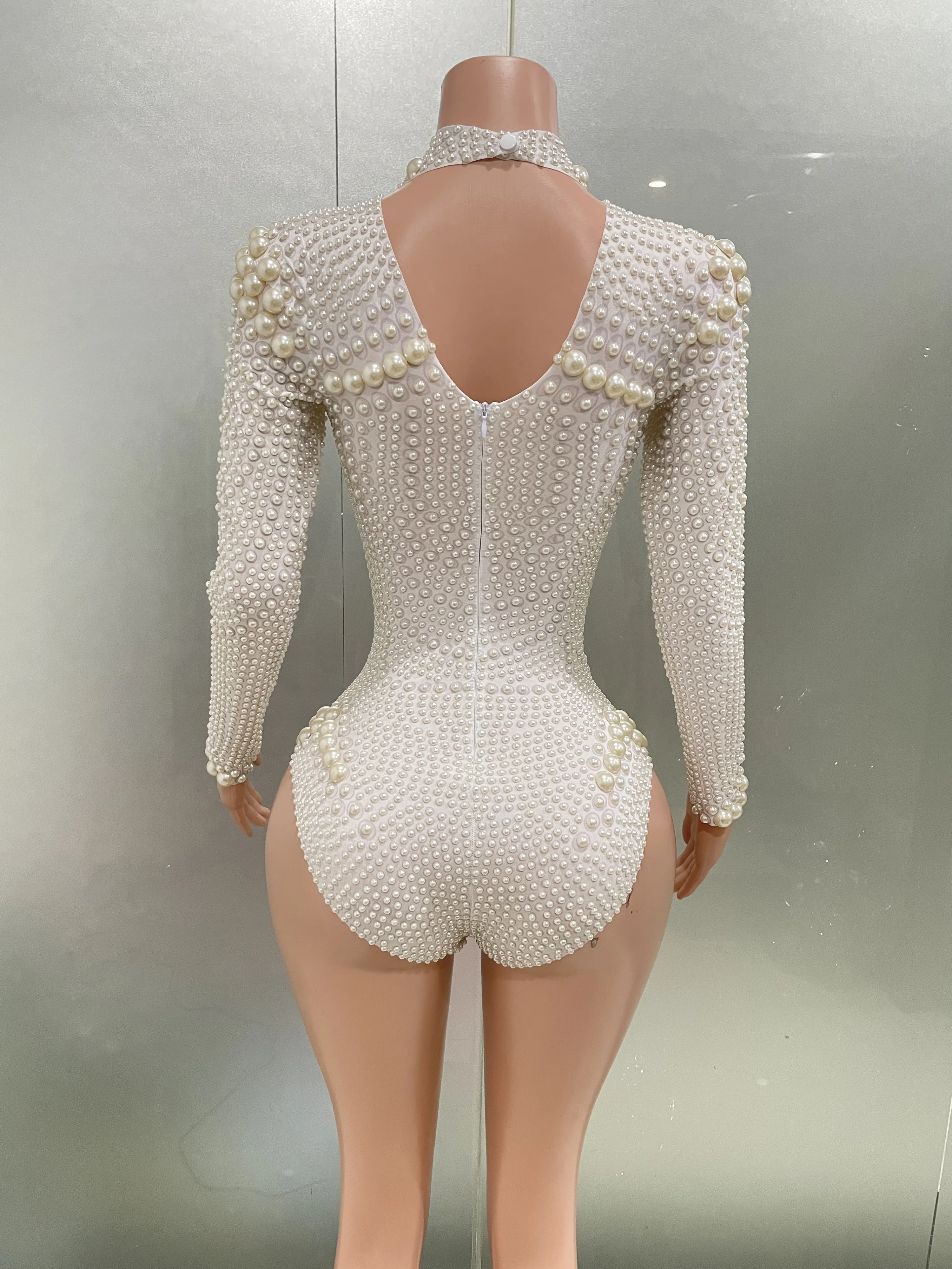 Women Sexy White Pearl Long Sleeved Elastic Tight Fitting Jumpsuit Club Party Dress DJ Female Singer Stage Performance Dress