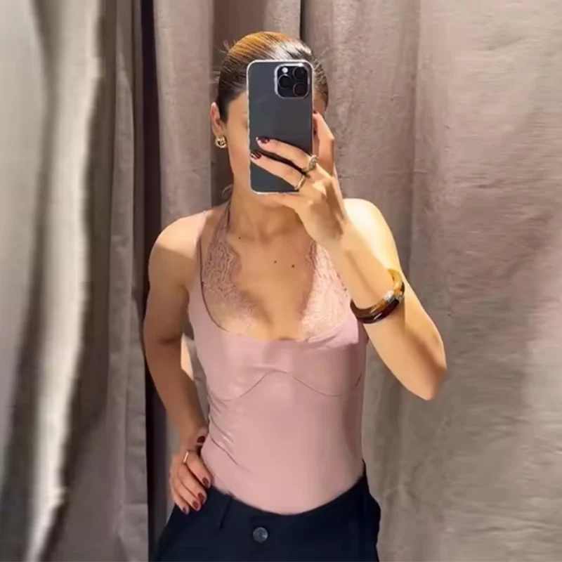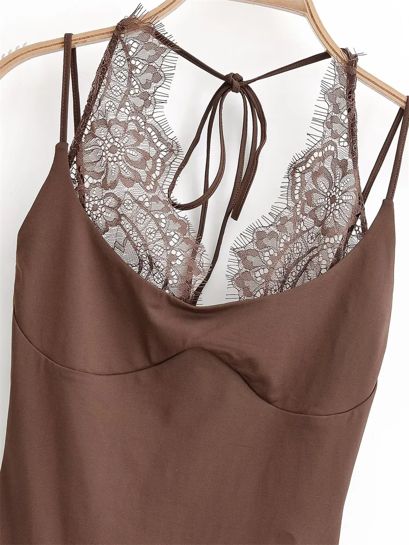 Women's Bodysuit 2026 New Fashion Spring Summer Brown Spliced Lace Bodysuit for Women Chic Personality Spaghetti Strap Bodysuit