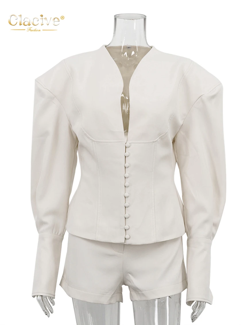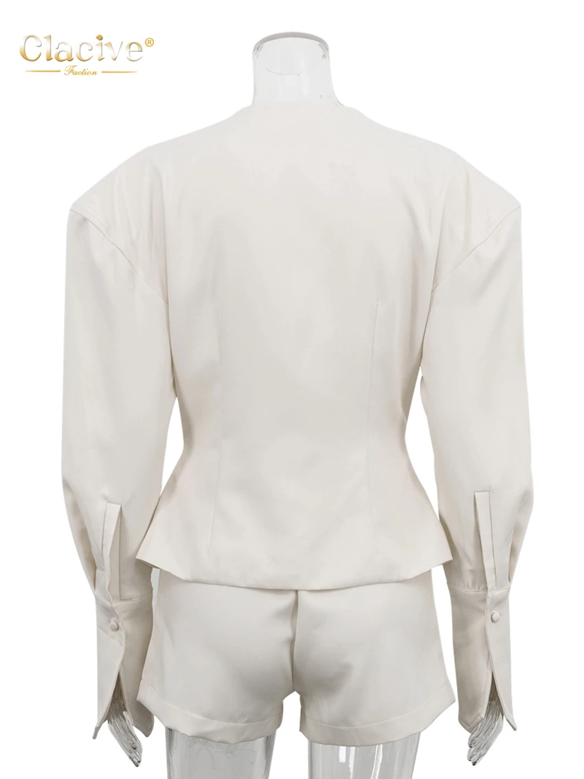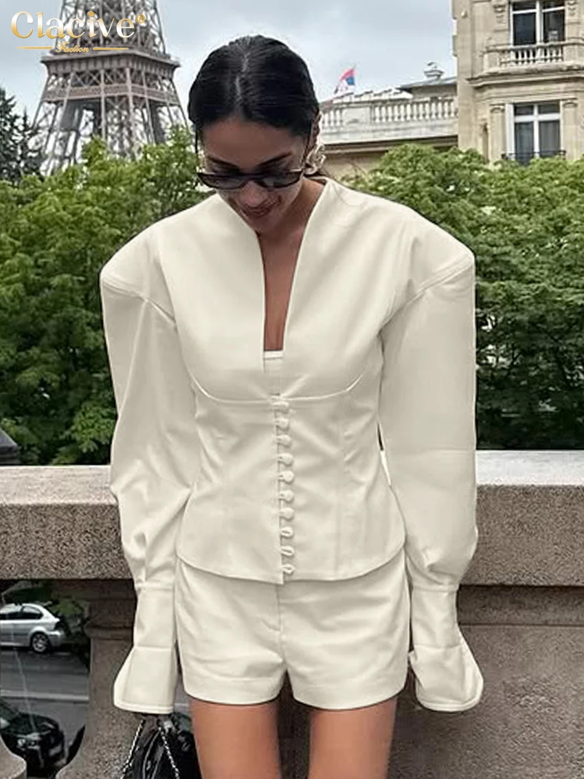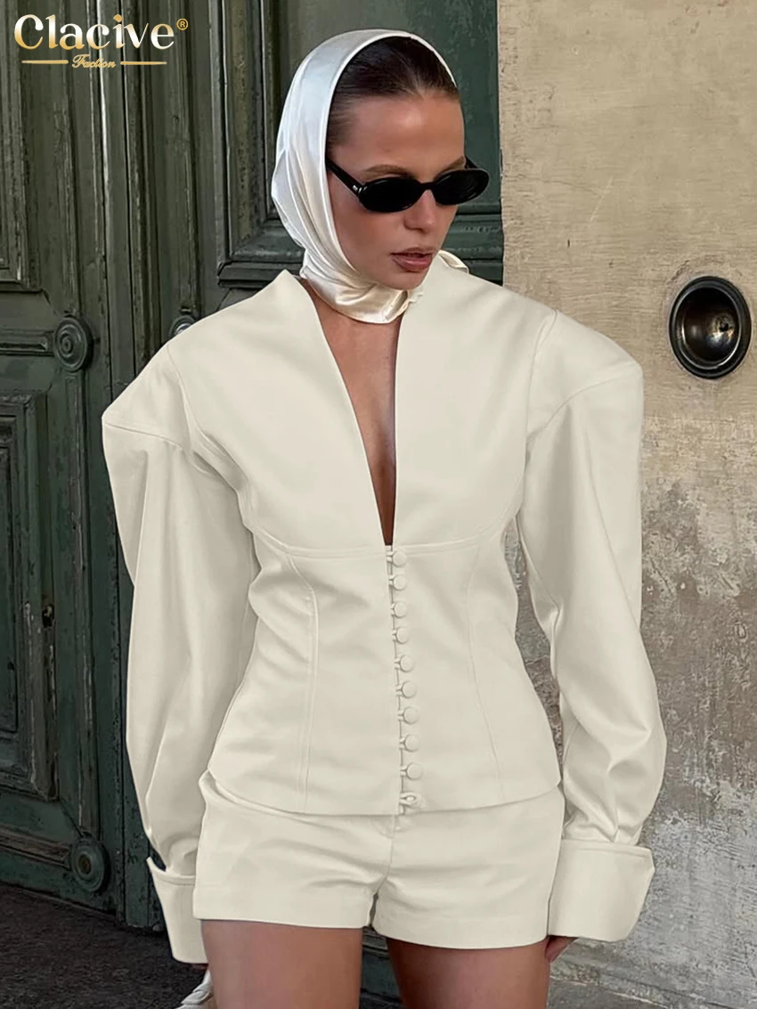 Clacive Fashion Loose Beige Women's Two Pieces Set 2025 Sexy Long Sleeve Shirt With High Waist Shorts Set Female Streetwear