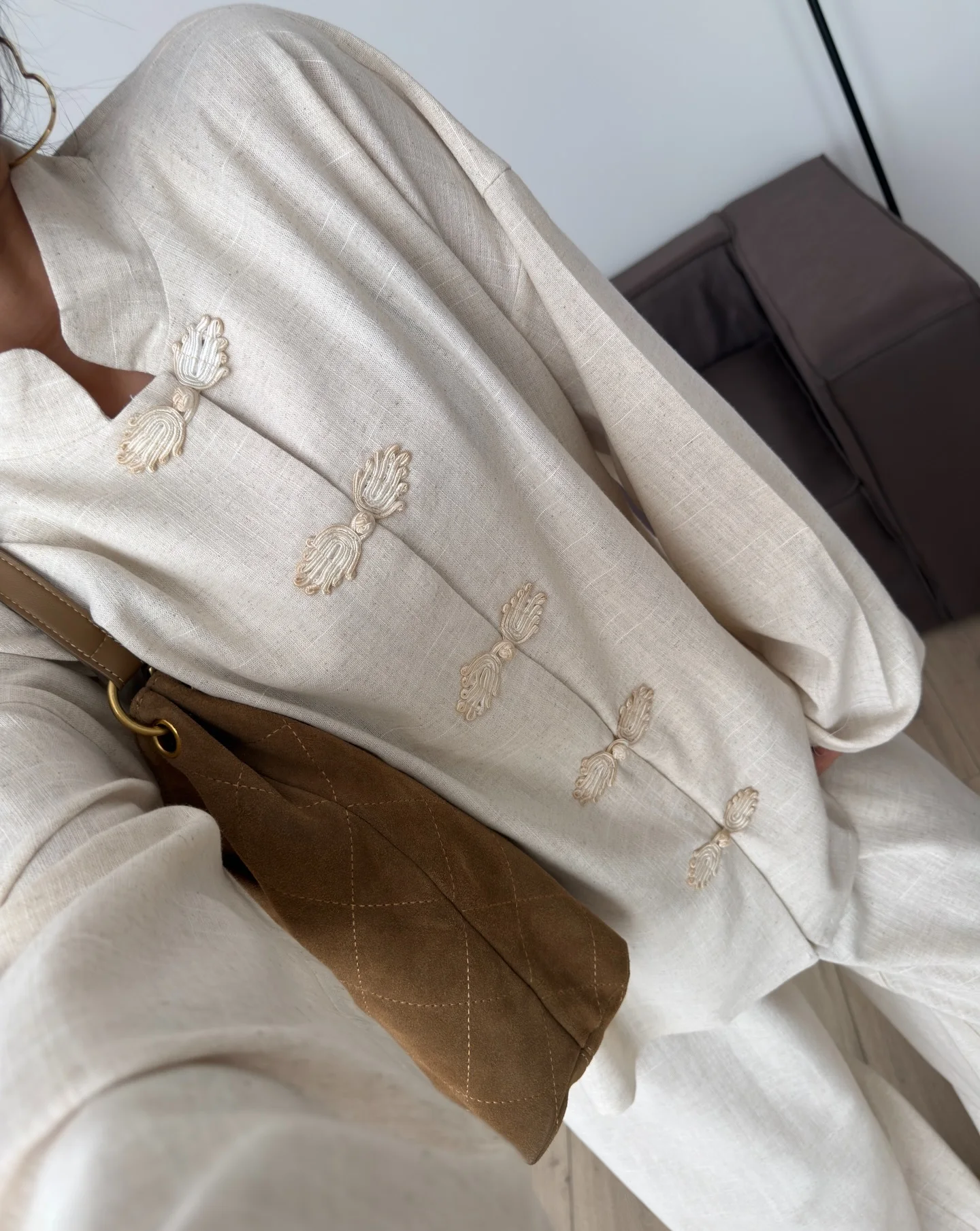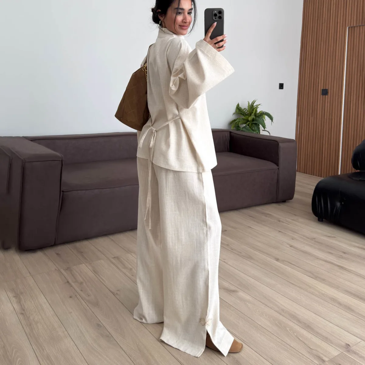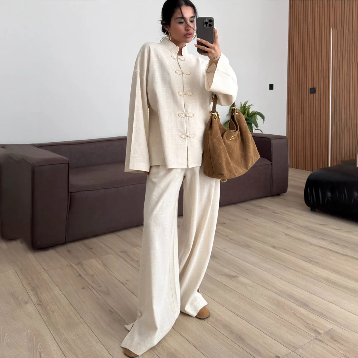 KT Women's Elegant Beige Set Mandarin Collar Frog Button Loose Shirt & Pants Casual & Daily Wear 2026