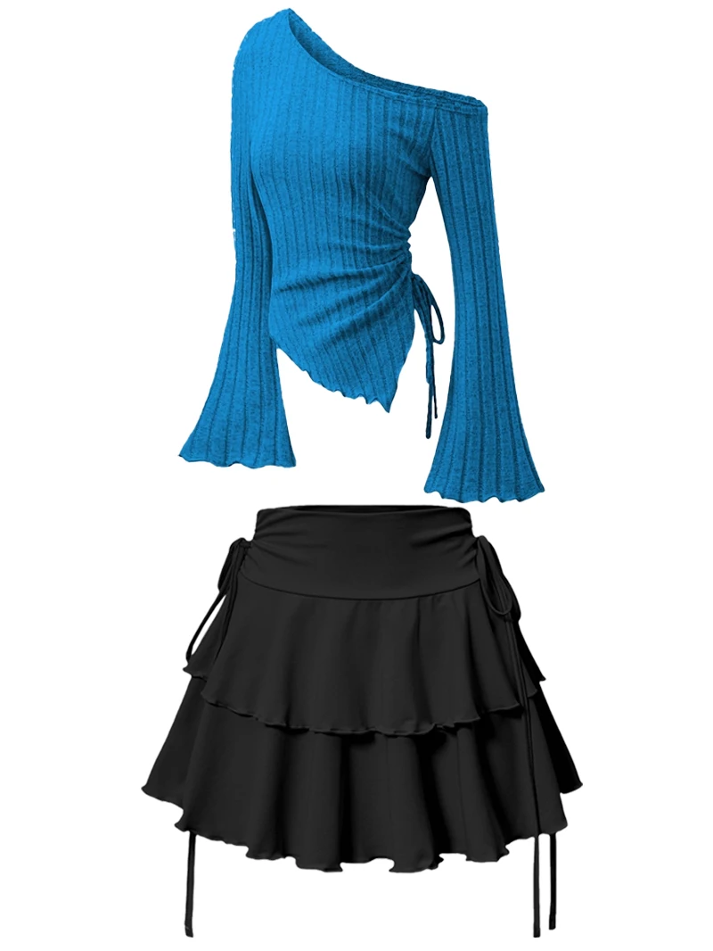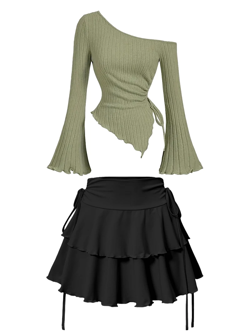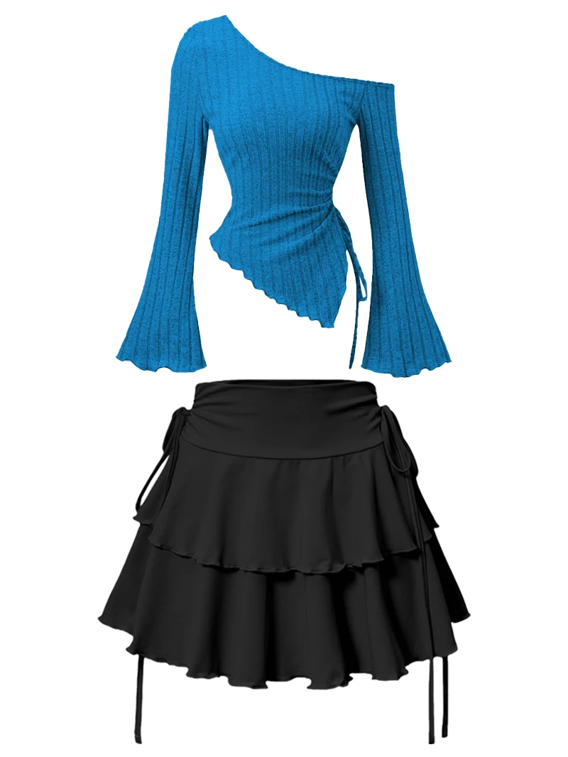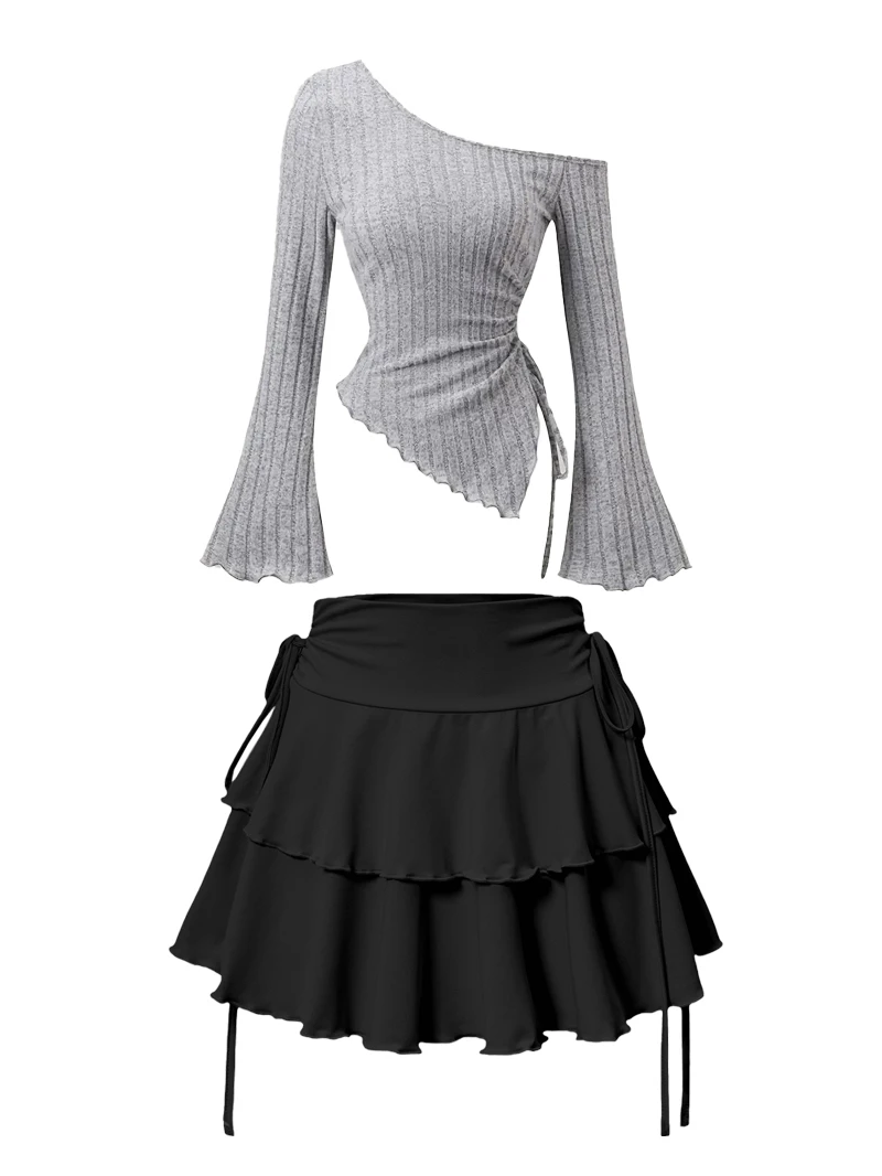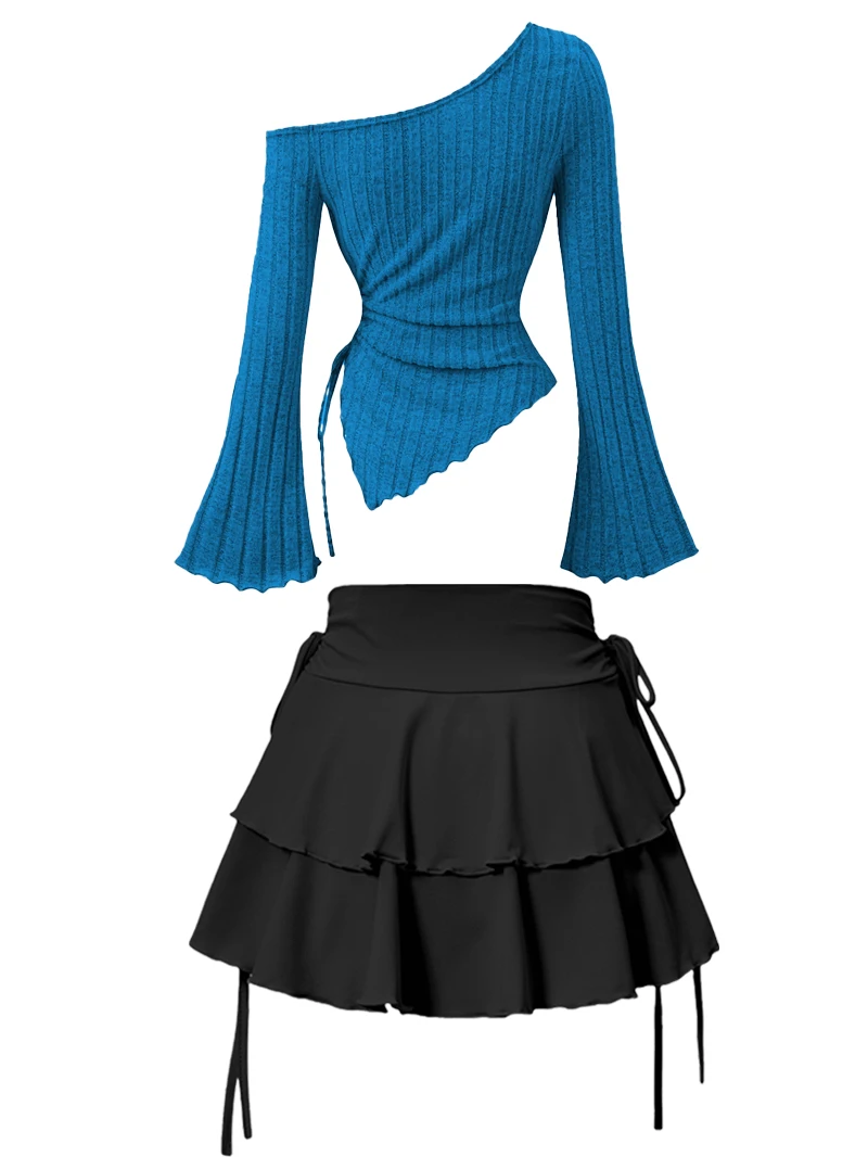 New Fashion Women's Half Skirt Summer Casual Elastic High Waist Slim Skirt Long Sleeve Slant Shoulder Sexy T-shirt Top 2-Piece