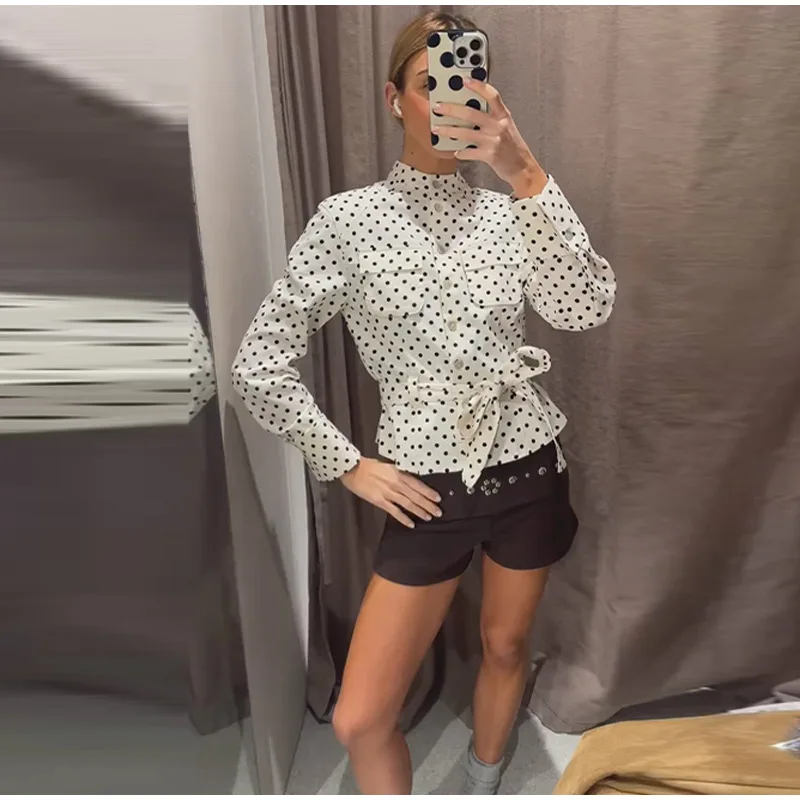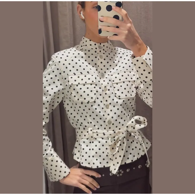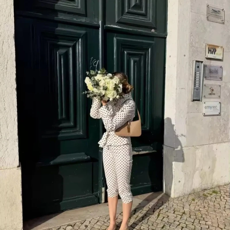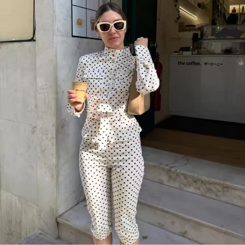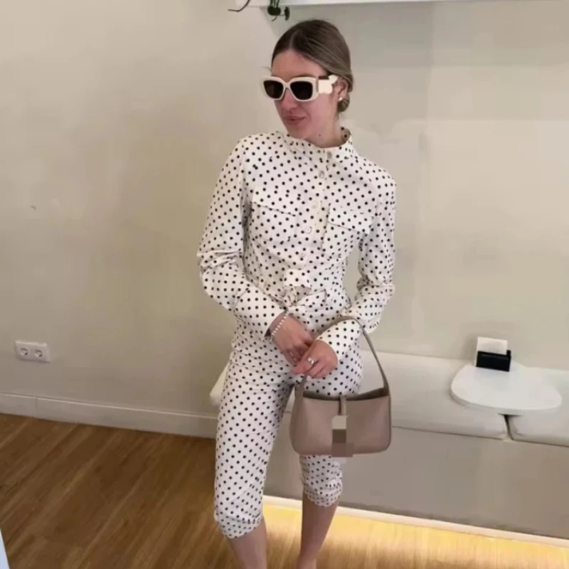 Women Polka Dot Jacket With Cropped Pants 2 Piece Set Stand Neck Single Breasted Lace Up Top High Waist Slim Pants Set Lady Sets