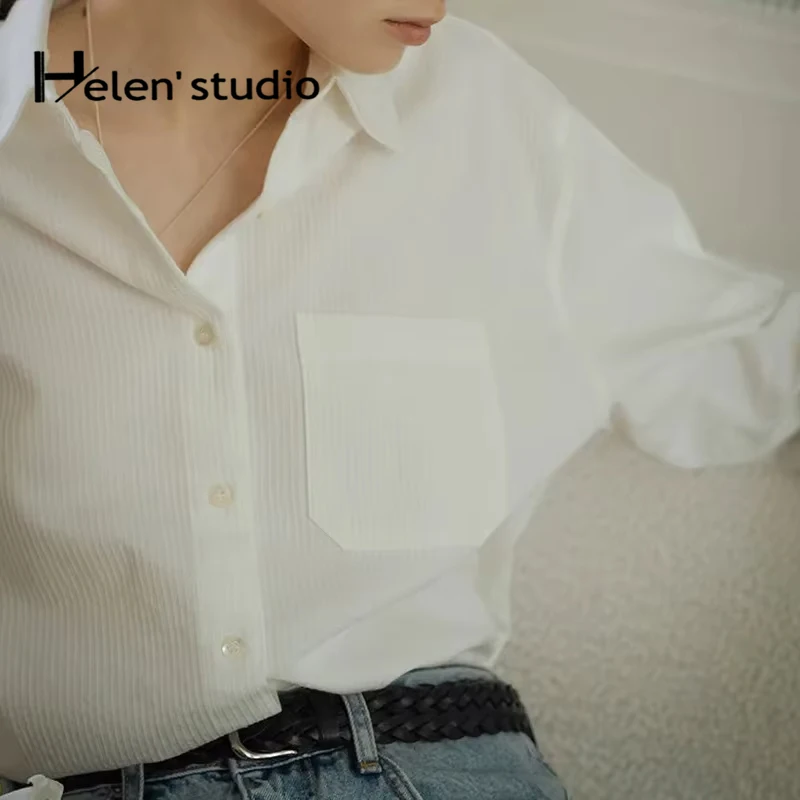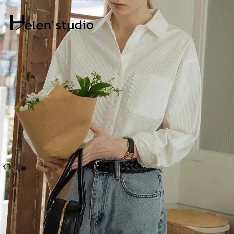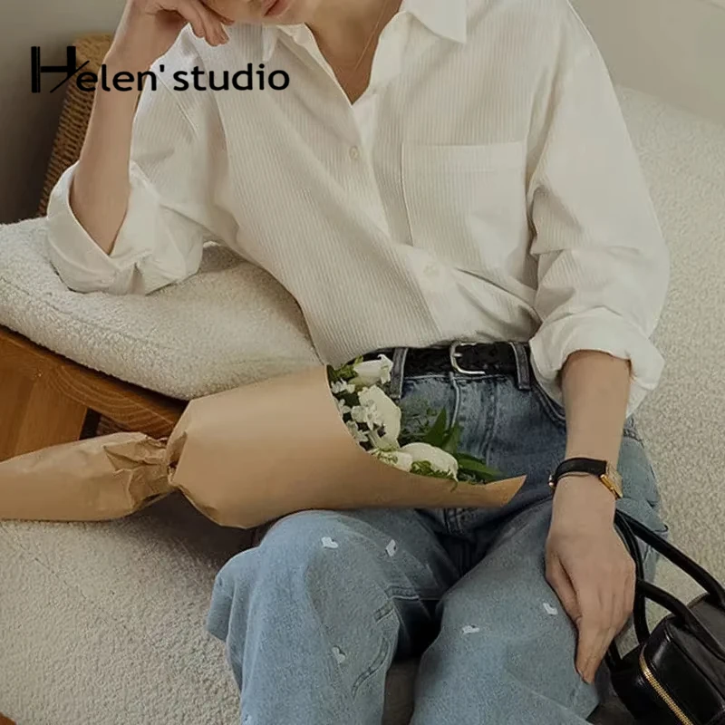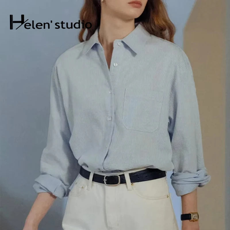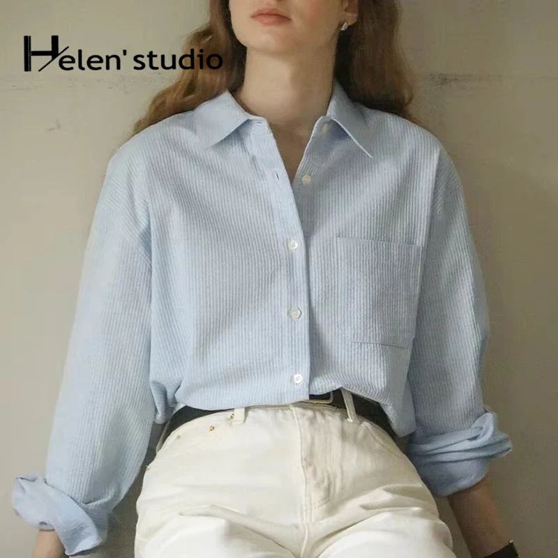 Elegant Original 100% Cotton Blue Shirt Women's Blouses And Shirts Quality Office Lady Long Sleeve Top Vintage Female Clothing