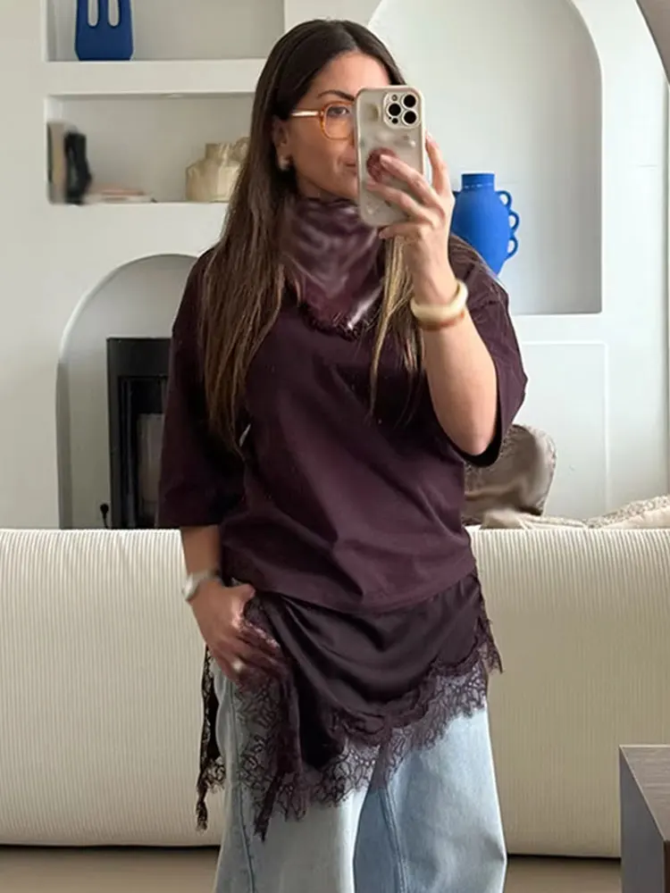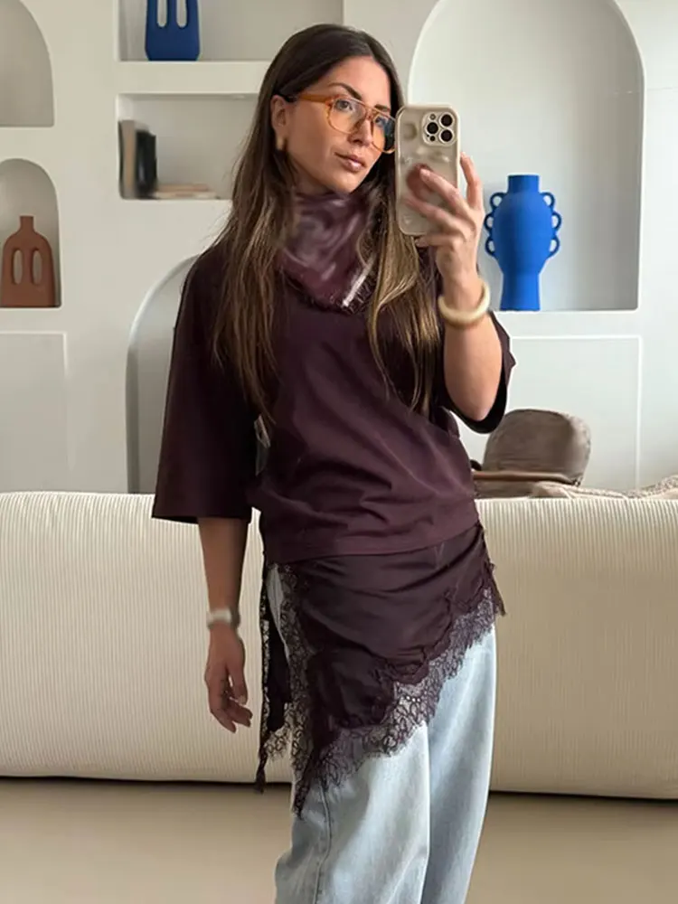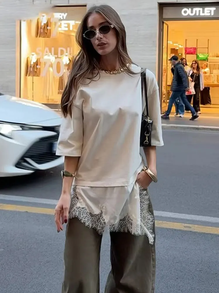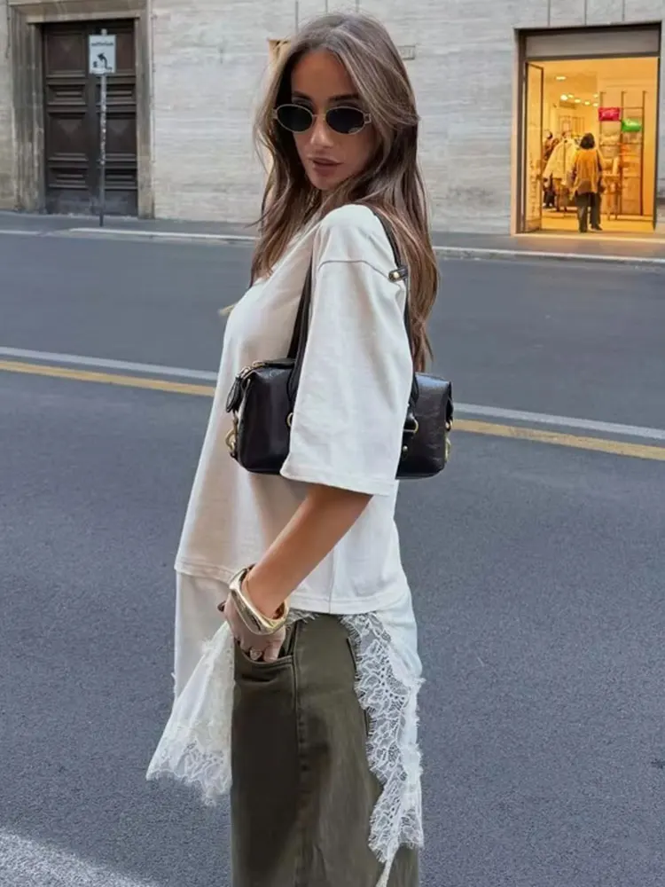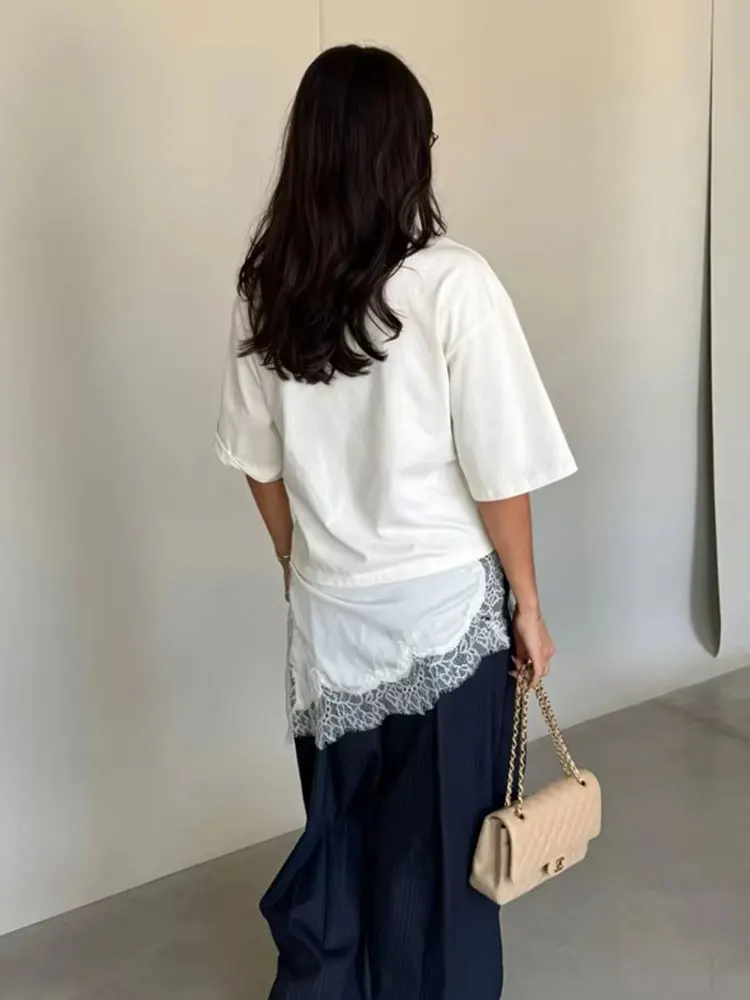 HH Women Elegant Fashion Asymmetrical Lace Hem Patchwork Blouse Short Sleeve O Neck Shirt 2026 Spring Trend Streetwear Y2K Tops