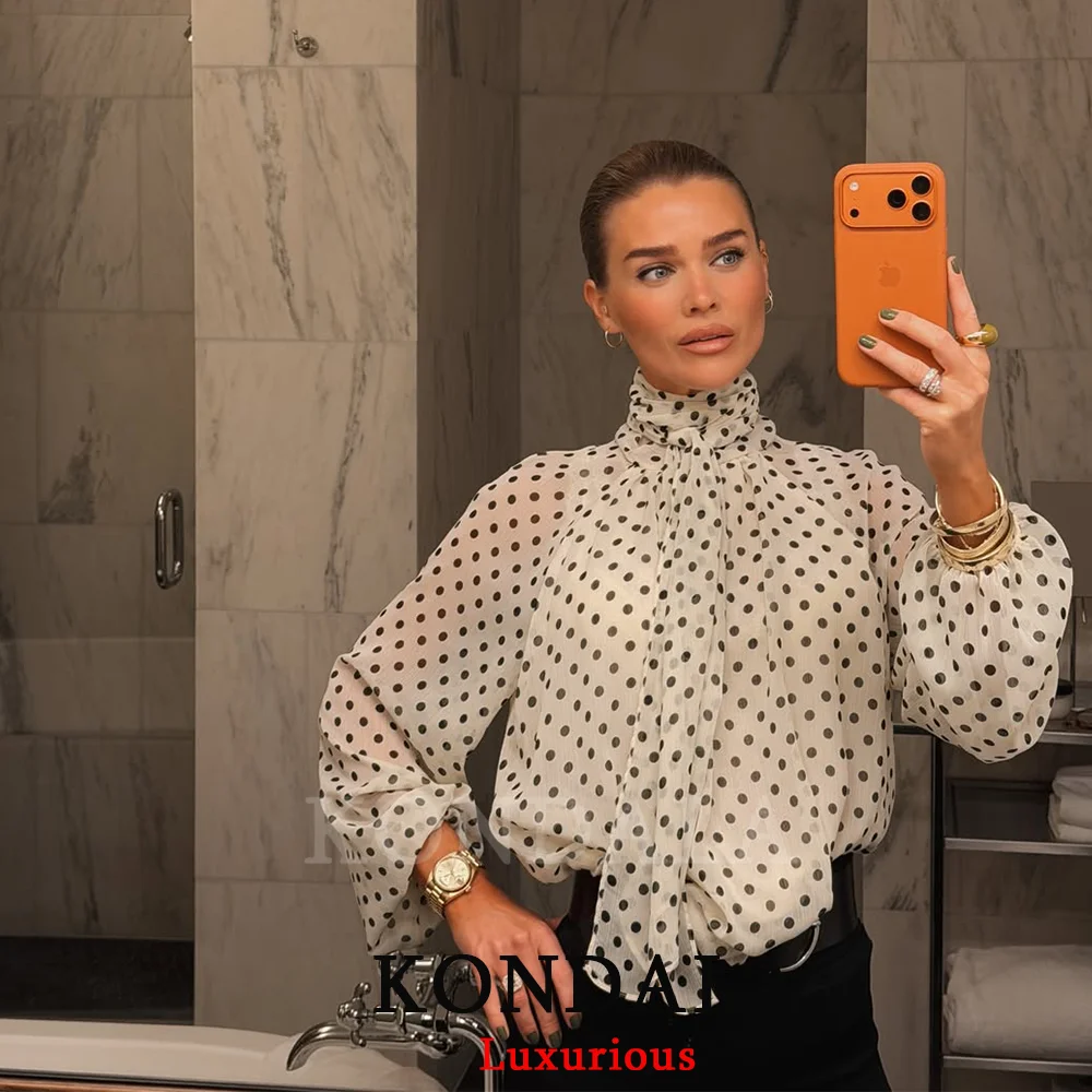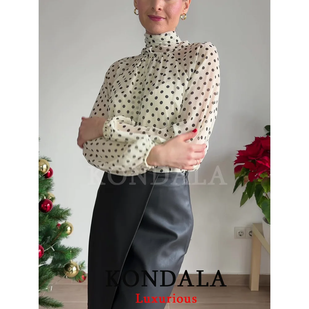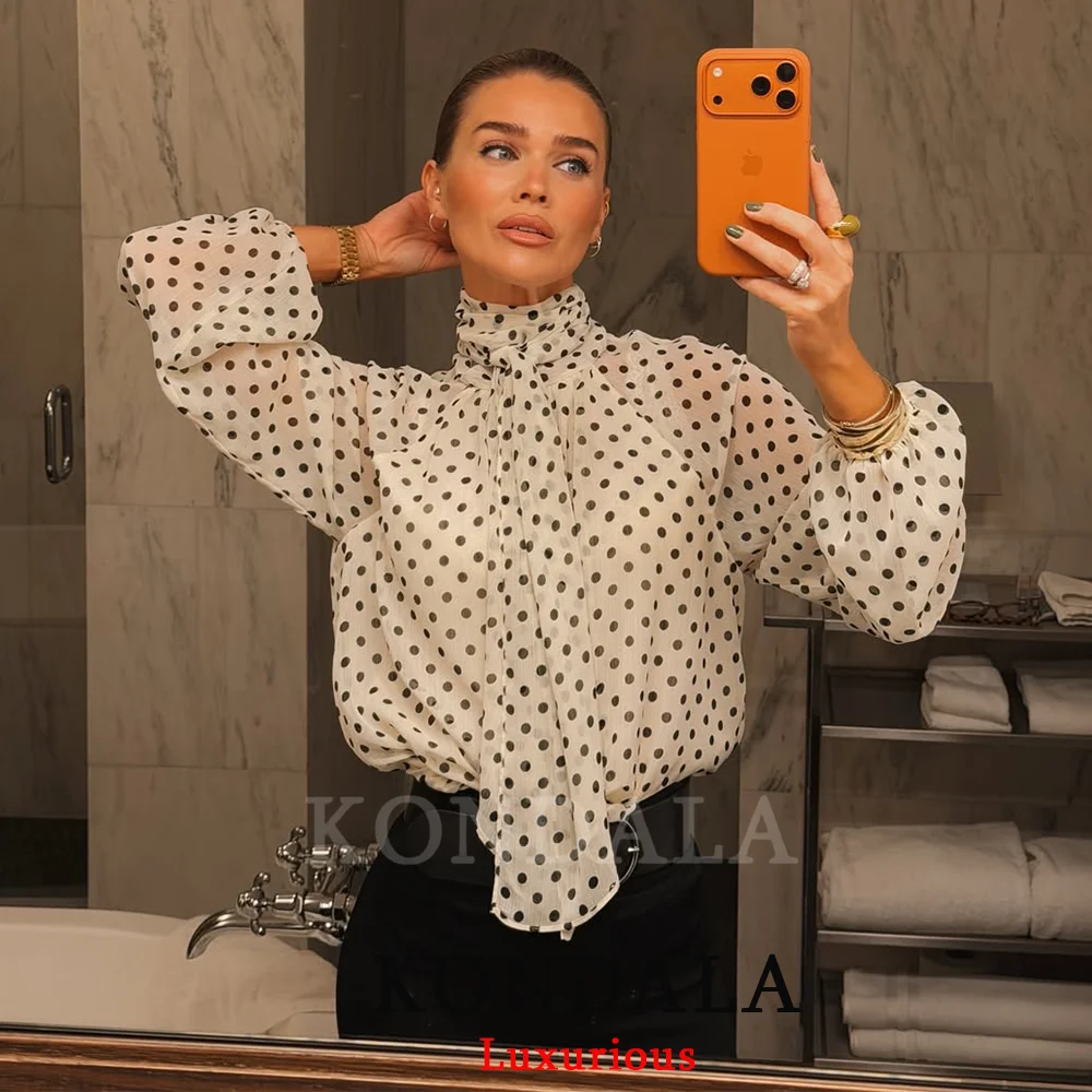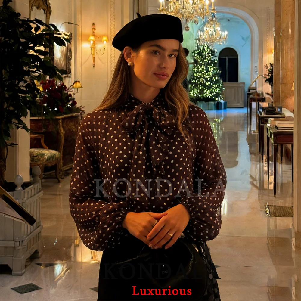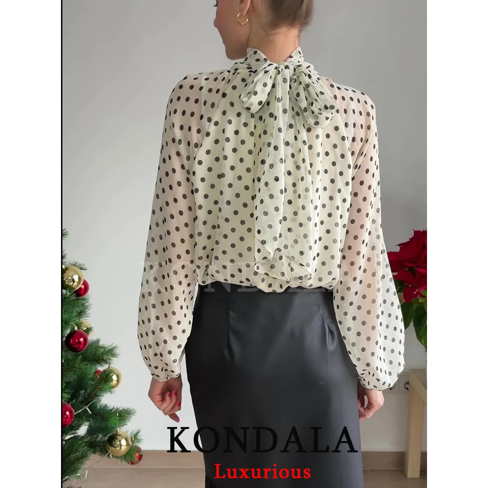 KONDALA Casual Chic Polka Dot Shirts Women Bow Tie Long Sleeve White Blouses Fashion 2026 Spring Summer Elegant Women Tops