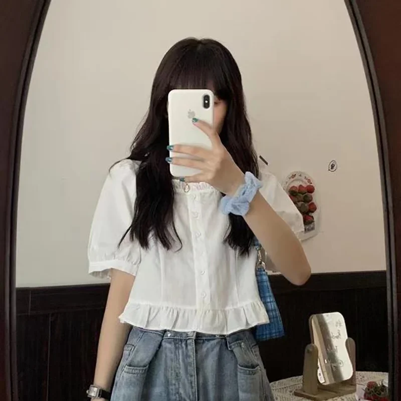 Korean Summer Ruffle Elegant Chiffon Cool Blouse Women Youthful Cute Cropped Tops Chic Short sleeve Feminine Shirt