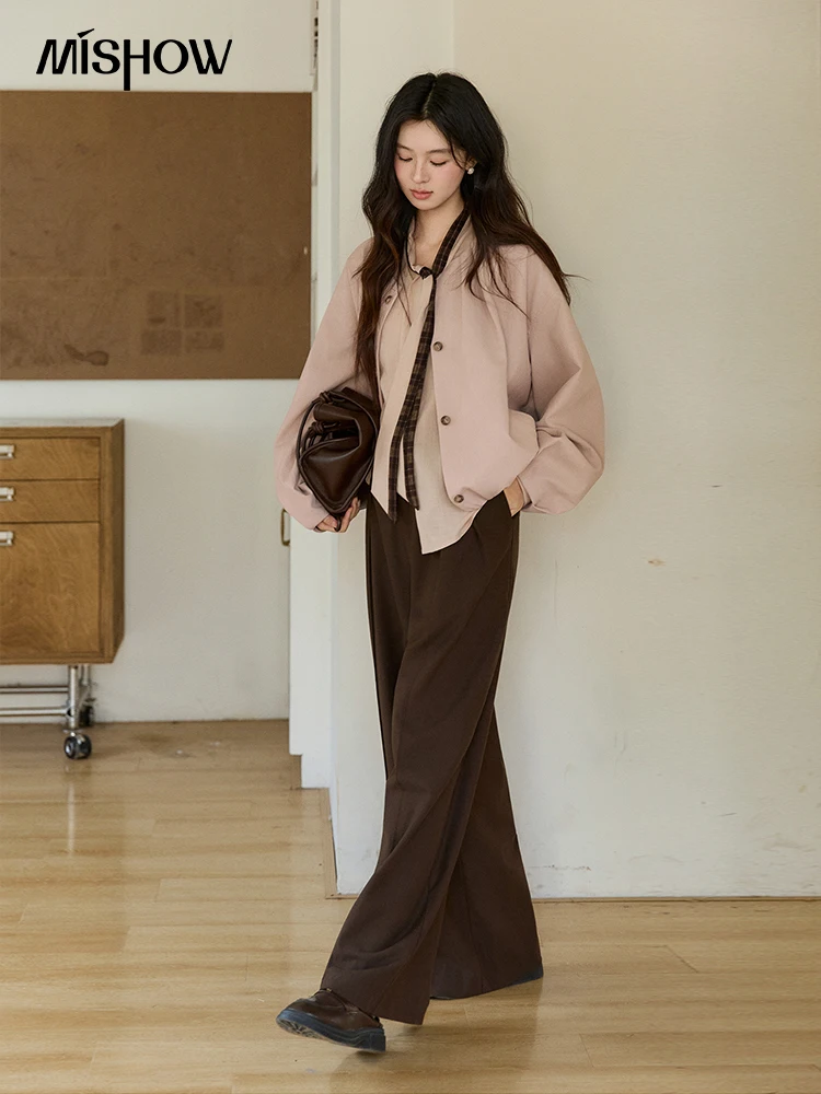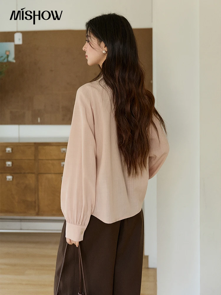 MISHOW Women's Dusty Pink Shirts Spring Plaid Tie Neck Loose Casual Shirt 100 Lyocell Lantern Sleeve Top Office Lady MXF108C0817