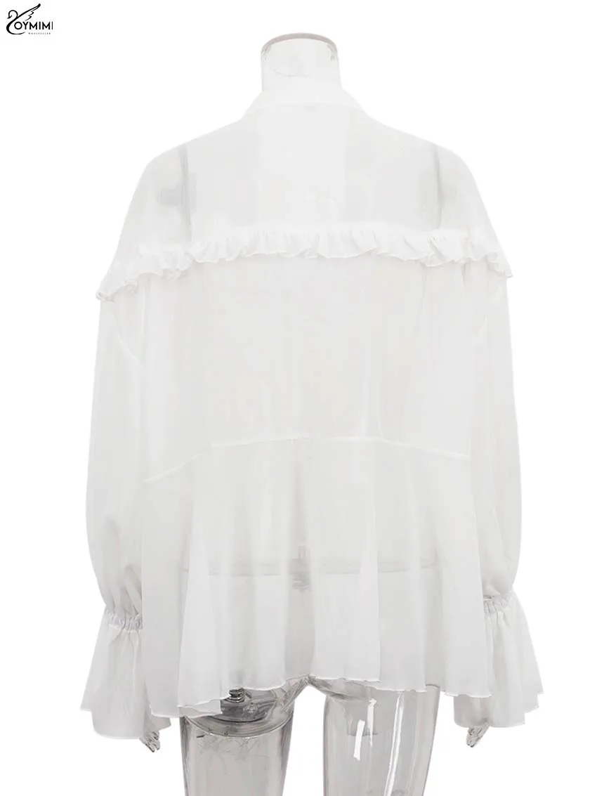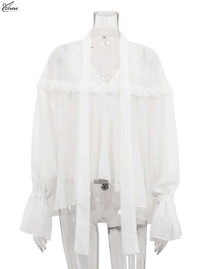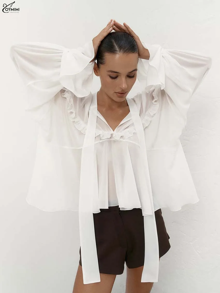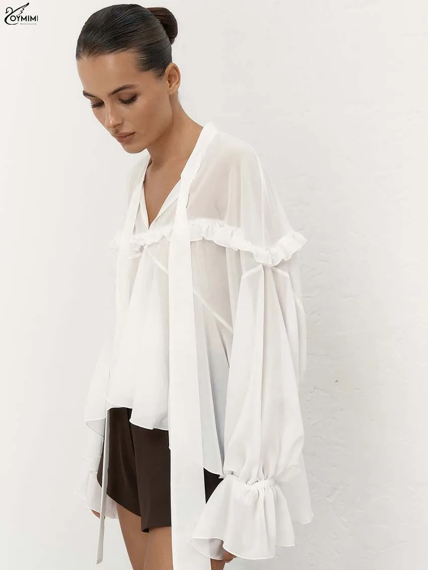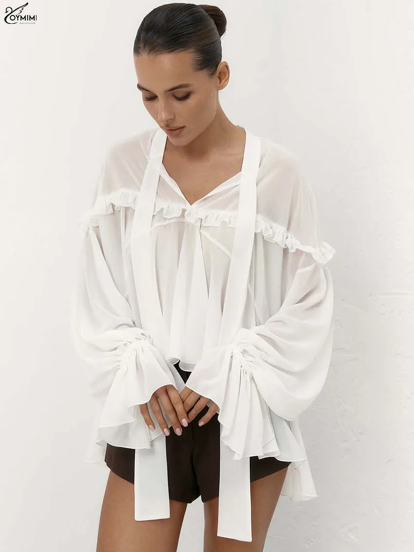 Oymimi Casual White Loose Women's Shirt Elegant Lace-Up V-Neck Long Sleeve Blouses Summer New Ruffled Pleated Blouses Female