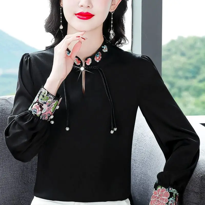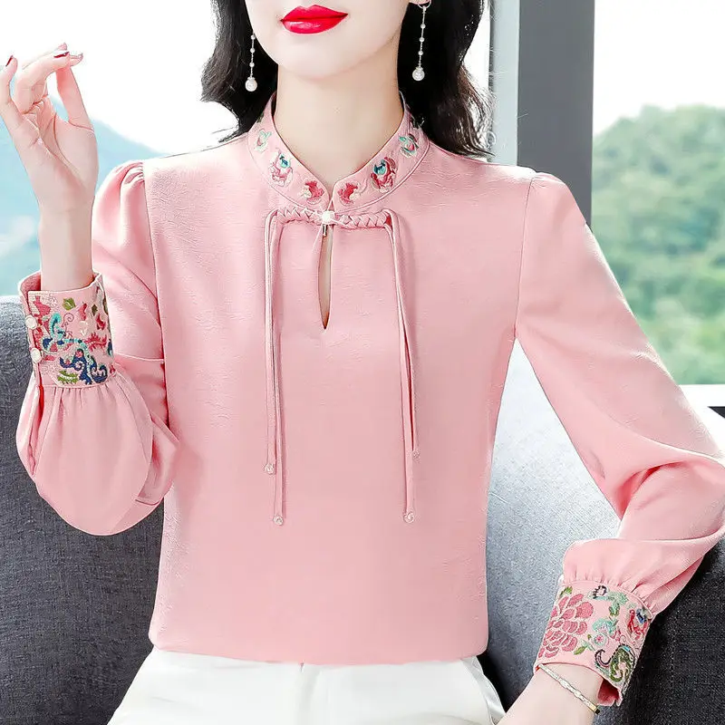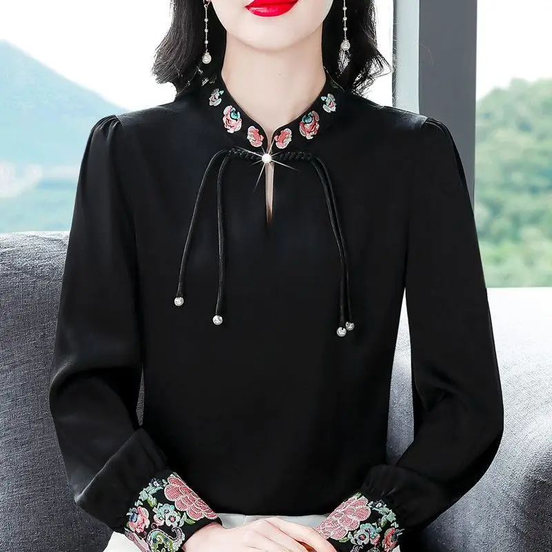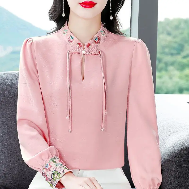 Spring Autumn New Stand Collar Long Sleeve Blouse Women High Street Embroidered Patchwork Button Pullovers Vintage Elegant Tops