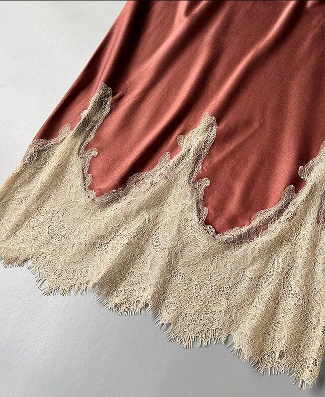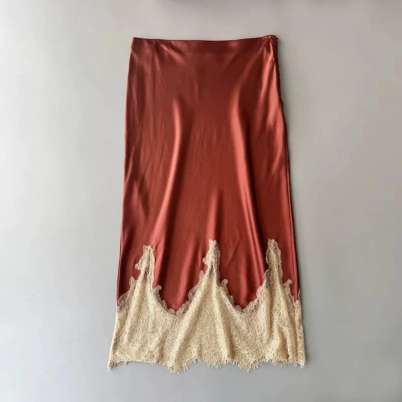 Original Summer Elegant Women Lace-Trim Midi Satin Skirt Classic Causal Patchwork Slim Long Skirt Fashion Office Lady Skirts